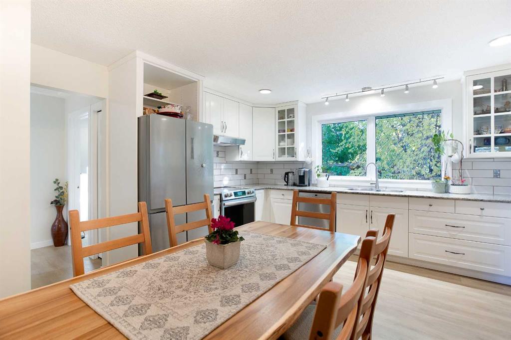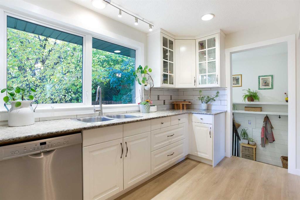 Welcome to this beautifully updated bungalow in the heart of Canyon Meadows, offering over 2,400 square feet of total living space and a backyard that feels like your own private park. From the moment you arrive, you’ll notice the incredible natural light that pours through every room and the care that’s gone into every inch of the property. Inside, the main floor opens to a bright, flowing layout with four generous bedrooms and two full bathrooms, ideal for families or guests. Wide-plank vinyl flooring runs throughout, complemented by custom wall detailing and upgraded windows. The spacious living room overlooks mature trees and leads seamlessly into a formal dining space, creating a perfect setting for family dinners or weekend entertaining. The kitchen combines charm and function with granite counters, white cabinetry, stainless steel appliances, and a cozy breakfast nook. From here, you’ll enjoy a full view of the incredible backyard—a lush, private oasis designed for relaxation and quiet evenings under the trees. Downstairs, the fully finished lower level adds over 1,300 square feet of versatile space (over 900 sq.ft of developed space). It includes a large recreation area, a fifth bedroom, a full bathroom, and a kitchenette—perfect for extended family, or guests. A spacious laundry room with side-by-side machines, sink, and countertop space makes daily chores simple and efficient. Outside, the home truly shines. The backyard features custom landscaping, two large decks, and mature greenery that offers both privacy and beauty through every season. The front yard is equally well cared for, with timeless curb appeal and established plantings that make this home stand out. The location is one of the best in the southwest. Families will appreciate being able to walk to four nearby schools, while Southcentre Mall, groceries, and restaurants are just minutes away. The Canyon Meadows C-Train Station and Fish Creek Park are both within easy reach, giving you quick access to downtown or spontaneous weekend hikes. This is a rare opportunity to own a home that offers flexibility, warmth, and a genuine connection to nature—all in one of Calgary’s most established and walkable communities.
