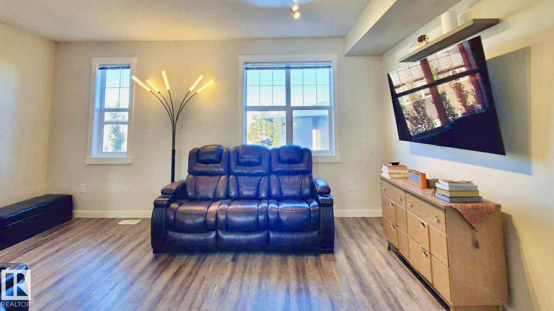 Welcome home to this lovely townhouse unit with 3 bedrooms/2.5 bathroom townhome overlooking the courtyard within the Topaz complex in Crystallina Nera West. This modern home features newer laminate flooring, 9 ft Ceilings, and a gourmet white kitchen with Granite countertops, Pantry and Big island. The open floor plan is filled with a tons of natural light from the extra windows only an end unit can offer. There is a convenient half bathroom located on main floor as well. Upstairs, you'll find a spacious primary bedroom complete with a Full ensuite, including rain shower head, and His & Hers closets. Another full bathroom by other 2 bedrooms.The main level flex space is perfect for a home office, gym, or cozy den. Double attached garage, central A/C, upstairs laundry, central vacuum, Steps to the lake, walking trails, parks and conveniently located just off the Anthony Henday Freeway/Ring-road.