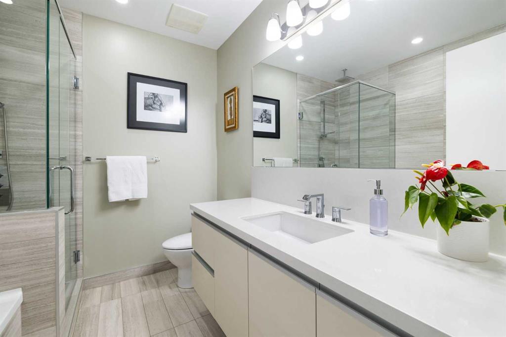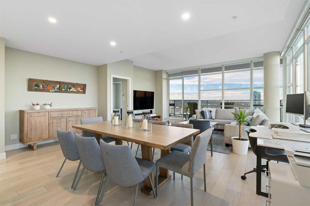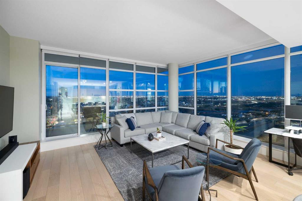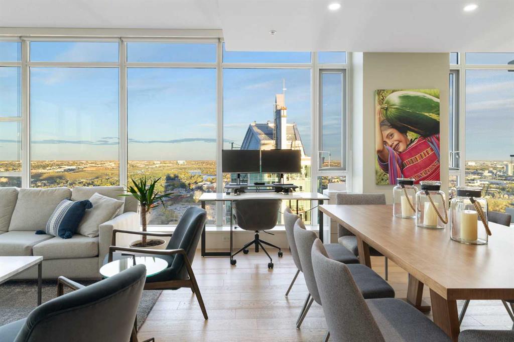 This beautiful, airy sub-penthouse in The Guardian North Tower welcomes you into a world of light and breathtaking views. Located on the 36th floor, this two-bedroom contemporary condo offers 1,260 sqft of refined urban living. The northeast corner location (one of only 4 units) on the 36th floor provides 270-degree views from the downtown skyline to the West, sweeping across to the North and wrapping all the way around to the East. Featuring floor to ceiling windows, 10-foot ceilings and terraces off the principal living spaces, the master bedroom, and the second bedroom. The main living area seamlessly flows with an open floorplan concept, and the bedrooms are ideally located for privacy and seclusion. Exceptional finishings such as engineered hardwood flooring, ceramic tiling, and blackout blinds offer comfort and luxury. Upgrades include an expansive pantry off the kitchen, and double blinds throughout offering either custom black-out or filtered light options. The living room affords downtown skyline views, and long-range views to the north and the east. Step onto the terrace through the patio doors and bring the stunning views into a spectacular perspective. Nestled between the living room and the kitchen, the dining room is elegant and offers spacious accommodation for a table of 8-10. The kitchen is a chef’s dream with Italian Armony Cucine cabinetry, a full Miele appliance package, and a large full waterfall island with seating for 4-5. Quartz counter-tops and a glass backsplash complete a stylish and beautiful kitchen that creates seamless entertaining and comfortable family living. Providing comfort with sophisticated style, the main living area and terrace are ideally suited for entertaining and modern living, all while enjoying unrivaled views, sunsets, and extraordinary downtown city lights. The primary bedroom is a tranquil retreat and offers outstanding city views, a 5-piece ensuite with double vanity, quartz countertops, and an upgraded, customized large walk-in closet. The second bedroom is optimally located on the opposite side of the floor plan and has its own 4-piece ensuite with quartz counter-tops. This bedroom also has two closet spaces with built-ins and its own private terrace with stunning east and north views, ensuring privacy and comfort for guests or family members. In-suite stacked laundry and an expansive pantry, and elegant powder room round out the living space. This unit comes with two side-by-side titled parking stalls in the underground heated parkade, in a coveted location directly opposite to elevator access. It also has an assigned storage locker, and all the amenities of The Guardian. Full-service amenities include a concierge, security, a state-of-the-art fitness facility, Residents Club, and outdoor garden terrace. Experience the convenience and excitement of living just steps away from shopping, restaurants, the new BMO Event Centre, and Pixel Park offering a dog park and sports courts, and the new Scotia Place