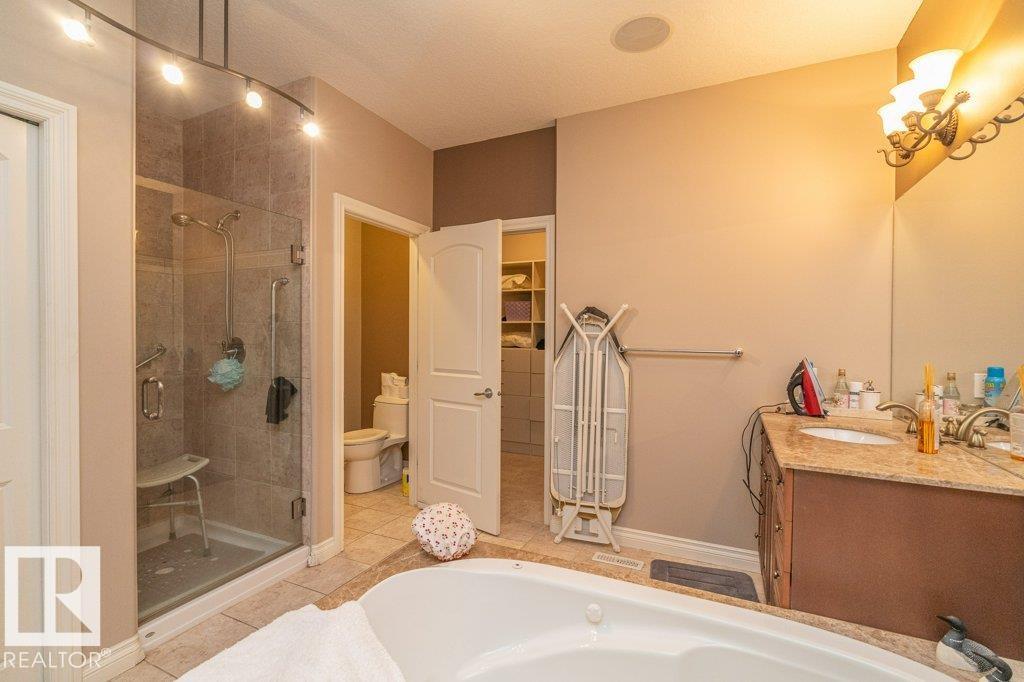 Welcome to Eagle Point at Country Club in Oleskiw, Enjoy a low-maintenance lifestyle with modern amenities in this adult-oriented gate community. This stunning bungalow features 11.5 ft soaring ceilings, a bright open-concept floor plan, and an abundance of natural light through large windows. Offering 2,087 sq. ft. on the main floor, this home includes 3 bedrooms plus a den, 2.5 bathrooms, and convenient main-floor laundry. The gourmet kitchen boasts maple cabinetry, stainless steel appliances, ample counter space, and a walk-in pantry. The dining area flows into a spacious living room with a gas fireplace, while the primary suite offers a 5-piece ensuite with a Jacuzzi and walk-in closet. The fully finished basement showcases high ceilings, a wet bar, a large recreation room, two additional bedrooms, a 3-piece bath, and a sauna for relaxation. Additional highlights include a triple heated garage, air conditioning, central vacuum system, and a water softener. Property Sold As-Is.