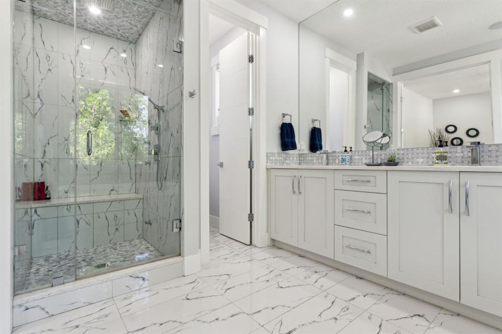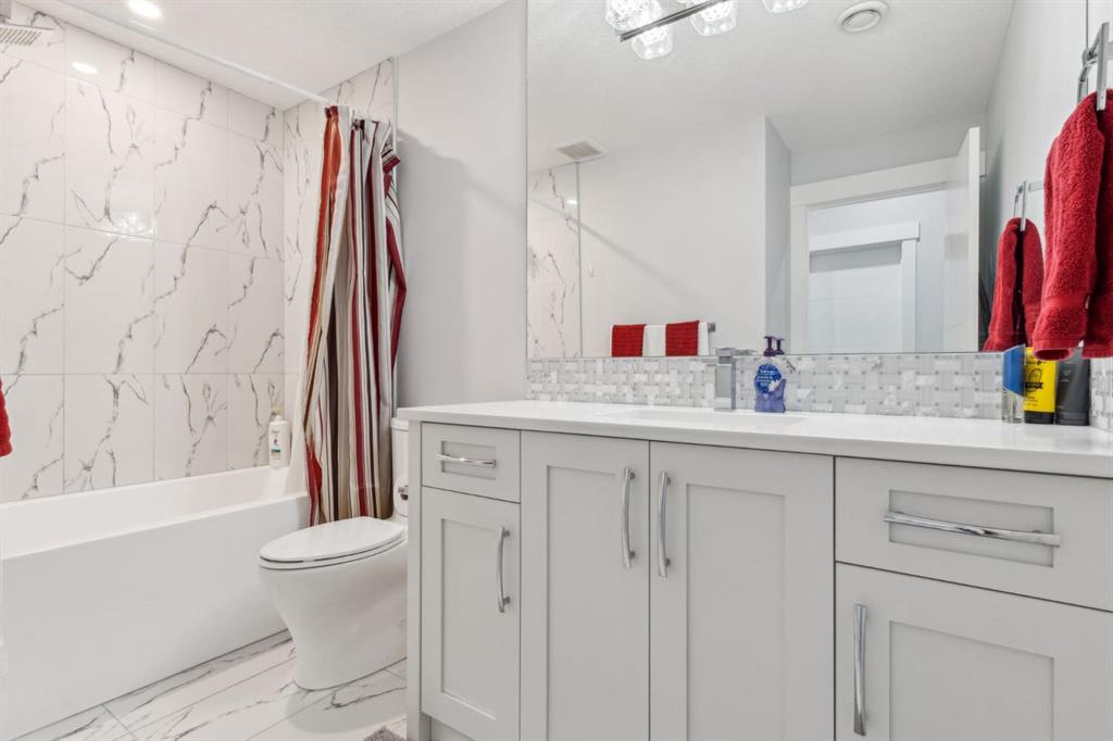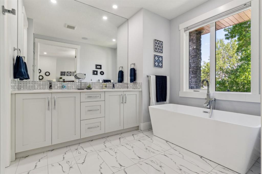 Boasting over 3,300 developed sq ft this impeccable DETACHED home is situated on a quiet picturesque, tree-lined street. As you approach you will notice the masterfully crafted curb appeal, exposed aggregate walkway and attention to detail. You are then greeted by soaring 10-foot ceilings, gleaming hardwood floors and a bright dining room. The central gourmet kitchen is a focal point with custom cabinets that reach to the ceiling, including pull outs and glass inserts, gorgeous 2 ¼” Quartz counters, under cabinet lights, plenty of storage with a corner pantry, and high-end SS appliances including a gas cooktop, built-in wall oven/microwave, chimney style hood fan and Bosh dishwasher. The expansive 10 ft island is ideal for entertaining and seamlessly connects to the spacious living room. The spacious living area is showcases a gas fireplace with stone surround and a built in detail. The main is complete with the powder room tucked away for privacy and a well thought out mud room with custom built-ins. The private well sized SUNNY WEST backyard has plenty of grass, an exposed aggregate patio and path plus a convenient BBQ gas line. Making it the perfect place to enjoy the outdoors. As you head to the second level you will notice the elegant railing, and 9’ ceilings. There are 2 well sized bedrooms with walk-in closets including custom built-ins, a nicely appointed 4 piece bath, and a convenient upper laundry room with sink and plenty of cabinets for storage. The primary is a true sanctuary with large windows, a private balcony to enjoy morning coffees, and a big walk-in closet with built-ins. French doors lead to your luxurious ensuite. This spa inspired space includes heated tile floors, a steam shower, freestanding tub, a private water closet, dual sinks and comfort height stone counters. The fully developed lower level with in SLAB HEAT, is fabulous for those Alberta winters. There is a large rec room showcasing a projector and 100 inch screen with custom cabinetry, perfect for movie night or your favorite sporting events. This space is complete with a sleek wet bar including beverage fridge. An additional fourth bedroom with walk in closet and a full 4-piece bathroom. Other noteworthy features are the Double detached garage with 220 wiring, the comforts of air conditioning, upgraded solid core doors, flush mount vents, built in speaker system, security cameras, upgraded roof with full ice and water shield membrane, upgraded roof ventilation and added R50 blown insulation creating energy efficiencies. Just minutes from excellent schools, athletic fields, and Westhills Shopping Centre, including Save-On-Foods, GoodLife Fitness, Cineplex, The Keg, Tim Hortons, and much more. Enjoy quick access to Stoney Trail, Sarcee Trail, and downtown. Don’t miss your chance to own this pristine home. View the virtual tour or book your private showing today!