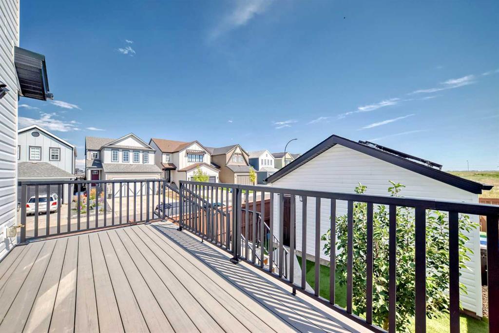 Welcome to this stunning former showhome, with 3 bedrooms, and fully finished basement, with 2021 sq ft of developed living space thoughtfully designed and spread across three beautifully finished levels, situated on a desirable corner lot. This home features large windows that fill the space with natural light, and a wonderfully modern layout. On the main level, you'll find a immaculate kitchen with granite countertops, a central island, and a spacious dining area, perfect for family meals and entertaining. From here, a door leads directly to the back deck and the meticulously landscaped backyard, complete with an 8'x18' deck and a full lawn sprinkler system, and double detached garage. The lower level offers a cozy yet spacious living room anchored by an electric fireplace, along with a versatile den or office. Upstairs, you’ll find two generously sized bedrooms, including a primary suite featuring a walk-in closet with a custom PAX wardrobe system. The fully finished basement adds even more living space with bedroom, 4 piece bathroom and large family room ideal for a media room, home gym, or play area. With its combination of thoughtful design, energy efficiency, and premium finishes, this is a move-in-ready home that truly stands out. This home is packed with upgrades, including 19 solar panels, smart switches throughout, Hunter Douglas blinds, glass railings, and gemstone exterior lighting for year-round curb appeal. Stay comfortable year-round with central air conditioning and enjoy the convenience of a heated double detached garage with an EV plug-in. This home is located in Rangeview. It is a vibrant community built around garden-to-table living. With gardens, orchards, and greenhouses alongside parks, pathways, and gathering places, it fosters a connected and healthy lifestyle. Conveniently located near a movie theatre and the world’s largest YMCA, Rangeview blends modern amenities with nature-inspired living. Don't miss this one, book your showing today!