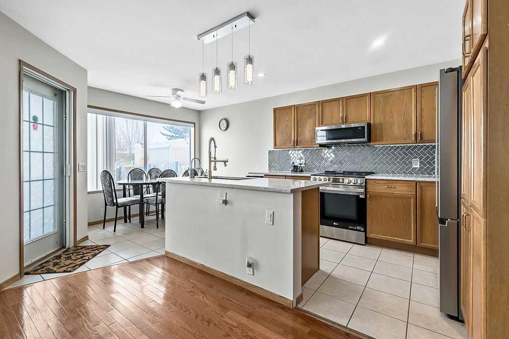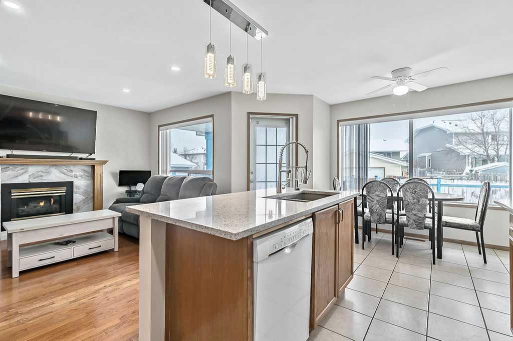 Beautifully maintained two storey family home offering over 2,150 sq. ft. of developed living space and FOUR BEDROOMS. The main floor features a bright and inviting layout, highlighted by a spacious family room filled with lots of natural light, an open concept kitchen designed for both everyday living and entertaining, showcasing quartz countertops, a stylish backsplash, newer UPGRADED FRIDGE AND STOVE, and a reverse osmosis water system. The generous dining area includes a garden door leading to the covered rear deck, patio and large fully fenced backyard - ideal for children, pets and summer gatherings. Ceramic tile and hardwood flooring throughout the main level add warmth and durability. A convenient den/office completes this level, perfect for remote work or study. Upstairs, all bedrooms are generously sized. The primary suite offers a walk-in closet and a private 3 piece ensuite. The fully finished basement expands your living space with a spacious family room, fourth bedroom, a 4 piece bath, and a full kitchenette - an excellent setup for extended family, guests, or multi-generational living. Significant recent upgrades include a HEAT PUMP, FURNACE AND TANKLESS HOT WATER SYSTEM (ALL INSTALLED IN 2024), along with a roof approximately 10 yrs old. These improvements enhance efficiency and provide confidence and peace of mind. A front attached garage and driveway offer ample parking and storage. The exterior custom programmable lighting is a great extra bonus. Situated in a welcoming, family friendly neighbourhood, this move in ready home is the complete package - space, upgrades and thoughtful design all in one exceptional property.