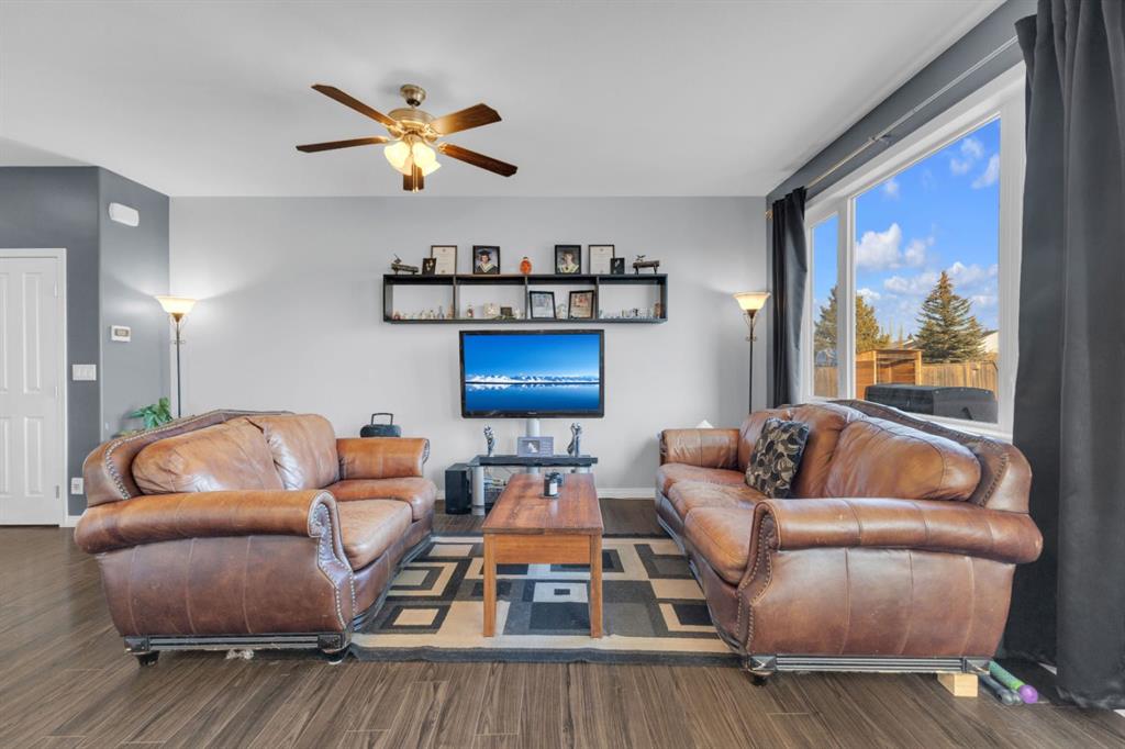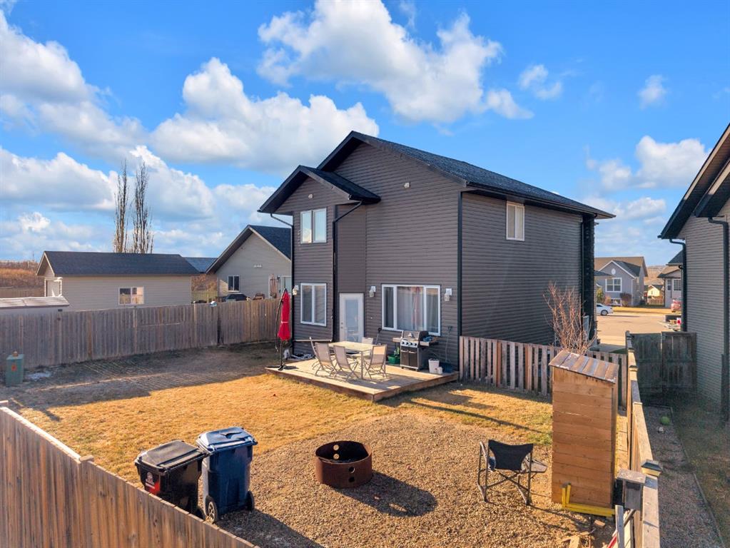 Step into this original-owner 2-storey residence situated on a generous 4,886 sq ft pie shaped lot backing onto a park in the desirable “Rolling Hills” neighbourhood of Blackfalds. The main level features a bright foyer with soaring high ceilings, and an open-concept layout that flows seamlessly from the kitchen into the dining and living areas. Large windows flood the space with natural light, while the modern colour palette lends a fresh, clean feel. The well appointed kitchen boasts cabinetry, island workspace, pantry, and direct access to the yard, perfect for entertaining or family living. A convenient powder room rounds out the main floor. Upstairs, you’ll find three spacious bedrooms and two full bathrooms arranged in a smart, split-floor fashion that creates separation between the master suite and the additional sleeping areas. The master suite includes a walk-in closet and its own ensuite. The unfinished full basement presents excellent potential for future development design your ideal recreation room, extra bedrooms or home office. The attached two-car heated garage with 12 foot ceilings adds year-round comfort, and central air ensures cool summers. Outside find a private backyard that backs onto a park and a deck with gas bbq. Located close to schools, the commuinty skate park, biking track and the acclaimed Abbey Center.