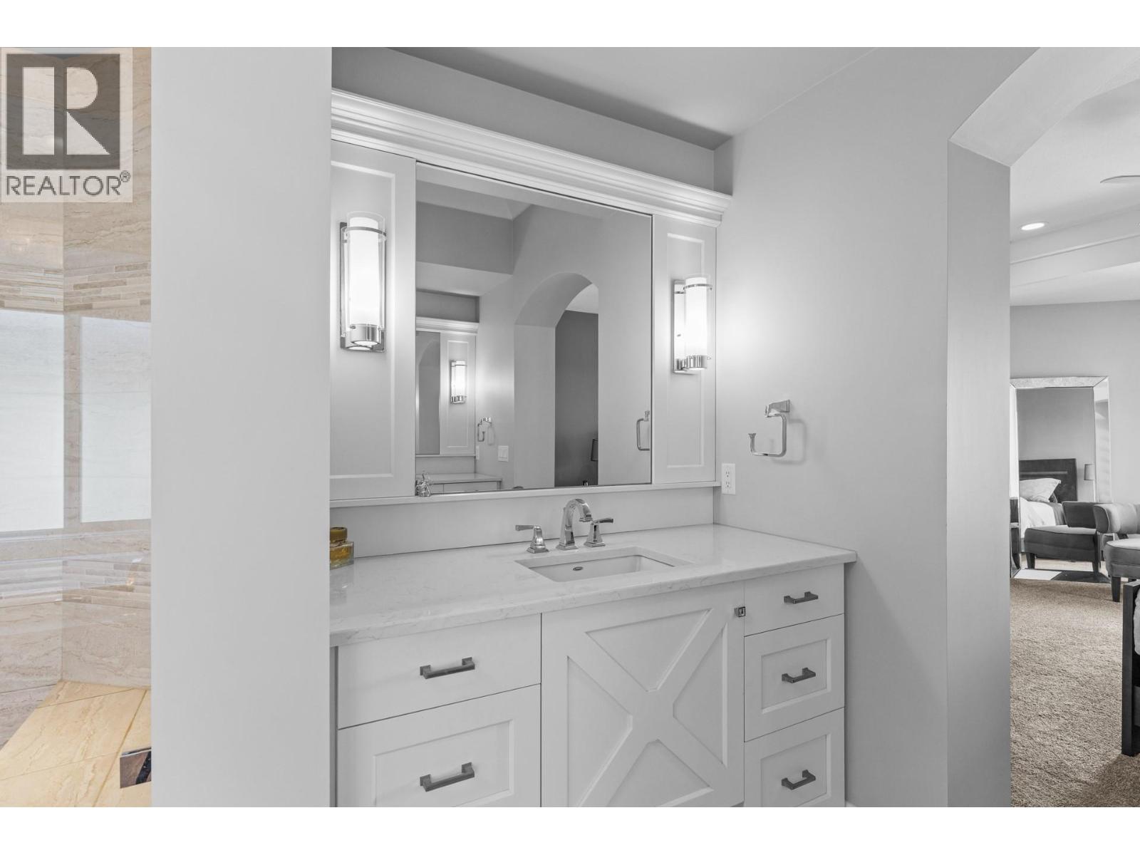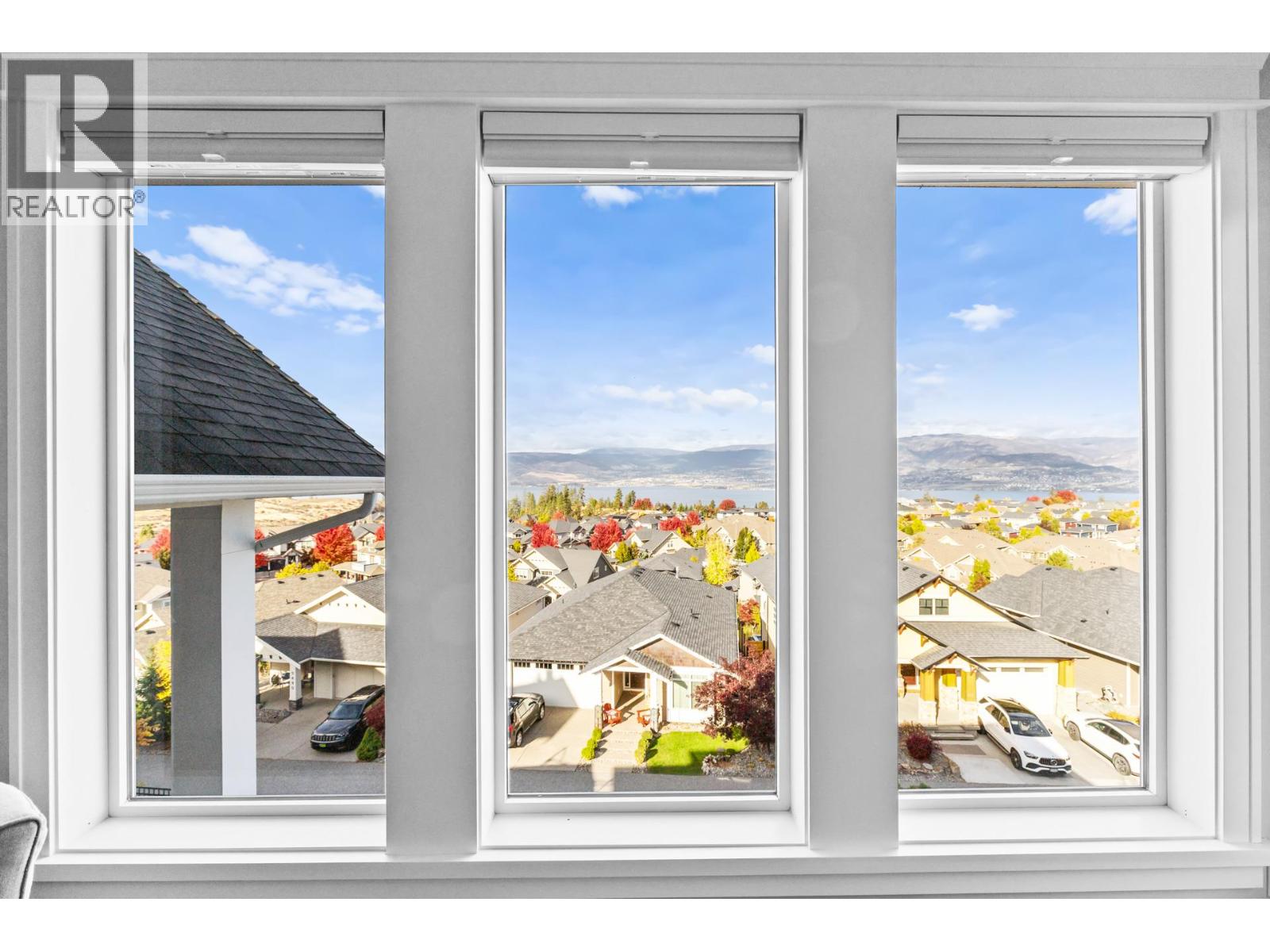This massive, beautifully designed 6-bedroom, 5-bath, 5,350sq. ft. luxury residence is at the end of a flat, quiet family oriented cul-de-sac showcasing breathtaking lake views from all three levels and features an inground saltwater pool. This home perfectly blends craftsman charm with modern contemporary elegance. The inviting entry features a solid wood door and hand-scraped engineered hardwood floors, leading to a dramatic two-story great room with a balcony overlook and concrete feature fireplace. The open-concept kitchen is a chef’s dream with duotone cabinetry, granite countertops, raised eating bar, gas stove, built-in oven, and a walk-through butler’s pantry. Also on the main floor are a den/office, powder room, and a secondary master suite with 4-piece ensuite. Off the kitchen, step out to a spacious covered deck with topless glass railings, outdoor gas fireplace, electric privacy screens, and ample space to relax and enjoy the panoramic views. The upper level with two generous bedrooms sharing a Jack & Jill bath, a bonus room or extra bedroom, and a spectacular primary suite featuring a spa-inspired ensuite, custom walk-in closet, and direct access to laundry. The lower level features a wine cellar, wet bar, games room, theater, and a fifth bedroom with full bath. A huge oversized double garage offers ample space for vehicles and recreational gear. Located in prestigious Kettle Valley, at the end of a flat, family-friendly cul-de-sac perfect for kids. Amazing home!