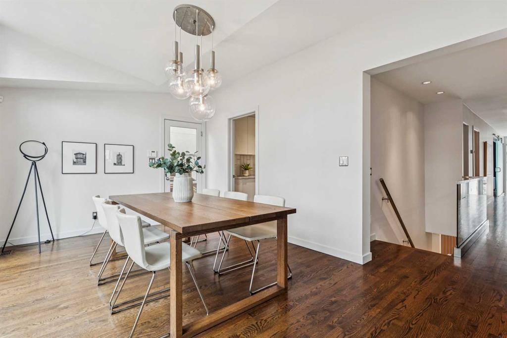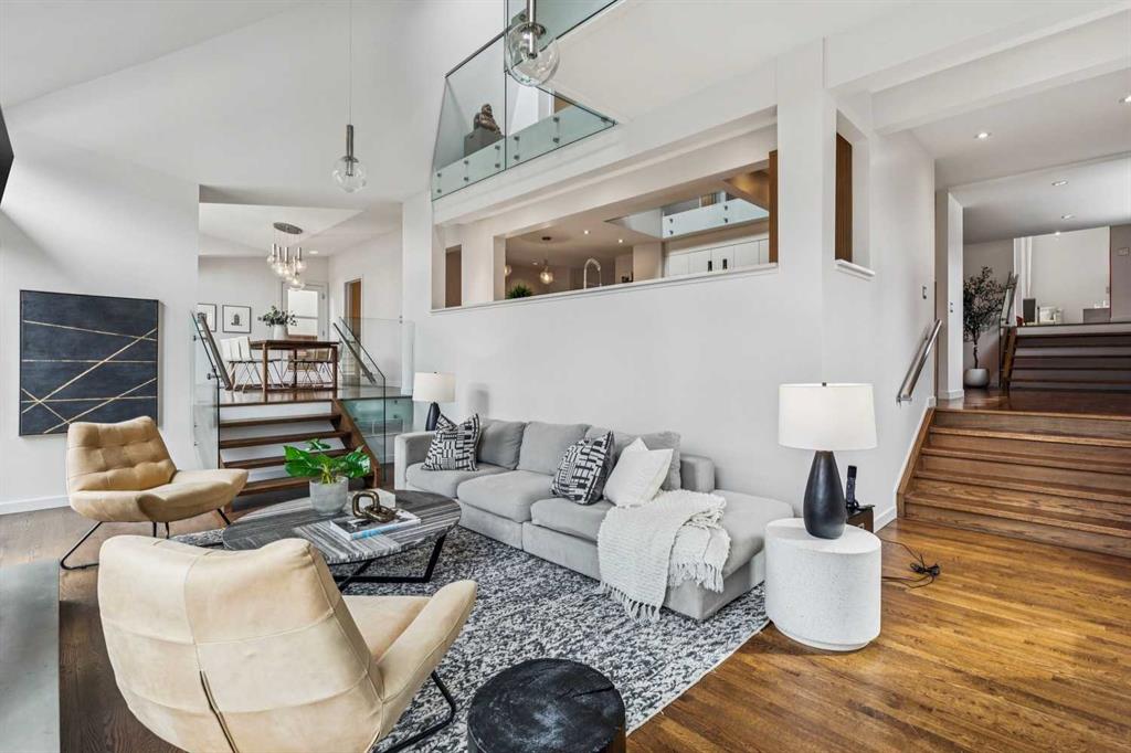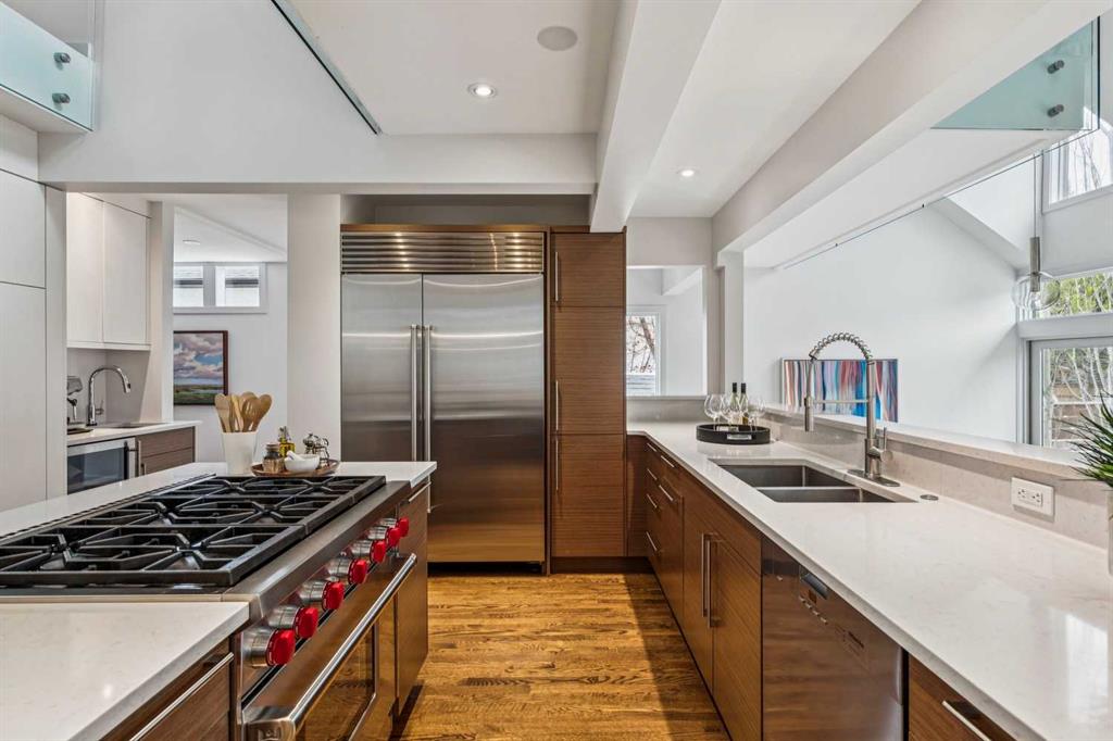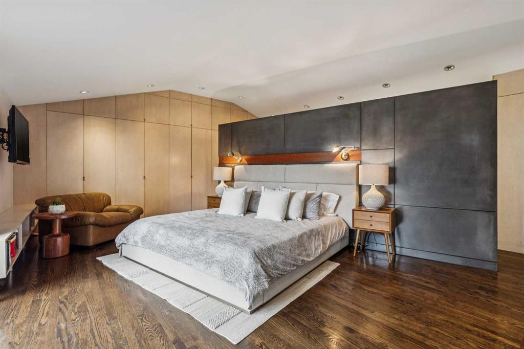 Open house Saturday April 25 2:30–4 pm. One of a kind two story executive family home in prime East Elbow Park location offering over 4000 square feet above grade, a total of 5 bedrooms, double attached garage + beautiful sunny west facing backyard. This modernist home features an intriguing layout + expansive principal rooms throughout. The elevated living room showcases soaring ceilings + a striking concrete framed wood-burning fireplace, while the formal dining room provides an impressive space for entertaining. At the front of the home, a comfortable self-contained sitting room/den with sliding glass doors offers a private designated space away from the hub of the house. The chef’s kitchen, renovated approximately 10 years ago, is well laid out with professional appliance, an island, abundant storage + overlooks the sunken family room which along with the large informal dining area are filled with natural light from a wall of windows + patio doors that open onto the private west facing backyard complete with deck + mature trees. To complete the main floor there is a cheery laundry room with added storage + an added feature of a main floor bedroom with easy access to a 3-piece bath that adds versatility to the property. Upstairs, four generously sized bedrooms are all ensuited . The primary suite is a standout with a floating concrete + cherry wall, an efficient closet system, a well-appointed ensuite + its own private office space. The exterior offers strong contemporary curb appeal with newer finishes completed in 2024 + a welcoming glass entry. Additional features include a double heated attached garage with epoxy flooring, large mudroom with extra storage, developed lower level (renovated in 2024) + newer rear windows. Ideally located on a very quiet street that is within walking distance to all levels of schools, 4th Street shopping, the pathway system + the Glencoe Club. A rare opportunity to own a distinctive architectural home in one of Calgary’s most sought-after neighborhoods.