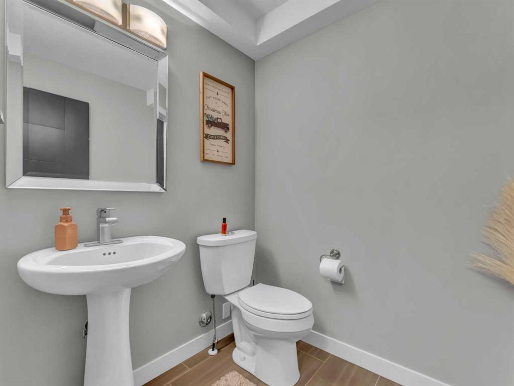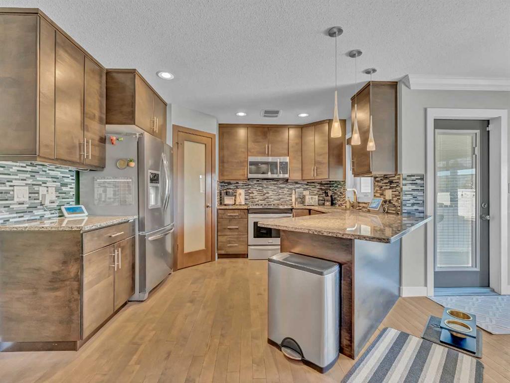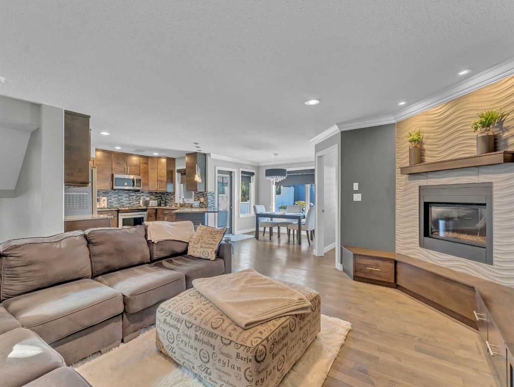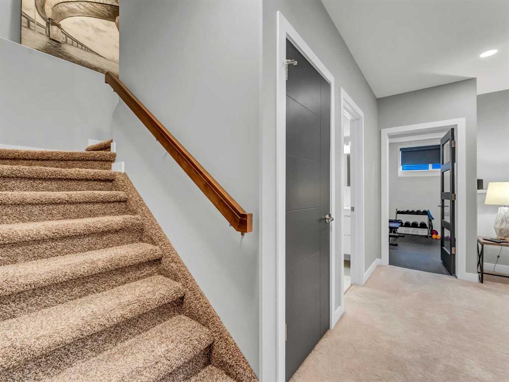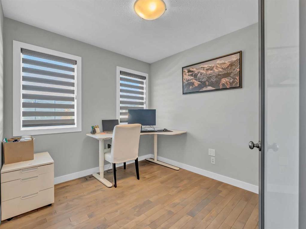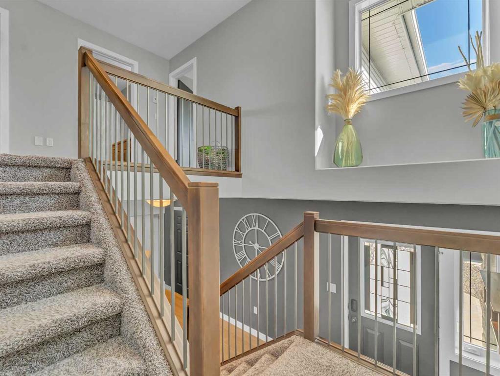Thoughtful details throughout this home create a warm and inviting atmosphere, starting with the real hardwood flooring that flows seamlessly across the main floor. The entry way is the perfect welcome into the home, its bright and inviting. The open-concept living space is filled with natural light from large windows and includes a conveniently located main floor office—perfect for staying connected with family while working or enjoying views of the lovely backyard. The kitchen showcases custom details, modern yet warm finishes, a peninsula feature with eat up seating, a corner pantry, and stainless steel appliances, making it both stylish and functional . The living room is a cozy focal point with built-in cabinetry and stunning tile work surrounding the gas fireplace. Upstairs you’ll find three well-sized bedrooms and a conveniently located laundry room complete with sink and cabinetry—right where all the laundry happens! The primary bedroom features a walk-in closet with a window and built in features, and a private ensuite with a relaxing soaker tub, double sinks and a walk in shower. The bright and welcoming basement offers a spacious family room, a beautifully done bathroom, and a dedicated gym area. This space could easily be converted into a fourth bedroom if desired. Outside, enjoy the fantastic backyard featuring a good size concrete patio, and a hot tub - perfect for relaxing or entertaining. There is a small BBQ deck off the inside dining space with a gas hook up as well. The yard is fully fenced, there are underground sprinklers front and back with a shed for extra exterior storage. The double attached, heated garage is another great feature of this property, and the concrete front drive partners well to allow for ample parking. This home is centrally located with two great playgrounds within close walking distance, and large greenspaces and schools, and other desirable amenities just a stones throw away.