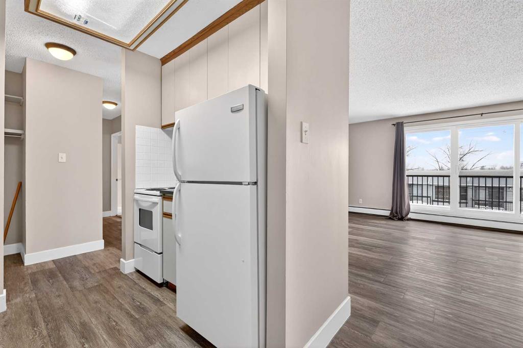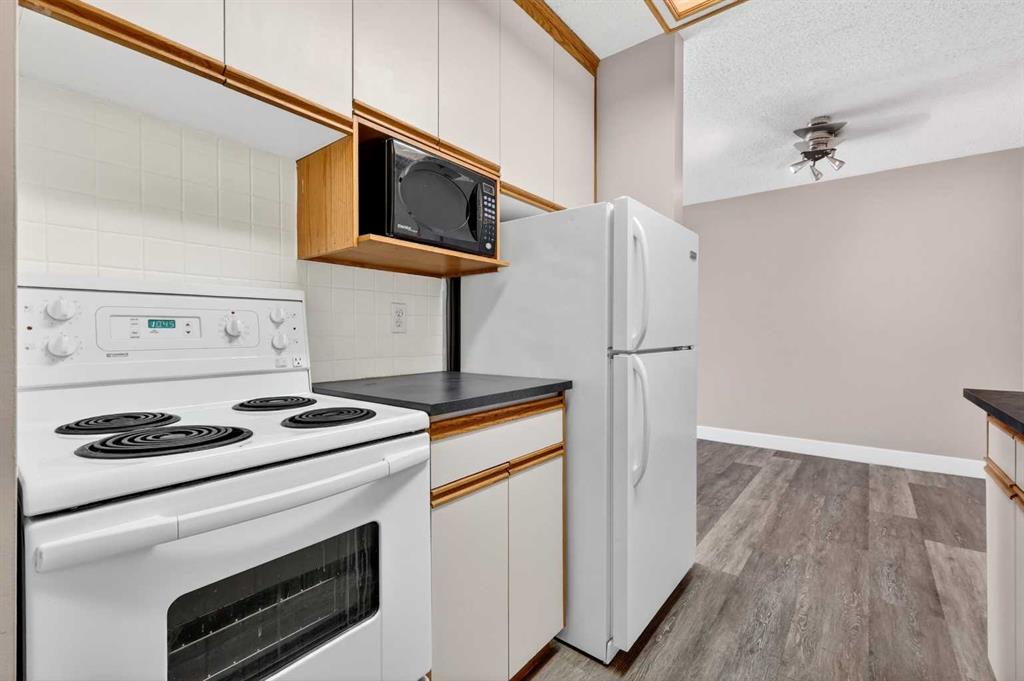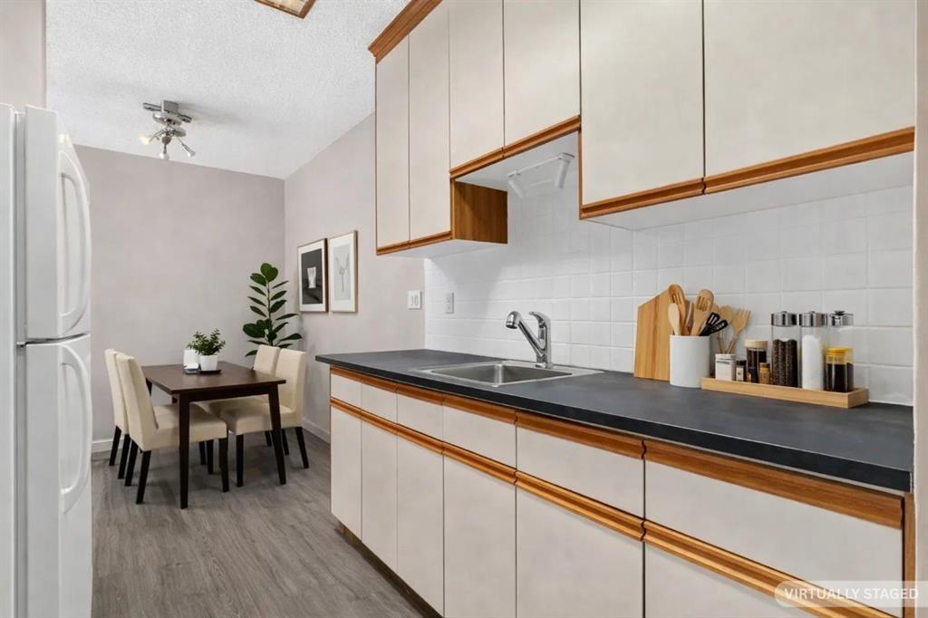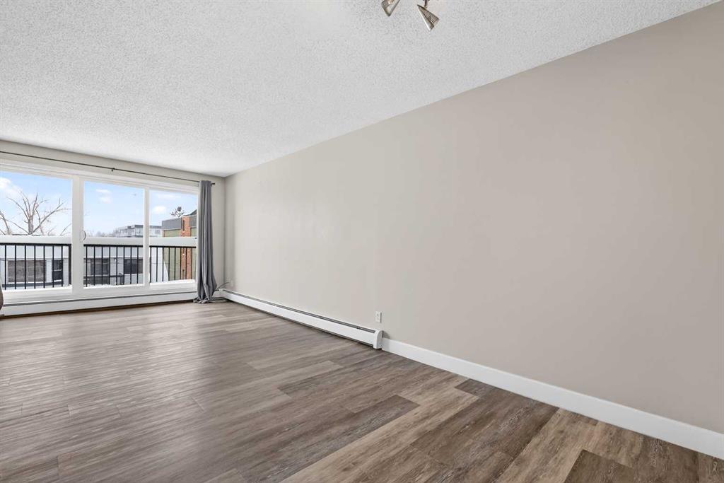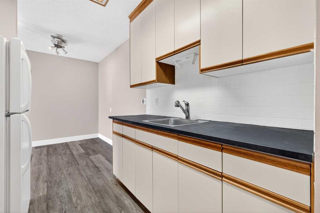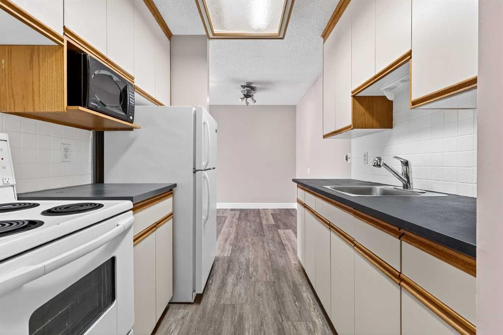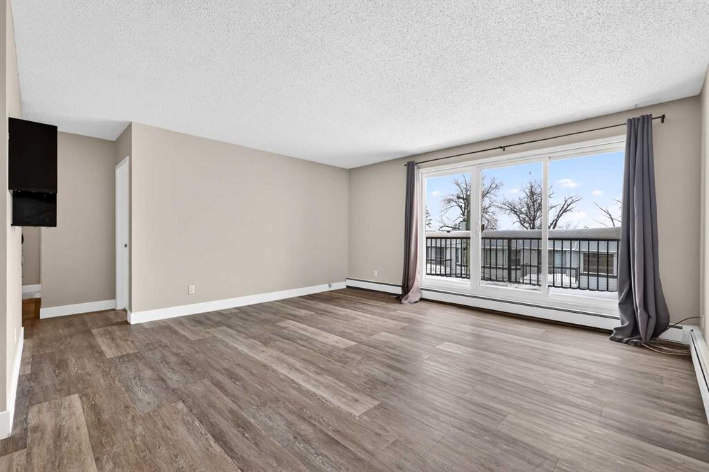 Step into a home defined by light and space. The open-concept layout immediately draws you into a spacious kitchen and living area, grounded by modern LVP flooring and accented by the organic warmth of real wood countertops. Whether you're prepping a meal or hosting friends, the kitchen feels like the heart of the home, offering plenty of prep space and a natural flow into the living room. Tucked away for maximum privacy are two well-proportioned bedrooms featuring soft carpeting for a cozy, quiet feel. The bathroom has been thoughtfully refreshed with updated tile work around the bathtub, adding a crisp, clean finish to your daily routine. Throughout the home, smart storage solutions and dedicated closets ensure everything has its place, keeping your living area open and clutter-free. The living space extends through glass doors onto a massive, south-facing balcony. Flooded with natural light all day long, it’s the perfect spot for your morning coffee or an evening glass of wine, overlooking a peaceful, tree-lined neighborhood. Peace and quiet meet ultimate convenience. You are just a minute’s walk from the Elbow River pathways, yet minutes away from the inner-city buzz, major shopping malls, and the LRT for an effortless commute. This unit comes complete with an assigned parking stall (#9), though in a location this walkable, you might find your car stays parked more often than not. It’s rare to find a home that offers both a quiet, nature-side retreat and "minutes-to-everything" convenience. Don’t just look at the photos—come stand on that south-facing balcony and feel the peace for yourself. Book your private showing today.