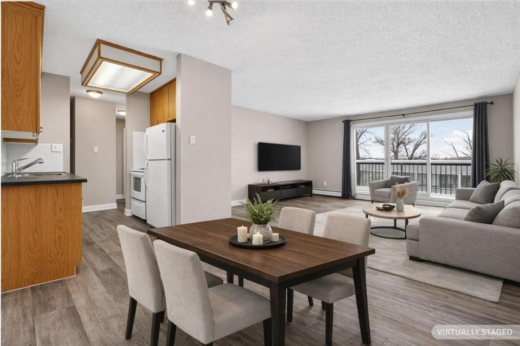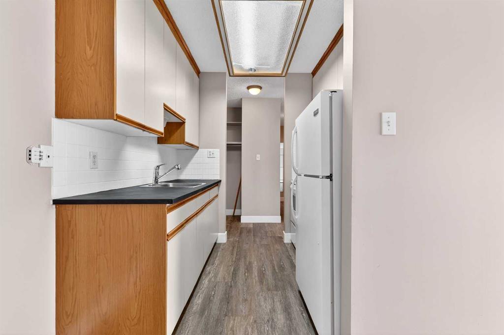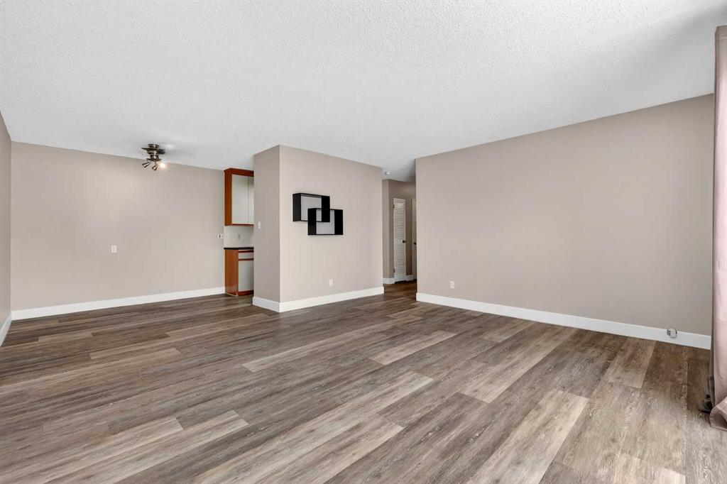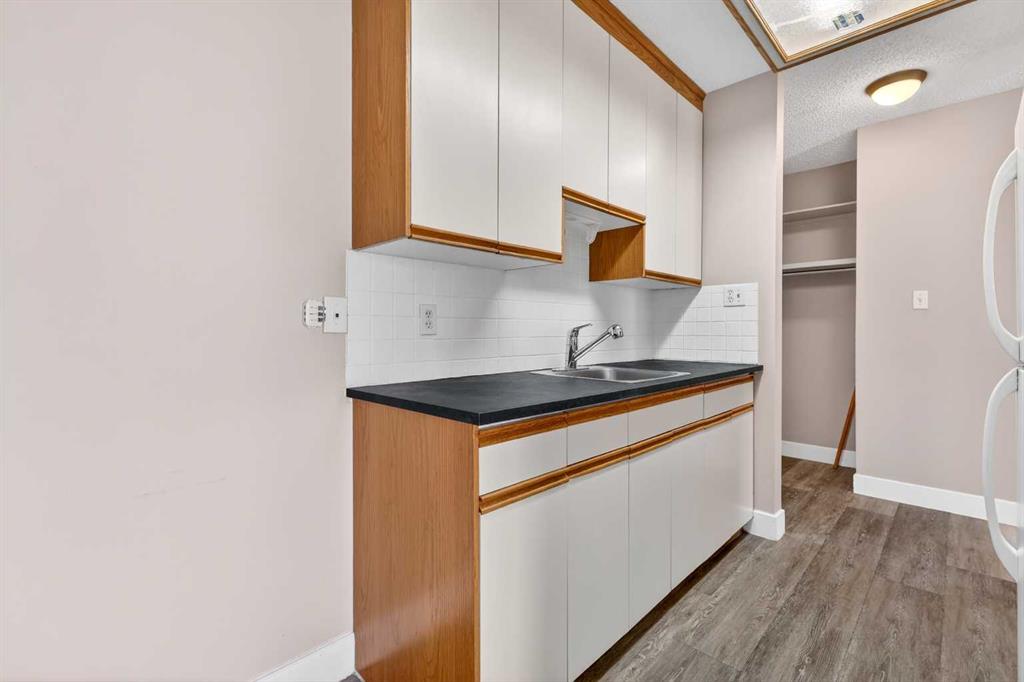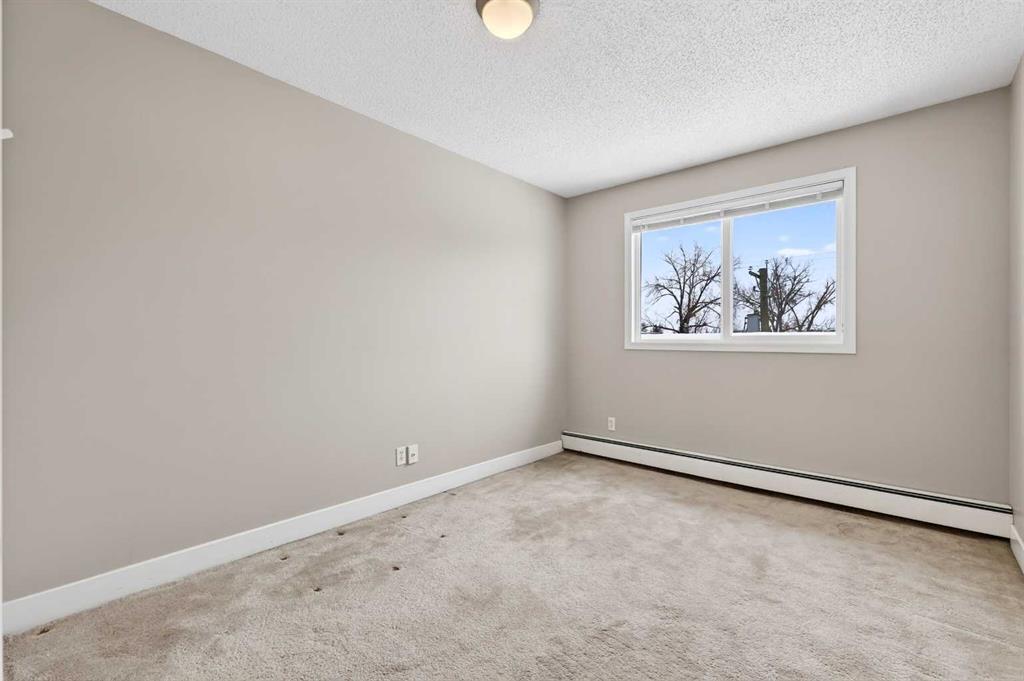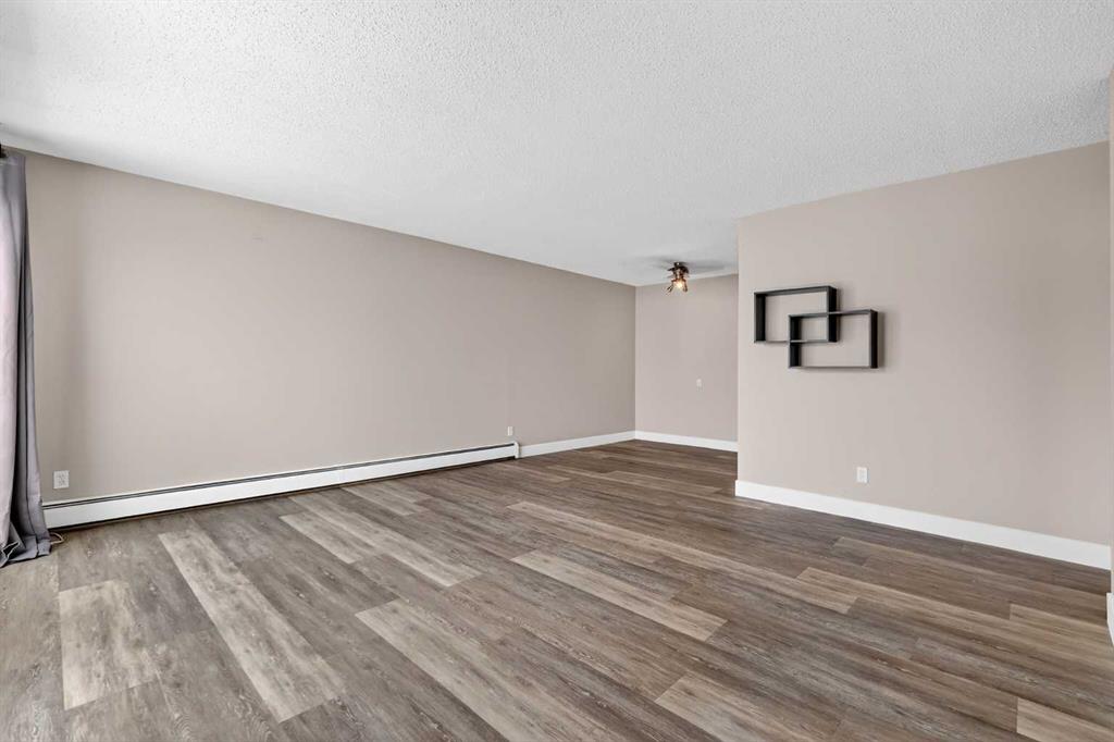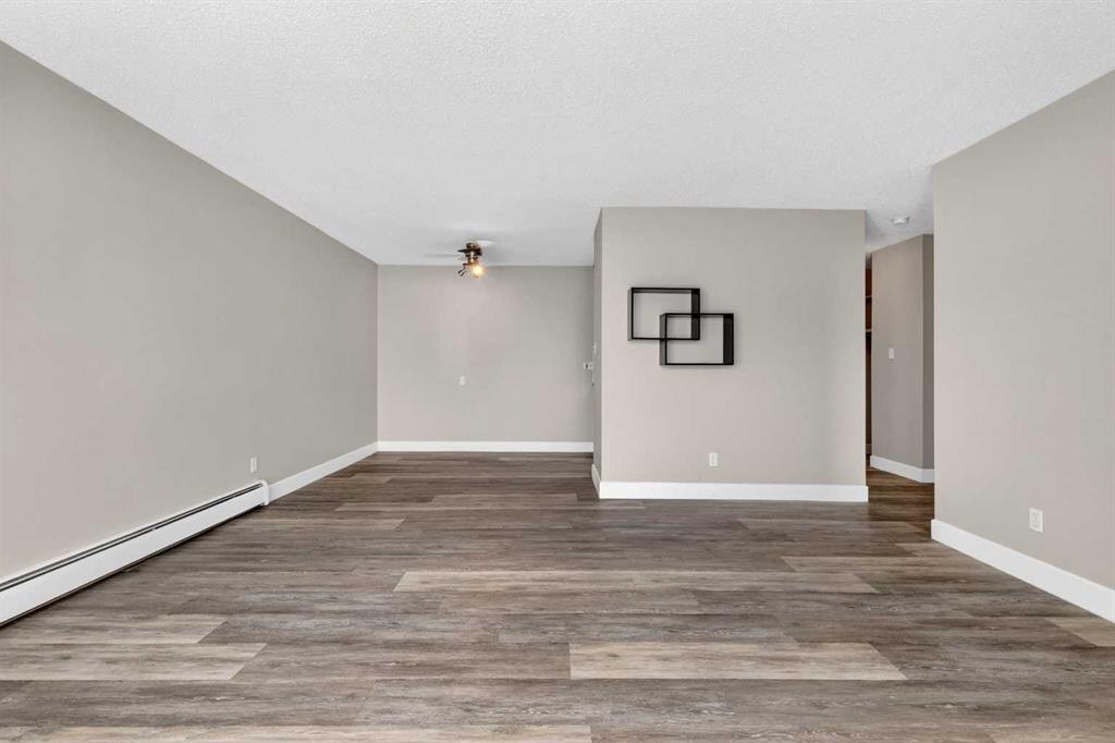 Step into a home defined by light and space. The open-concept layout immediately draws you into a spacious kitchen and living area, grounded by modern LVP flooring and accented by the organic warmth of real wood countertops. Whether you're prepping a meal or hosting friends, the kitchen feels like the heart of the home, offering plenty of prep space and a natural flow into the living room. Tucked away for maximum privacy are two well-proportioned bedrooms featuring soft carpeting for a cozy, quiet feel. The bathroom has been thoughtfully refreshed with updated tile work around the bathtub, adding a crisp, clean finish to your daily routine. Throughout the home, smart storage solutions and dedicated closets ensure everything has its place, keeping your living area open and clutter-free. The living space extends through glass doors onto a massive, south-facing balcony. Flooded with natural light all day long, it’s the perfect spot for your morning coffee or an evening glass of wine, overlooking a peaceful, tree-lined neighborhood. Peace and quiet meet ultimate convenience. You are just a minute’s walk from the Elbow River pathways, yet minutes away from the inner-city buzz, major shopping malls, and the LRT for an effortless commute. This unit comes complete with an assigned parking stall (#9), though in a location this walkable, you might find your car stays parked more often than not. It’s rare to find a home that offers both a quiet, nature-side retreat and "minutes-to-everything" convenience. Don’t just look at the photos—come stand on that south-facing balcony and feel the peace for yourself. Book your private showing today.