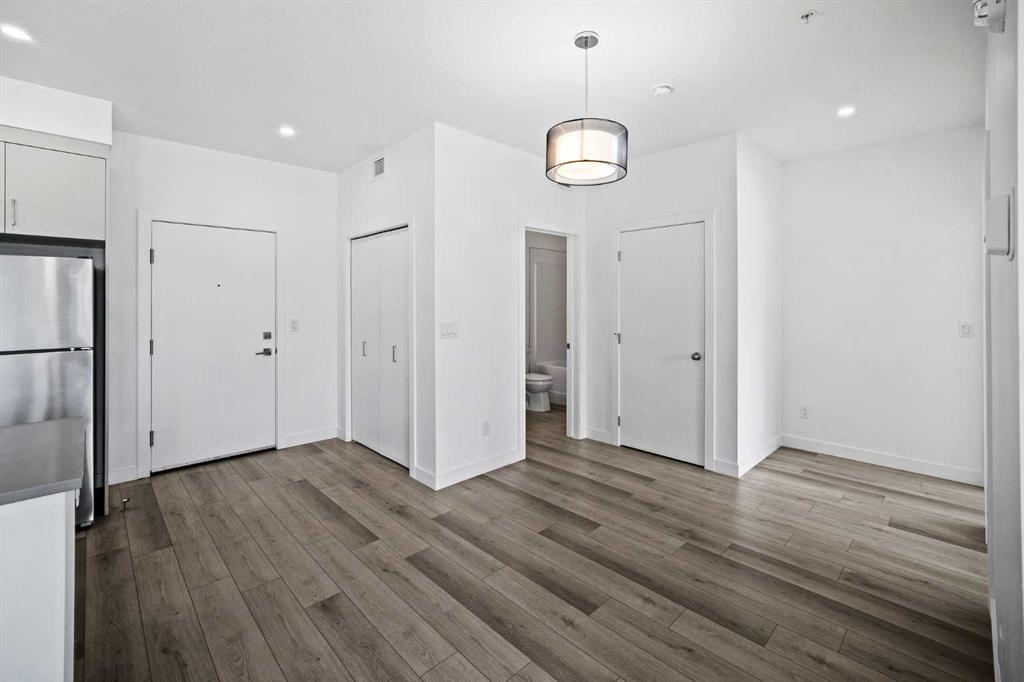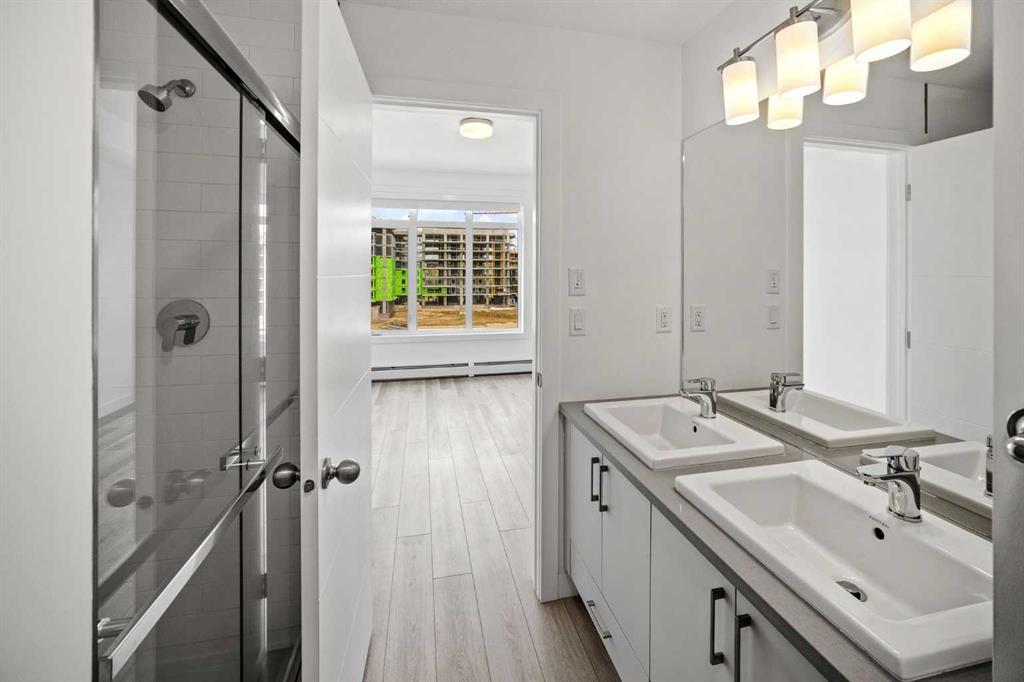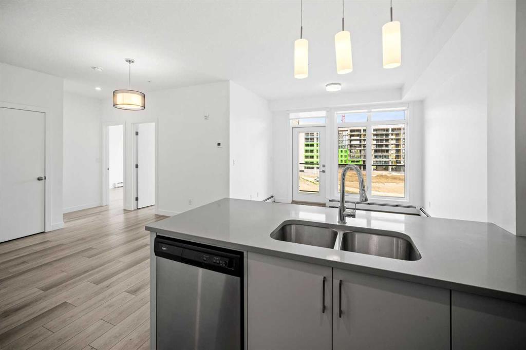 Welcome to this new upscale build in Springbank Hill! Immediate Possession! This very bright and open-concept 2 bedroom, 2 bath unit on the TOP FLOOR offers affordable luxury and convenient living near the Aspen Landing Shopping Centre, the new Aspen Village (being built) plus miles of walking paths and environmental reserves. Open floor plan features a peninsula kitchen with eating bar, high-quality cabinets, soft-close doors, under-mounted double sink, & Whirlpool stainless steel appliances. Full, private ensuite with double sinks off the main bedroom and a huge walk-in closet. Second bedroom with large window and easy access to second full bath and stacked washer/dryer with storage. Thoughtfully designed with expansive double pane windows, 9ft ceiling, warm coloured luxury vinyl plank flooring throughout, a spacious living /dining room, and bright windows and glass door to the balcony with BBQ gas line. The Orion Condos are bordered by a serene natural reserve with abundant walking trails and bike paths that connect throughout this vibrant and sought-after community. It comes with a titled underground parking stall with over-sized storage locker. Amenity room available. Amenities within walking distance include Safeway, Blush Lane, Royal Bank, TD, Starbucks, Cob's bread, Original Joe’s restaurant, Lady Bug Cafe and many more! Close to the 69 Street C-Train, Westside Rec Centre plus easy access downtown and to the mountains! Pets allowed. Fees include heat, water etc.