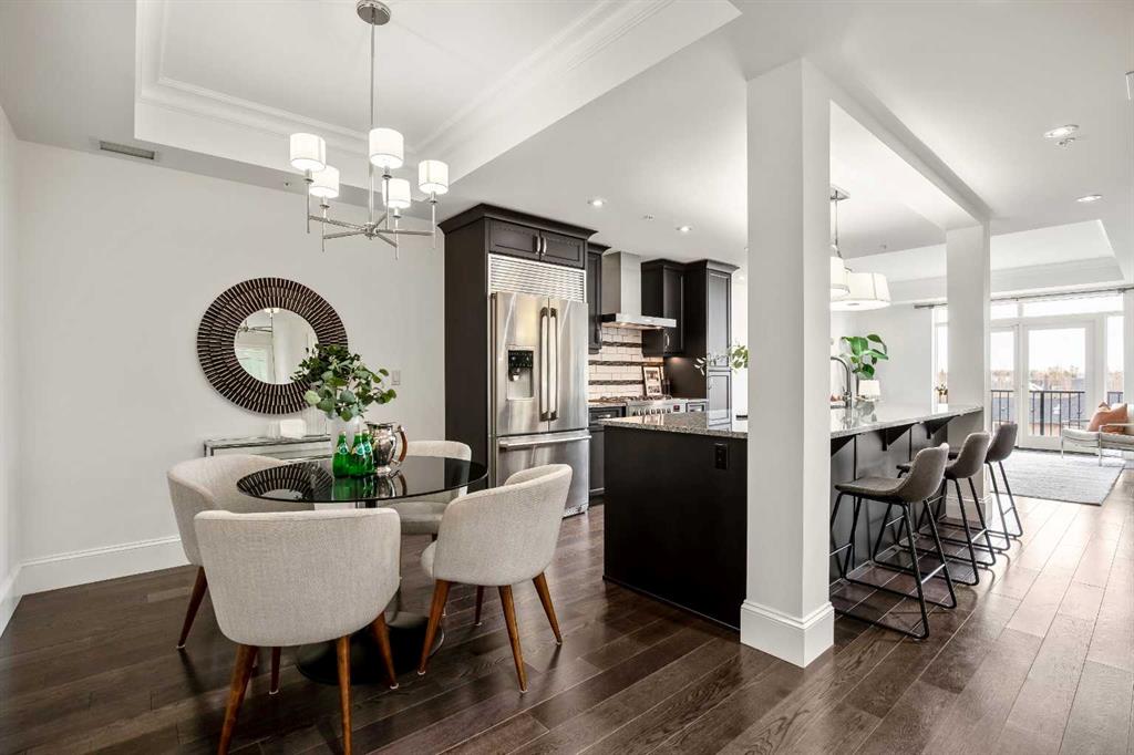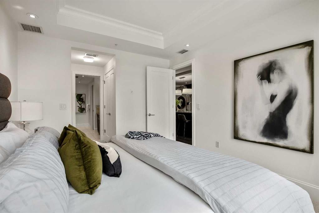 Experience luxury condo living in this beautiful, immaculately maintained 1-bedroom, 1-bathroom residence in this exquisite Champagne development. The unbeatable location has you walking out of your building just steps from the Bow River Pathway system, walking distance to Sue Higgins Off-Leash Dog Park, quick access to Deerfoot Trail, and walking-distance to shopping, restaurants, YMCA and more. This unit is located on the 4th floor of this quiet complex, delivering “penthouse qualities” with no overhead balcony, allowing natural light to flood the space. The interior is rich with quality and taste, featuring fresh paint, new carpet in the bedroom, a brand new microwave, tray ceilings, engineered hardwood flooring, 9 ft ceilings, marble tile, and top-of-the-line finishings. The chef's kitchen is centrally located within the unit, outfitted with premium stainless-steel appliances, including a gas range, an oversized granite island, soft-close cabinetry, making it perfect for entertaining or everyday casual dining. The bedroom can easily accommodate a king-size bed and more. The spa-like ensuite bathroom invites relaxation, offering a soaker tub as well as a tile shower. Enjoy the convenience of underground parking stall, a titled storage unit, bicycle storage, and a car wash bay.