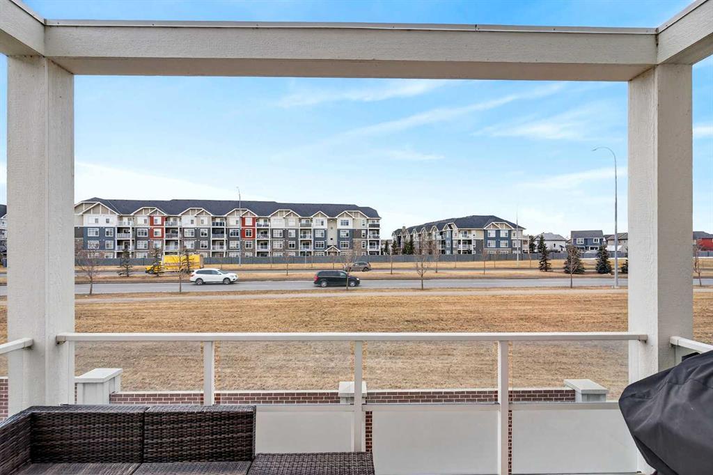 SHOW HOME upgrades - END-UNIT 1,380 sq. ft., this bright townhouse in Redstone features 2 bedrooms, 2.5 bathrooms, with unobstructed Mountain VIEWS off the dining room balcony & master bedroom, a main-level office/den/gym/ flex room, and an extra-large single attached garage. Enjoy bright sunshine throughout the entire home, the large windows in the primary bedroom. Added privacy bonus: NO neighbours directly facing your front door. The ground level welcomes you with a spacious front entry and a versatile office/den or recreation space, along with a convenient 2-piece bathroom, an oversized attached heated garage with ample storage, built in desk & shelves, and enough room for a workbench. Upstairs, laminate flooring flows through the open-concept main level. The kitchen offers dark cabinetry, stainless steel appliances, and an extra-large island (ideal for casual seating and hosting), opening to a family-sized dining area with patio doors to the generous balcony with gas line for BBQ—perfect for morning coffee with the views. The living room is anchored by a custom built feature wall/wall unit, creating a stylish and functional gathering space. The upper level includes a primary bedroom with mountain views, a 4-piece ensuite, and double closets, plus a second spacious bedroom, walk in closet and another 4-piece bathroom. A dedicated laundry and storage room completes the layout. Close to parks, pathways, schools, transit, and major routes for commuting, this Redstone home delivers space, light, privacy, and views. Call for viewing.