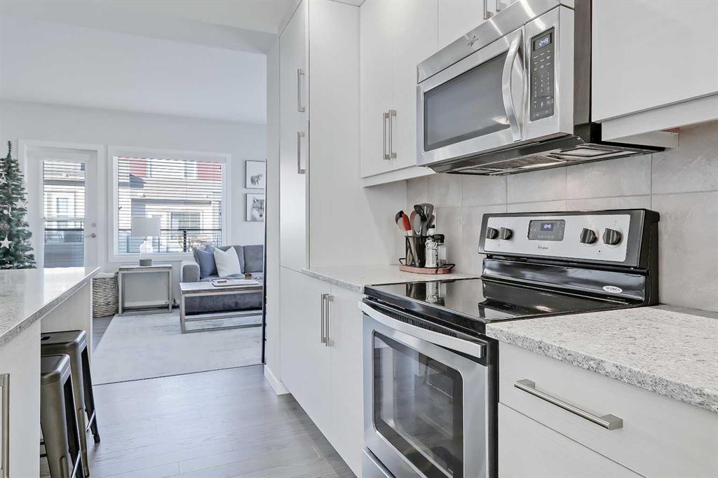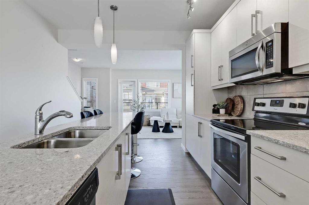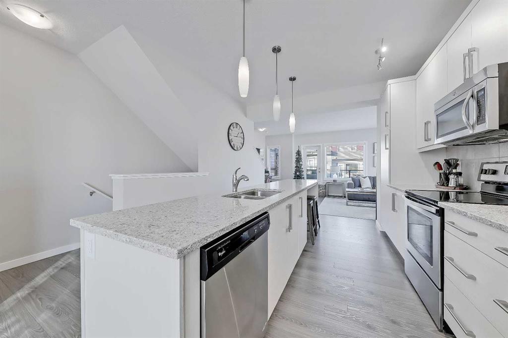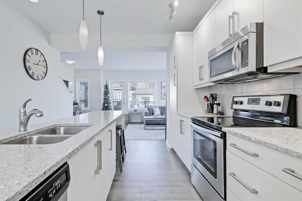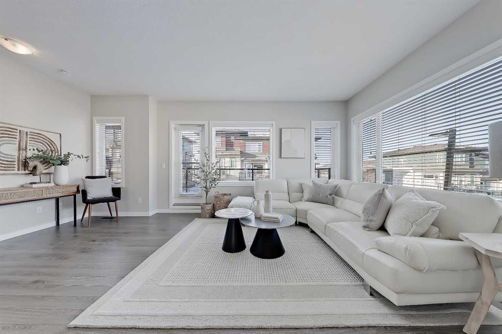 Welcome to refined townhome living, set within one of Cochrane’s most scenic and thoughtfully planned communities! Backing onto rolling natural landscapes with elevated sightlines, this modern three-storey residence offers the rare balance of contemporary design, functional space, and everyday comfort, all just minutes from downtown Cochrane and the Bow River pathway system. Spanning over 1,715 sq ft of developed living space, this home is bright, airy, and beautifully laid out across three levels, designed for both daily living and entertaining. The main floor features an open-concept design anchored by a sleek white kitchen with full-height cabinetry, stainless steel appliances, and generous quartz countertops. Clean lines, soft neutral tones, and wide-plank flooring create a calm, modern backdrop that feels effortless and inviting. The dining area is perfectly positioned between the kitchen and upper balcony, creating an easy flow for everyday meals and summer entertaining, with space for outdoor dining and BBQs. On the opposite side, the living room is set at the front of the home, offering a bright, open space framed by large windows and an additional private balcony. This separation creates distinct zones for dining and relaxing, while maintaining an airy, connected feel throughout the main level. Upstairs, the private living quarters are smartly arranged. The primary suite is bright and inviting, complete with a walk-in closet and a well-appointed ensuite featuring a glass-enclosed shower and contemporary finishes. Two additional bedrooms provide excellent versatility for family, guests, or a dedicated home office, all supported by a full four-piece bathroom. Thoughtful proportions and natural light continue throughout the upper level, creating a sense of space rarely found in townhome living. The ground floor adds valuable functionality with an oversized tandem garage offering ample room for vehicles, bikes, storage, or seasonal gear. This level also includes mechanical space and direct access to the home, making daily routines seamless and practical. Beyond the home itself, River Heights is known for its elevated setting, peaceful surroundings, and strong sense of community. Residents enjoy quick access to walking and biking trails, playgrounds, schools, and local amenities, while still being moments from Cochrane’s historic downtown, cafés, and shops. With Calgary less than 30 minutes away and the Rocky Mountains within easy reach, this location offers a lifestyle that blends convenience with natural beauty. Modern, low-maintenance, and thoughtfully designed, #408, 501 River Heights Drive is an exceptional opportunity to own a turnkey townhome in one of Cochrane’s most desirable communities. A home that feels current, comfortable, and effortlessly livable.