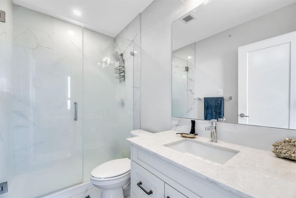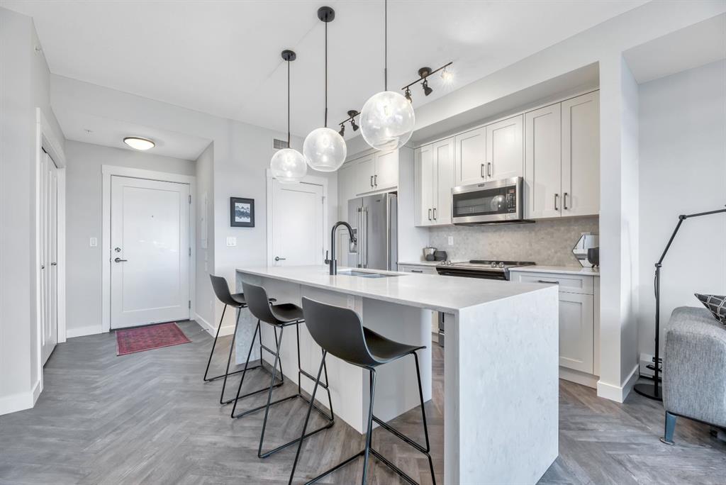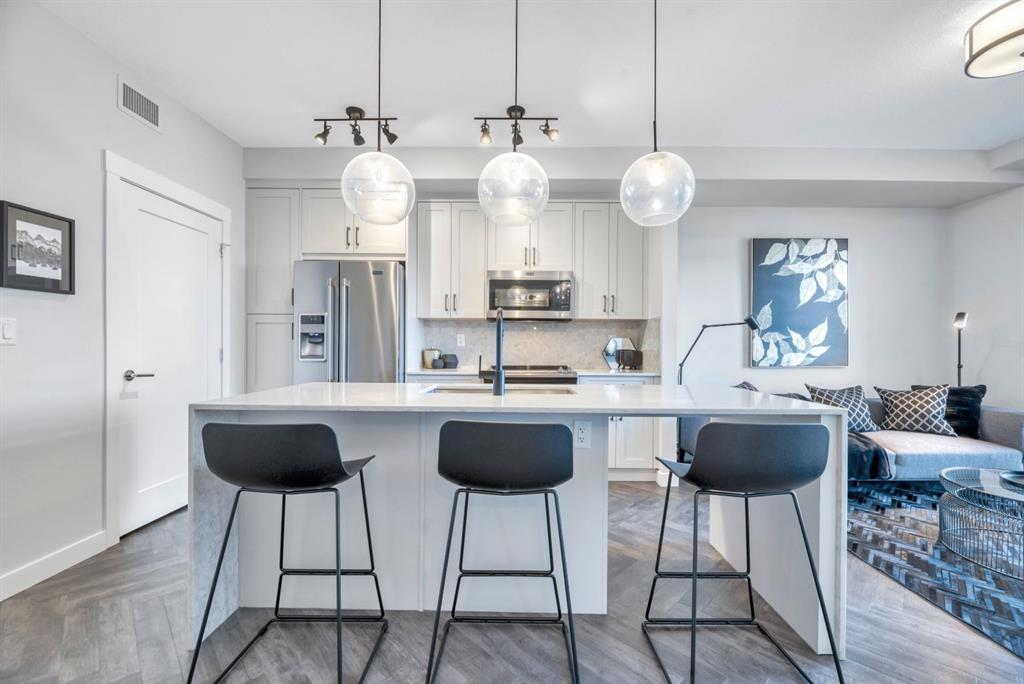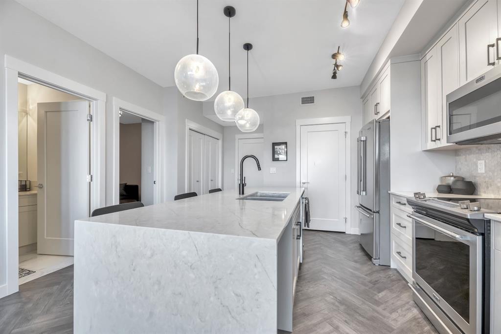 This stylish, like-new TOP FLOOR 2 bedroom, 2 bathroom unit promotes a convenient, low-maintenance lifestyle in an fabulous location overlooking the courtyard. The bright and open floor plan is basked in natural light with herringbone plank flooring and a stylish design that is modern and sophisticated yet also practical. The gorgeous kitchen encourages culinary explorations featuring quartz countertops, stainless steel appliances and a large breakfast bar island with a built-in table for everyone to gather around. A handy gas line on the covered balcony encourages casual barbeques with courtyard views as the beautiful backdrop. The primary bedroom has courtyard views, dual closets and a luxurious ensuite. A handy den provides extra space for work, hobbies or guests with a full 4-piece bathroom right beside. In-suite laundry and a titled, underground parking stall further add to your comfort and convenience. This beautiful, move-in ready home is phenomenally located within this vibrant community chocked full of pathways that wind around ponds and parks. Within walking distance are every amenity including the numerous shops, services, groceries, cafes and restaurants (with more on the way!) at the Township Shopping District. Book your showing to see this beauty for yourself!