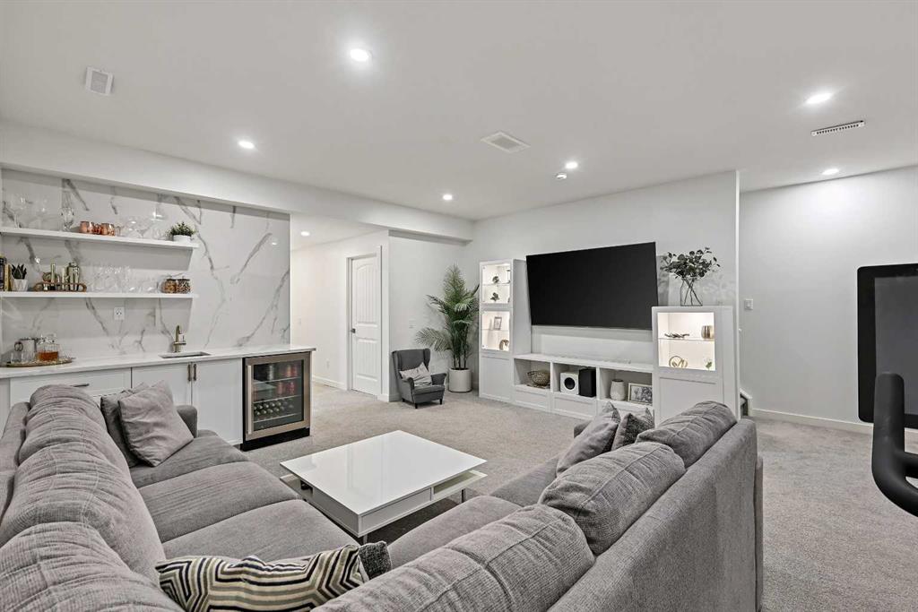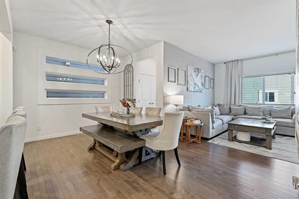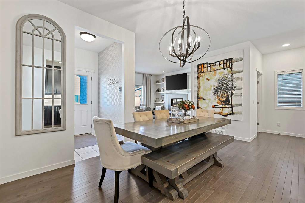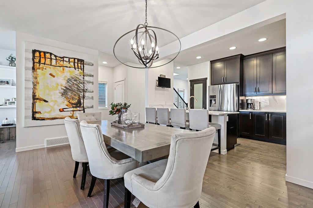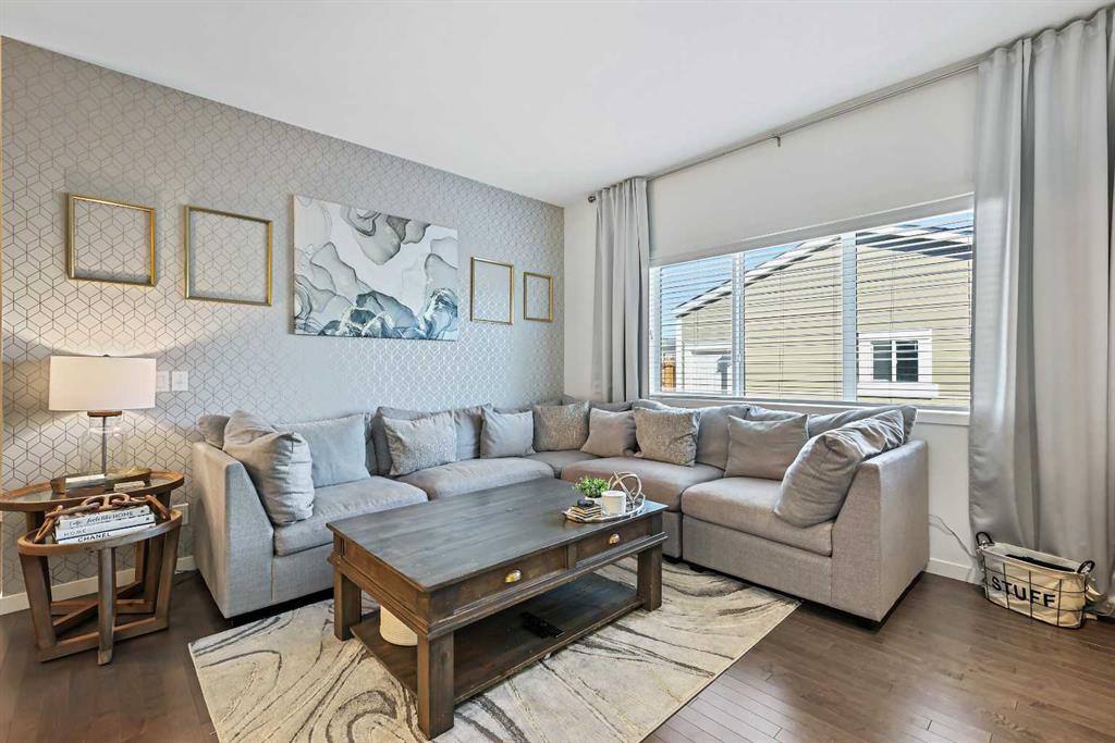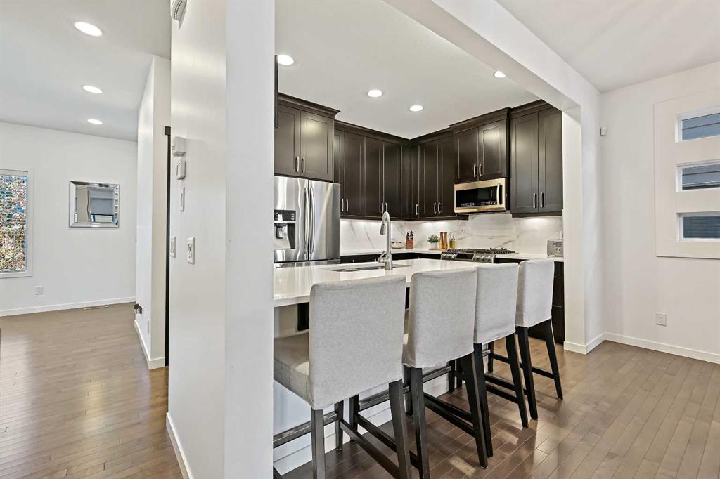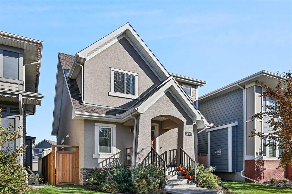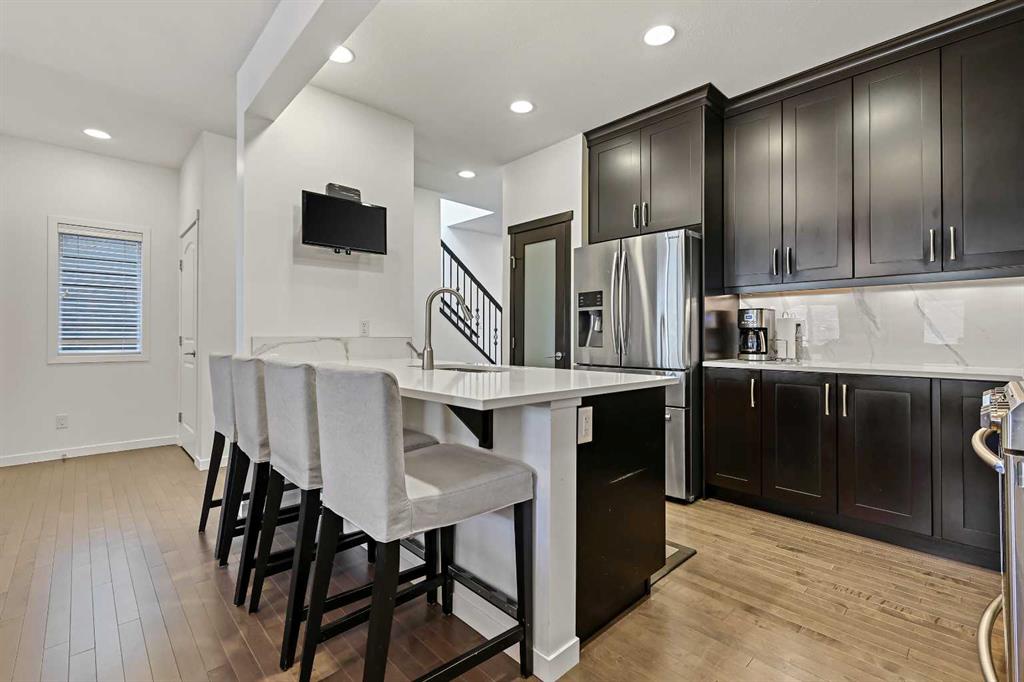 You’ll absolutely fall in love with this immaculately maintained and thoughtfully upgraded 2-storey home located on one of Mahogany’s most beloved family-friendly streets—where neighbours know your name, block parties are a tradition, and community truly thrives. From the moment you arrive, this home will have you at hello with its charming stucco and stone exterior, welcoming front porch, and undeniable curb appeal. Inside, discover nearly 2,500 sq. ft. of beautifully developed living space designed with both comfort and style in mind. The main floor flows effortlessly from the inviting front office or den into a bright open-concept living area. The chef’s kitchen impresses with quartz countertops, marble-inspired full tile backsplash, extended flush island, and ceiling-height cabinetry—complete with a mounted TV to catch the morning news or your favourite cooking show. Enjoy sleek stainless steel appliances, including a gas stove, and a spacious pantry for all your culinary essentials. The adjoining dining area easily accommodates family gatherings, while the cozy living room centers around a beautiful gas fireplace framed by floating shelves, built-in storage, and a stylish mantle. Rich hardwood floors and tasteful feature walls add warmth and sophistication throughout. Upstairs, you’ll find three generous bedrooms, including a luxurious primary suite with a 5-piece ensuite featuring dual vanities, an oversized glass shower with floor-to-ceiling tile, and a custom walk-in closet with built-in organization. The upper floor also offers a bright laundry room with cabinetry and counter space, and another full bath with designer finishes. The fully finished lower level (completed in 2024) is an entertainer’s dream, featuring a modern wet bar with sink, bar fridge, and floating shelves, a spacious recreation area for movie nights, and a fourth bedroom with walk-in closet—perfect for guests or teens. The full bath on this level is a showstopper, with a walk-in rain shower, LED mirror, and full tile surround with built-in niche. Step outside to your two-tiered, maintenance-free deck, offering both a dining and lounging area, ideal for summer evenings under the stars. The oversized double detached garage (nearly 10 ft ceiling height) provides ample storage and space for vehicles or hobbies. All of this is tucked within Mahogany’s established, mature pocket—away from new construction, yet steps from schools, the lake, walking paths, and local amenities. Enjoy tree-lined streets, friendly neighbours, and the serenity of Calgary’s most desirable four-season lake community. This is more than a home—it’s a lifestyle. Welcome to Mahogany, where memories are made by the lake.