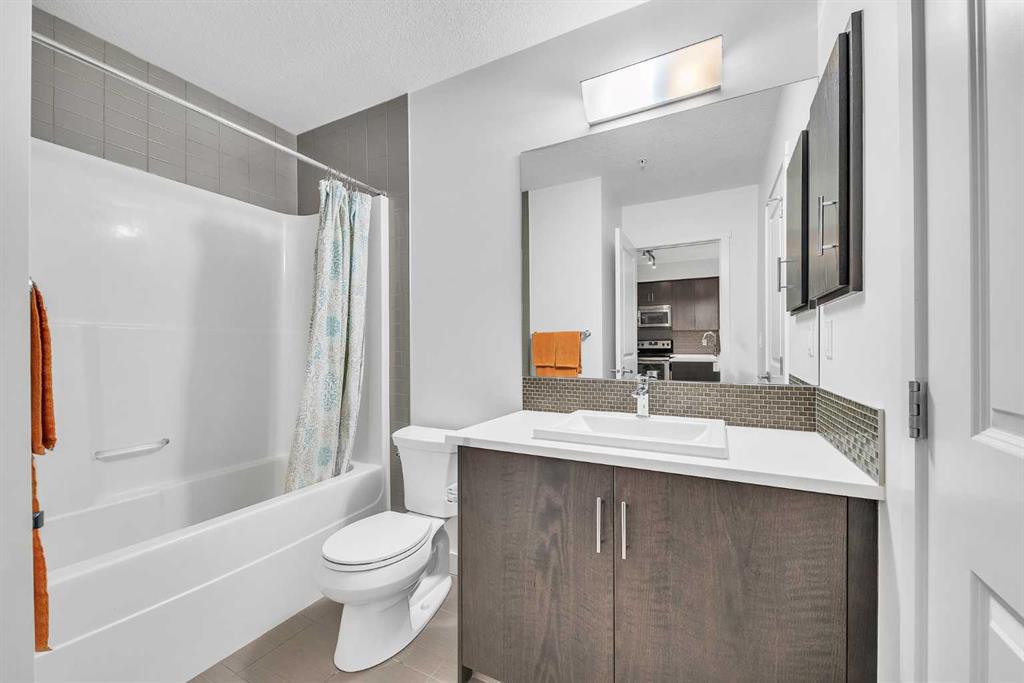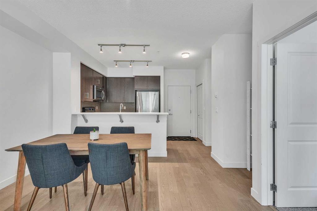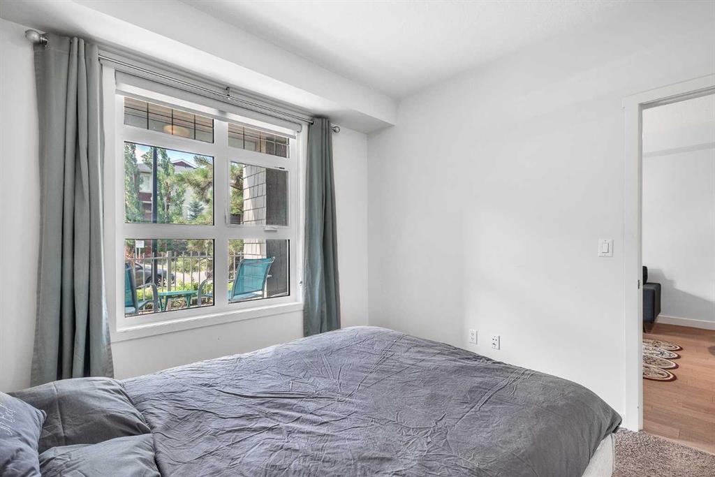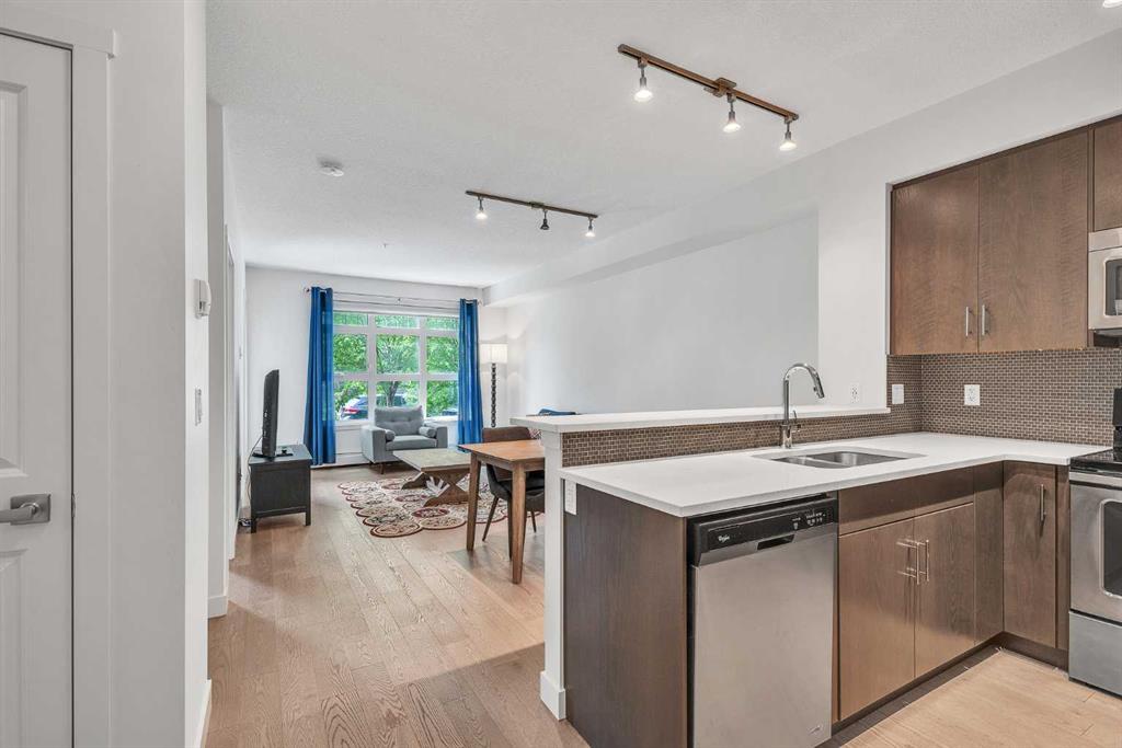 This beautifully appointed 1-bedroom, 1-bathroom west-facing condominium offers exceptional value at an affordable price. Boasting a spacious kitchen complete with soft close drawers, quartz countertops, s/s appliances, and breakfast bar. The great-sized bedroom provides ample space for rest and relaxation, with a walk-through closet and cheater door to the bathroom. The main living space offers gorgeous hardwood floors, newly added air conditioning, upgraded blinds package, big windows for plenty of natural light and large dining and living rooms. There is a covered patio off the living room with BBQ gas line and west exposure for afternoon/evening sun. A titled undergound parking stall is included and there is a storage locker for your extra gear. This home is ideally situated close to the lake and has easy access to public transportation, as well as major roadways such as Deerfoot and Stoney, making commuting a breeze. Nearby shopping, dining, and entertainment options abound, making this the perfect home for first-time buyers, investors, or downsizers looking for a comfortable and convenient lifestyle. Call today to arrange your showing!