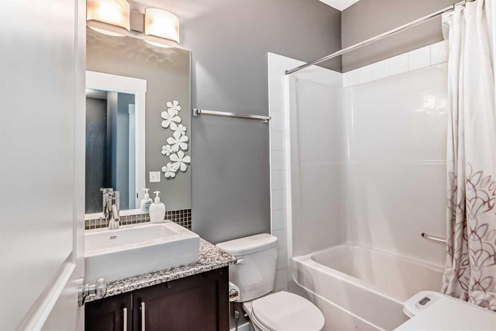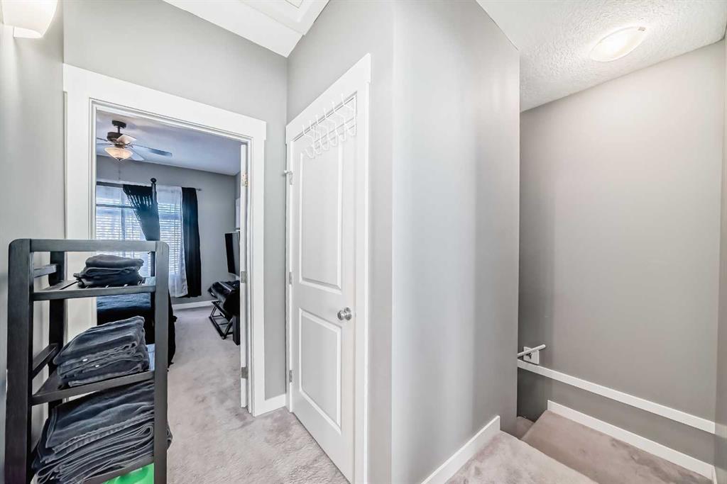 AMAZING VALUE in Skyview Ranch! This beautifully upgraded townhome offers an exceptional layout, modern finishes, and a prime location with ultimate privacy — no busy roads nearby. Enjoy peaceful courtyard views from your private patio. The lower level features a spacious tiled foyer, a versatile flex room ideal for a home office or gym, and a convenient mudroom with access to the attached DOUBLE GARAGE. The bright and open main floor boasts 9’ ceilings, rich hardwood flooring, and abundant natural light. The dream kitchen showcases granite countertops, under-cabinet lighting, stainless steel appliances (including an upgraded refrigerator), and elegant dark cabinetry. The dining area is perfect for family meals, while the living room provides access to the balcony. A convenient half bath and built-in desk complete this level. Upstairs, you’ll find upper-floor laundry, a generous primary suite with a 4-piece ensuite, two additional bedrooms, and a full 4-piece bathroom — granite countertops throughout. Offering OVER 1,530 SQ FT of living space and LOW condo fees, this home is within walking distance to schools and parks, and just minutes to the airport, Deerfoot Trail, and Stoney Trail. A fantastic opportunity and outstanding value for first-time buyers or investors!