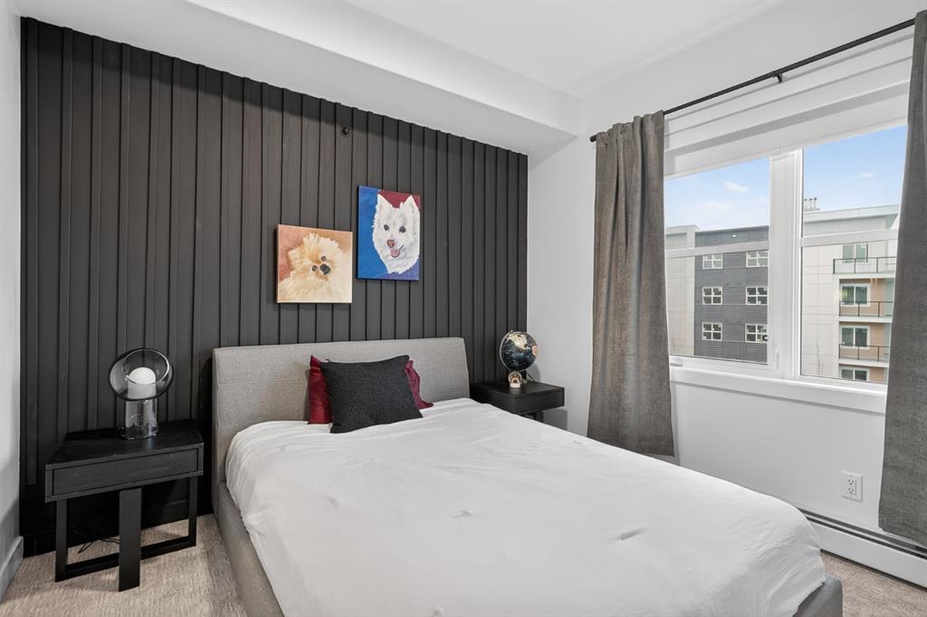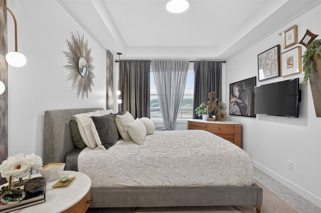 RARE TOP-FLOOR SW CORNER RESIDENCE WITH WRAP-AROUND BALCONY IN BOW360 Perched on the top floor of BOW360, this southwest corner home offers elevated living with over $47,000 in builder upgrades, expansive natural light, and one of the most desirable layouts in the building. With no neighbours above and windows on two sides, this residence delivers privacy, sunshine, and a true sense of space that is rarely available in condo living. From the moment you step inside, the difference is clear. The entry has been thoughtfully redesigned to create an impressive, oversized foyer, a feature that immediately sets this home apart. The open-concept living space is bright and refined, anchored by a stunning travertine-wrapped fireplace that adds warmth and architectural sophistication. The kitchen was designed to impress, featuring a dramatic waterfall quartz island, stainless steel appliances, upgraded cabinetry, and elevated designer finishes throughout. Whether entertaining or enjoying a quiet evening at home, the space feels modern, intentional, and effortlessly stylish. The wrap-around southwest-facing balcony extends your living space outdoors, offering open sky views and sunlight throughout the afternoon and evening, perfect for summer evenings and year-round enjoyment. The primary suite provides a private retreat with a walk-through closet and beautifully finished four-piece ensuite. A spacious second bedroom and full bath offer flexibility for guests, a home office, or shared living. Titled underground parking and secure storage add convenience, while condo fees that include heat, water, and gas provide exceptional value. Steps to the Bow River pathways, parks, golf, and off-leash areas, this is an opportunity to own one of the best-positioned and most upgraded homes in BOW360.