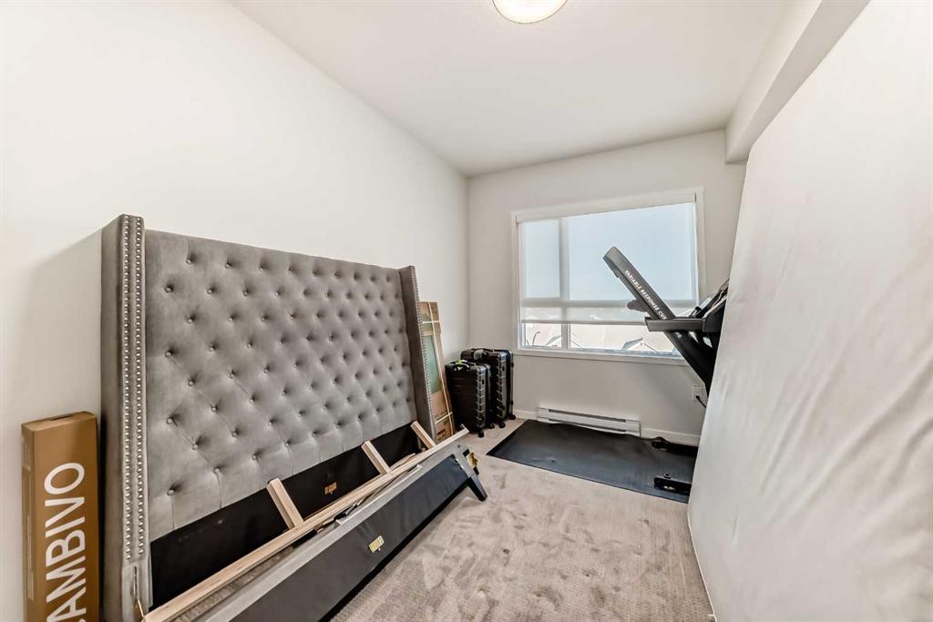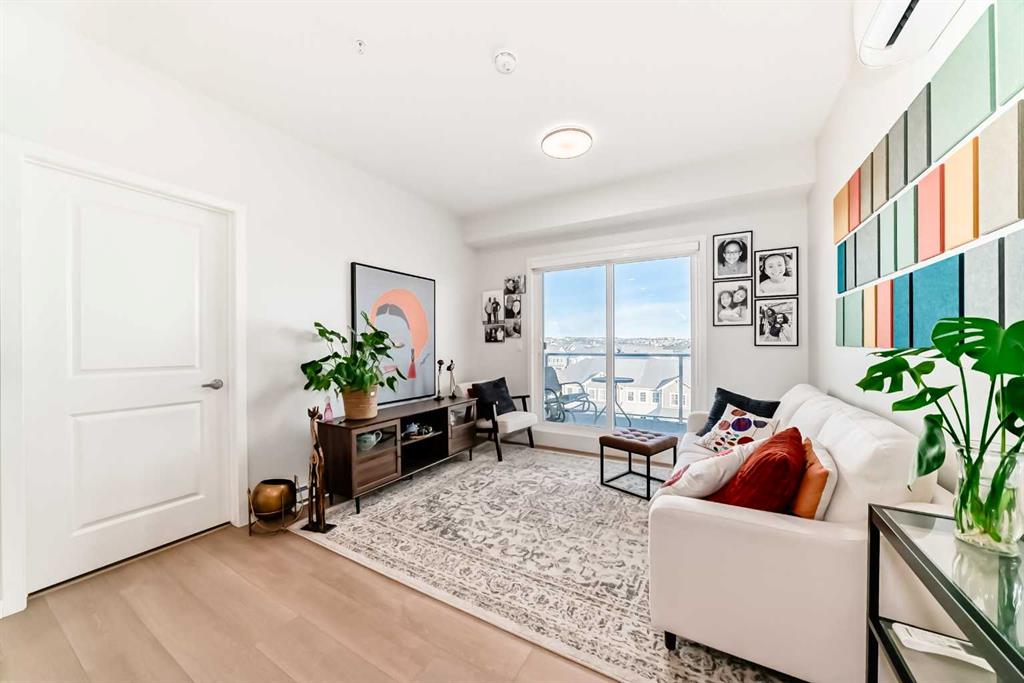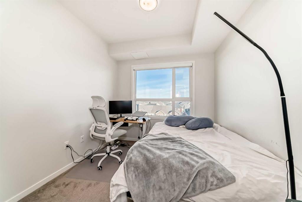 If you have been searching for a modern condo in NW Calgary that does not feel cookie-cutter, this is it. Located in Carrington, this TOP-FLOOR home gives you privacy, light, and a clean contemporary design. Built in 2022 by Cedarglen, this 860+ sqft condo was designed for real life. Not just photos. The kitchen is upgraded and finished with TWO-TONE CABINETS to the ceiling, GLASS-FRONT UPPERS, QUARTZ COUNTERS, a BUILT-IN OVEN and microwave, a cooktop with HOOD FAN and a CUSTOM BUILT-IN DINING area. It feels sleek, modern, and intentional, perfect for hosting. This 2 BED / 2 BATH layout offers separation and function. The primary bedroom has an ensuite with DOUBLE VANITY, walk-in shower and a massive WALK-IN CLOSET. The second bedroom has its own WALK-IN CLOSET too, and is adjacent to the guest bath. The huge LAUNDRY ROOM offers serious storage. You also get A/C, titled underground PARKING and a separate STORAGE LOCKER. No sweating in the summer. No scraping snow in winter. No clutter in your living space. TOP FLOOR means no one above you. More peace. More quiet. Nearby GREENWAY PARK offers playgrounds, a basketball court, a skate park, art installations, and access to the Rotary Mattamy Greenway trail system. In fact, there are about 65 acres of green space and connected pathways making it easy to stay active. The SHOPS OF CARRINGTON GREEN, with groceries, restaurants, and professional services, are literally at your doorstep. Quick routes to major roadways and future Green Line LRT expansion make commuting simple. Stop settling for average condos. This one checks all the boxes.