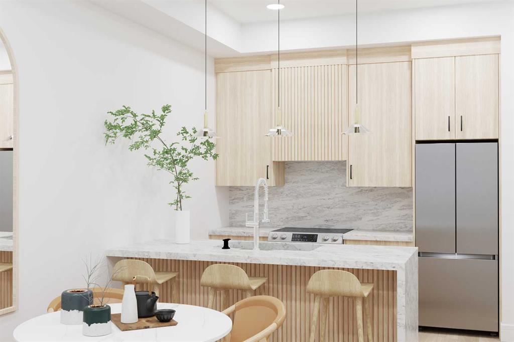 Welcome to the "Verde" floorplan by Rohit Homes—an inspired 1-bedroom, 1-bathroom home with a flexible den, designed to elevate your lifestyle. Perfectly positioned in the sought-after Quesnay at Currie Barracks, this west-facing unit is drenched in afternoon sunlight, offering a bright and welcoming living space. Complemented by the serene Ethereal Zen color palette, this home is a modern sanctuary with a calming atmosphere. The Verde floorplan blends elegance and functionality with carefully chosen details like 9' ceilings, quartz countertops with a stunning waterfall edge, a matching quartz backsplash, full-height cabinetry, stainless steel appliances, designer light fixtures, and tasteful window coverings. The open layout connects the kitchen, dining, and living areas seamlessly, providing an effortless space for entertaining or relaxation. The primary bedroom is thoughtfully designed as a peaceful retreat, while the den offers endless possibilities—whether you need a workspace, a reading nook, or extra storage. The luxurious bathroom is highlighted by fully tiled walls, refined finishes, and a spa-inspired tub/shower combo. A private west-facing balcony completes the home, making it the perfect spot to take in glowing sunsets or unwind after a busy day. In this pet-friendly, AIRBNB-approved building, you'll enjoy titled heated underground parking, visitor spaces, and unmatched convenience. Located minutes from downtown, Mount Royal University, and the vibrant offerings of 17th Ave and Marda Loop, the Verde floorplan is an unbeatable opportunity for modern living. Act fast—this west-facing gem won't be available for long! **Photos are taken from existing building of the same models. Not of the exact unit **