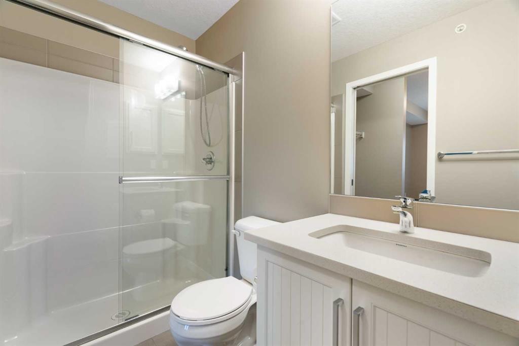 Your opportunity to make your next home in Sandgate, a great condo complex in the highly desirable lake community of Mahogany. This well designed and upgraded 2-bedroom, 2-bathroom corner unit with 900 sq. ft. of living space located on the top floor with a southwest exposure is a rare find. As you approach the unit, you will notice it is located at the end of the wide hallway, being one of 2 units sharing the entire end of the building. Open the door and you will experience the bright crisp freshness of this contemporary home. The 9’ knock down ceilings, laminate flooring, and 2 closets for plenty of storage are great features. A few steps forward and you will be in the open living area with a 10’ ceiling and many windows flooding the space with natural light. Take a look at the gourmet kitchen. There is a massive island with breakfast bar, white quartz counter tops, an abundance of upgraded shaker cabinets with tall upper cabinets, soft closing doors and drawers, an abundance of pot drawers with under-mounted rollers, stainless steel appliances and a water purifier. The generous living room opens to the south facing large balcony with gas line and barbeque. A wall mounted air conditioner with separate compressor keeps the living area comfortable on those wonderful summer days. Wide slat venetian blinds throughout the unit provide the option to block out the light and heat. The spacious primary bedroom features a large walk-through closet and a 3-piece en-suite bathroom with quartz counter, tile floor, walk-in shower and a medicine cabinet. On the opposite side of the unit there is a second bedroom located beside a 4-piece bathroom with quartz counter, tile floor and a medicine cabinet. The stacked front-loading washer/dryer complete this wonderful home. Lightly lived in and well maintained, this unit has been professionally repainted in neutral colours and is move-in ready. There is a titled underground parking stall with a caged storage locker just down the stairwell beside this unit or take a short walk and ride the elevator. The complex offers a bicycle storage room, fitness center in building 10 and 2 guest suites. All this is located within walking distance of the heart of Mahogany with shops, services and all of the lake amenities including a clubhouse, swimming, skating, tennis courts, fishing and so much more. You have easy access to Stoney Trail and only minutes to the South Calgary Health Campus, Brookfield YMCA, public library and the future LRT station. Check it out today!