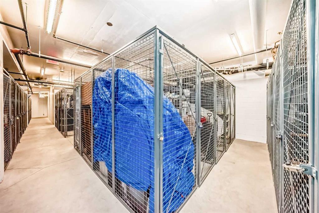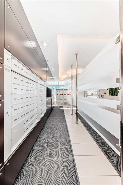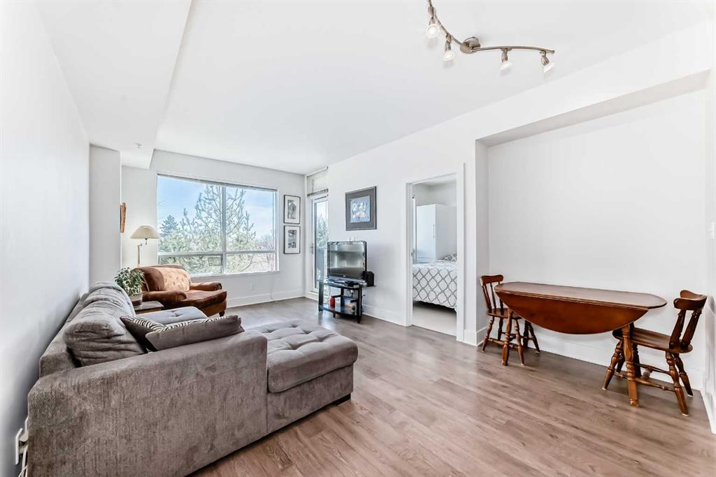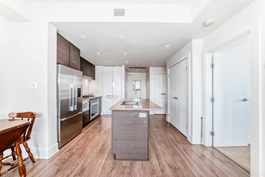 Super bright 2 bedroom condo overlooking the courtyard and community garden plots. East facing so great morning sun on the balcony. There is only one common wall allowing for lots of windows throughout. Shows like new with stainless steel appliances that includes a gas stove top. Quartz counter tops with loads of cabinets. Primary bedroom shares an ensuite , in-suite laundry. Good size second bedroom. A well managed building with amenities that include a gym, work room to service bikes, a wash bay for dogs, theater room, community gardens for the green thumb. Courtyard with a BBQ for entertaining. There is secure titled parking plus a storage locker and bike locker. All within a 5 min walk to the Bridgeland LRT.