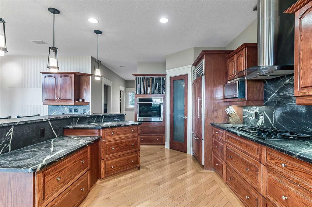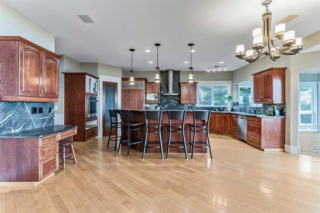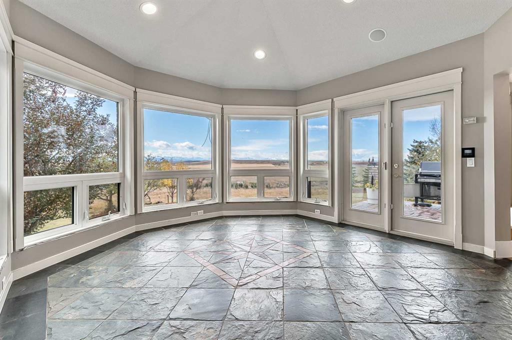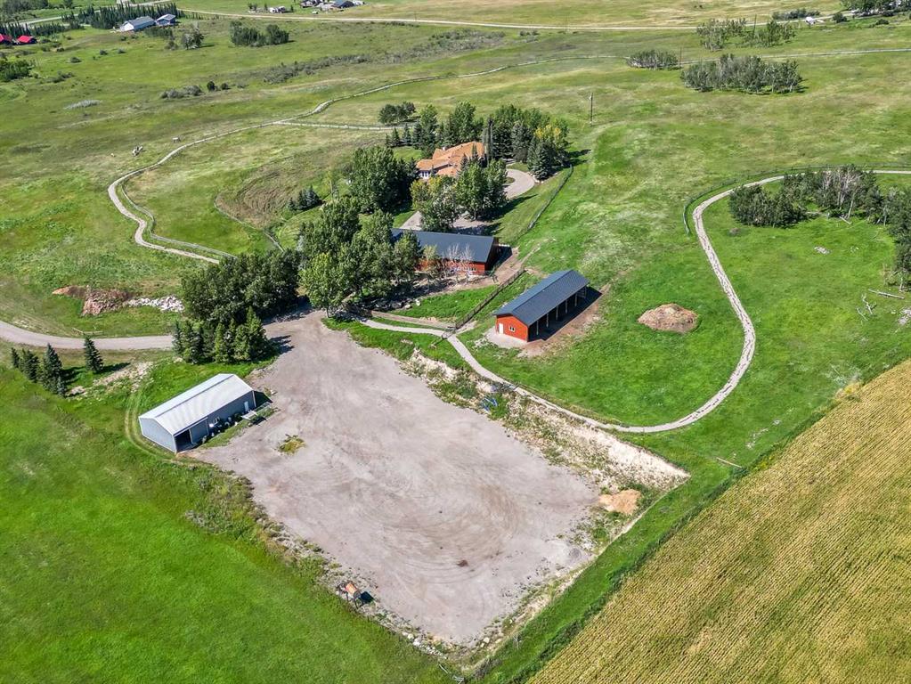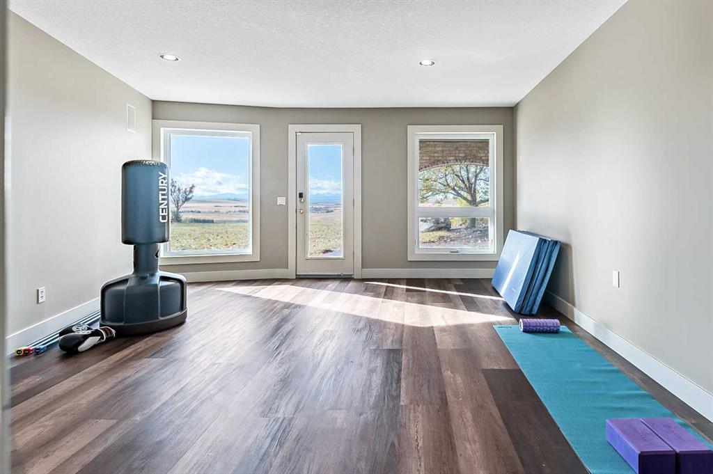 Imagine waking up to breathtaking panoramic views of the Rocky Mountains and rolling valleys, where the sun dips dramatically behind snow-capped peaks each evening—right from your west-facing windows. Nestled on over 55 acres of prime agricultural land in Rural Foothills County, this exceptional walk-out bungalow delivers 2,450 sq. ft. on the main level plus a fully developed basement, totaling 4,700 sq. ft. of luxurious living space. With 4 bedrooms, 4 bathrooms, office air conditioning, and thoughtful features like a large open kitchen, all-season sunroom/dining room flowing to expansive decks, vaulted living room with a stunning newer stone wood-burning fireplace, and premium hardwood, slate, and cork flooring throughout. The lower level boasts a family room with wet bar and wine cellar, dedicated media room, gym, abundant storage, and cozy lower deck access. Plus, an oversized attached double garage for all your needs. But this isn't just a home—it's a powerhouse property primed for smart investment. Unlock immediate equity through a potential subdivision opportunity! Owner recently submitted a land use redesignation application in order to start the process to potentially split off 13.7 acres of buildable bare land—pending Foothills County approvals—act now before this potentially elevates options and competition! Elevate your lifestyle with unmatched water security: Two excellent water wells —perfect for light irrigation, livestock, or self-sufficiency. The top field is fenced with new 7-strand high-tensile electric fence system, metal gates, and plank accents, plus a paved walking path for serene exploration or convenient at home fitness. Three versatile outbuildings await your vision: A 42' x 84' insulated metal barn with concrete floor, 110/220 power, and water (ideal for expansion); a 36' x 72' metal shop and a 24' x 72' animal shelter. An oversized gravel compound handles equipment, parking, and storage effortlessly. Tucked peacefully off Highway 7 under Alberta's vast blue skies, with mountain and city views blending into the horizon—this is serenity meets opportunity. Don't miss your shot to own this versatile gem before the potential subdivision greenlight changes everything. Schedule your viewing today and step into endless Alberta horizons!