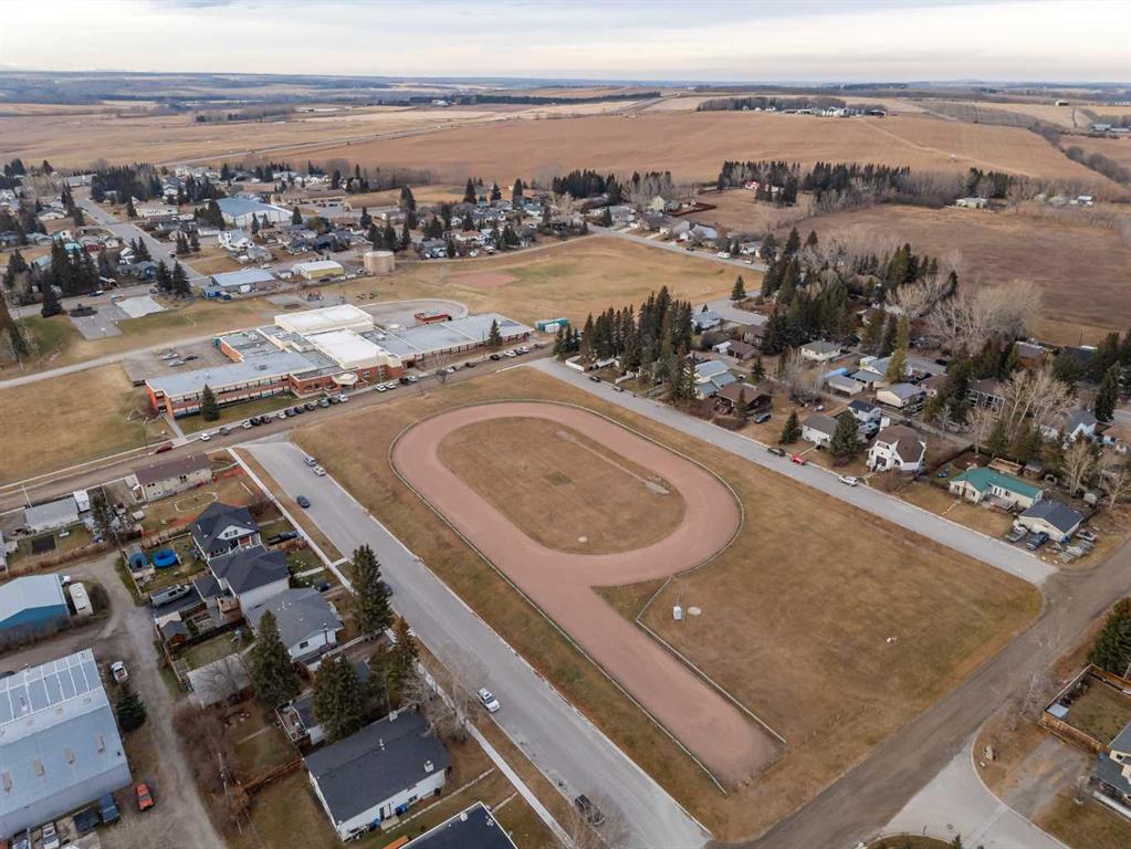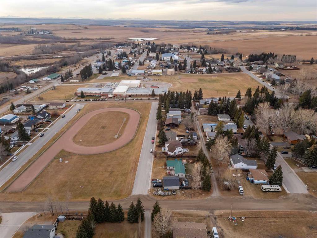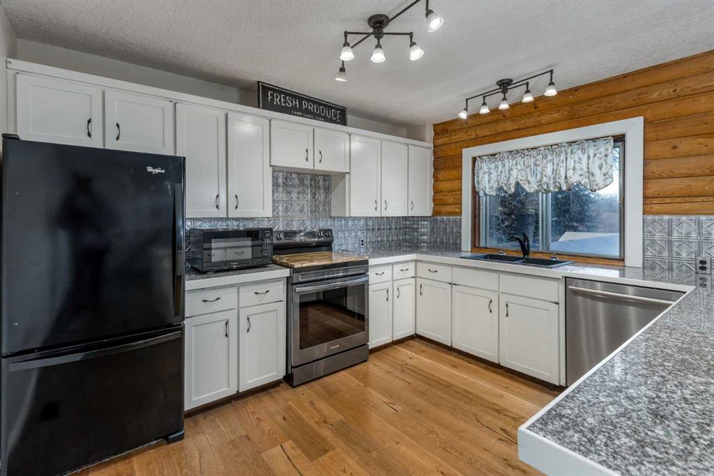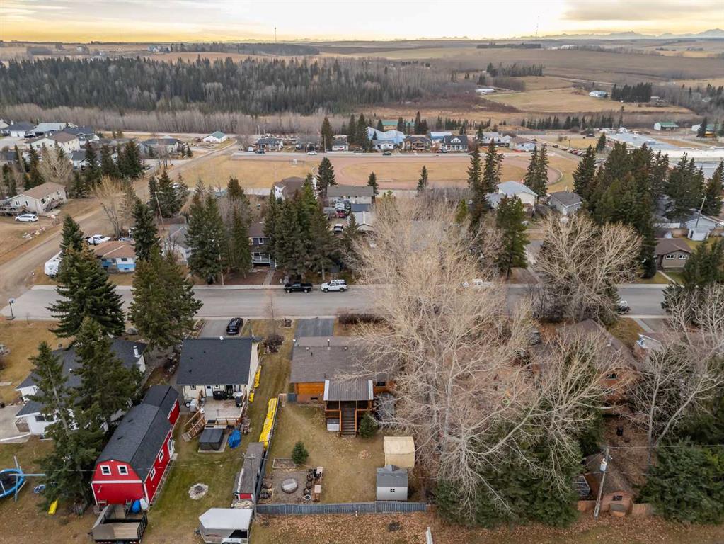 Once you view this charming log home you will fall in love. Situated on a beautifully treed mature street only one block from the School. This awesome raised bungalow offers over 1882 sq ft of developed living space across 2 levels perfectly blending comfort and functionality. The main floor layout includes a generous living room with cozy gas stove. A well appointed kitchen with ample cabinetry, granite tiled counter tops, and 4 appliances. Big dining area ideal for your family meals. You'll find 2 bedrooms on the main level with a recently renovated 4 pce bathroom offering a fresh modern feel. The developed lower level adds even more versatility with 2 additional bedrooms and a recently renovated 3 pce bathroom along with a large family room that has an electric fireplace perfect for movie nights. Laundry room is down and there is any area to set up a work bench for your tools to tinker around in. New furnace and hot water tank that are only 2 years old. The large landscaped lot has a few trees, shrubs, apple tree and firepit along with 3 sheds. Backyard is fenced and also has a dog run fenced in and fire pit. You will feel like you are backing onto green space as the lot overlooks large back yards of neighbouring properties. There is room to build a garage with access from the grassed back alley that is presently not being used. Don't miss out on this fantastic opportunity. Book your showing today
