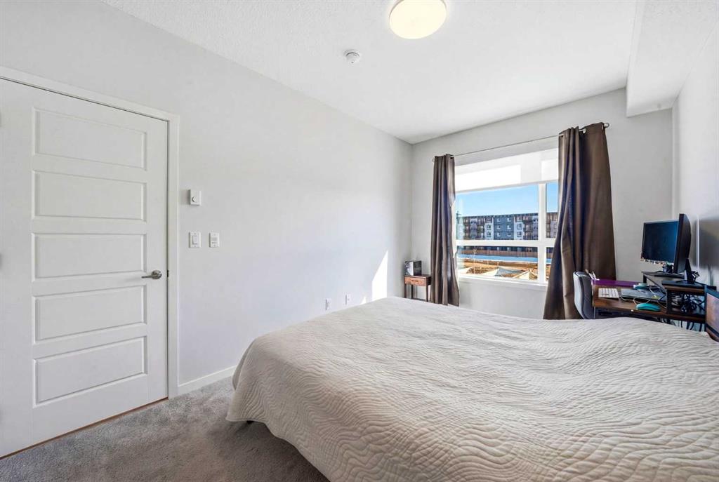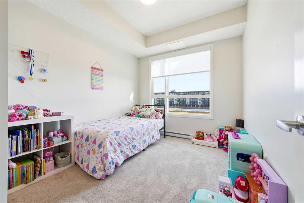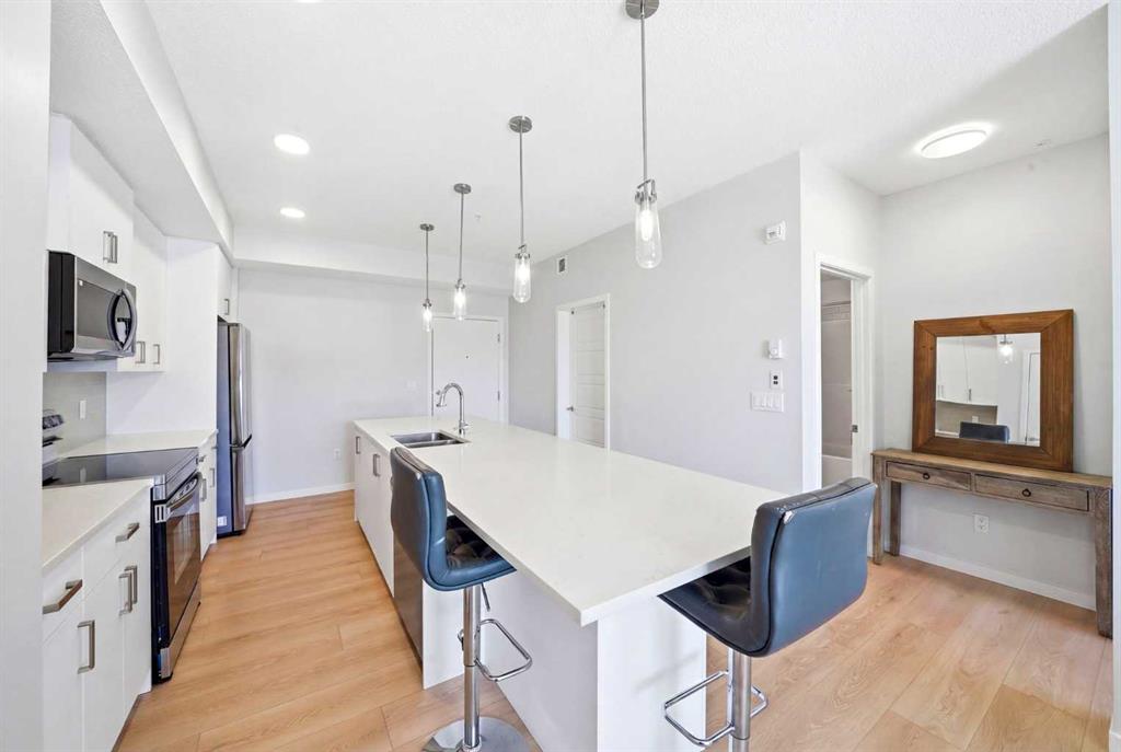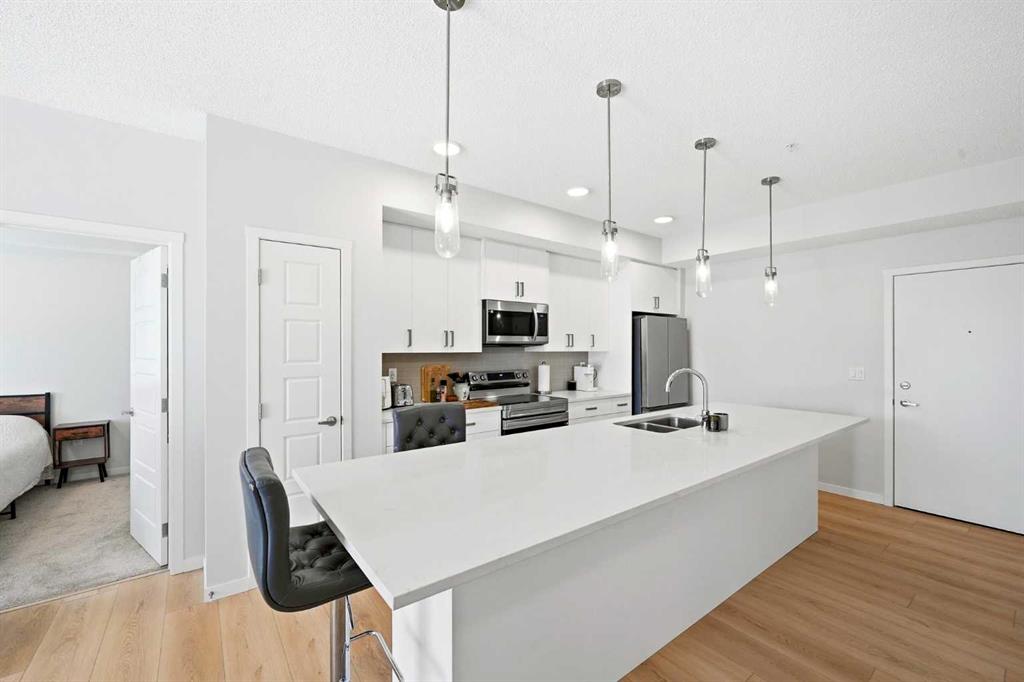 Experience elevated living in this stunning 2-bedroom, 2-bathroom apartment, where modern design meets everyday comfort. Perfectly positioned with south facing exposure, this home is filled with natural light, creating a warm and inviting ambiance throughout. The heart of the home is a beautifully designed open-concept kitchen featuring sleek quartz countertops, premium stainless steel appliances, and an expansive island with an integrated sink, ideal for entertaining, casual dining, or gathering with family and friends. Designer pendant lighting and clean, contemporary cabinetry add a refined touch to the space. The spacious primary bedroom offers a peaceful retreat with plush carpeting, generous windows, and direct access to a private ensuite. A well appointed second bedroom provides flexibility for guests, a home office, or growing families. Enjoy the convenience of a walk-in closet and an oversized laundry room with ample additional storage, perfect for keeping everything organized and out of sight. Additional features include secure underground parking, modern finishes throughout, and a thoughtfully designed layout that maximizes both style and functionality. Located in the vibrant and rapidly expanding community of Belmont, this home offers a walkable lifestyle surrounded by parks, playgrounds, and beautiful green spaces just steps from your door. Enjoy the convenience of nearby shops, restaurants, and everyday essentials, with even more on the horizon.