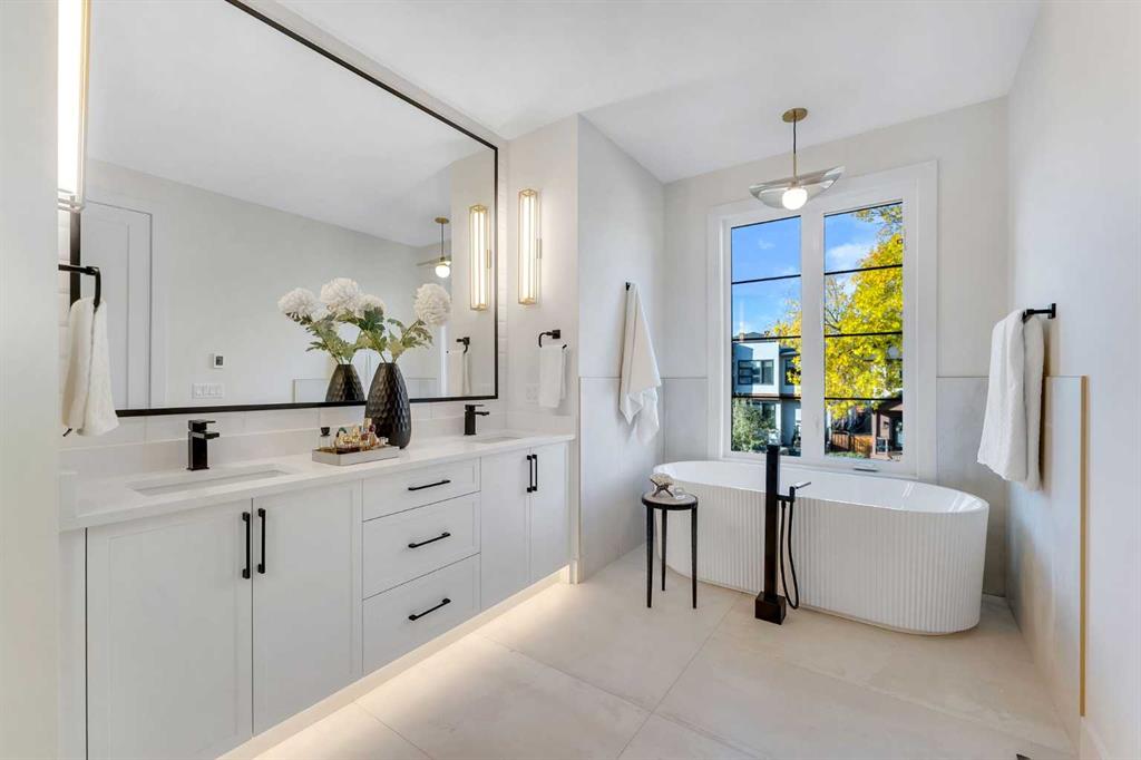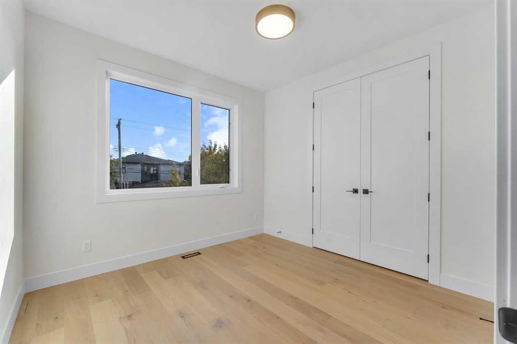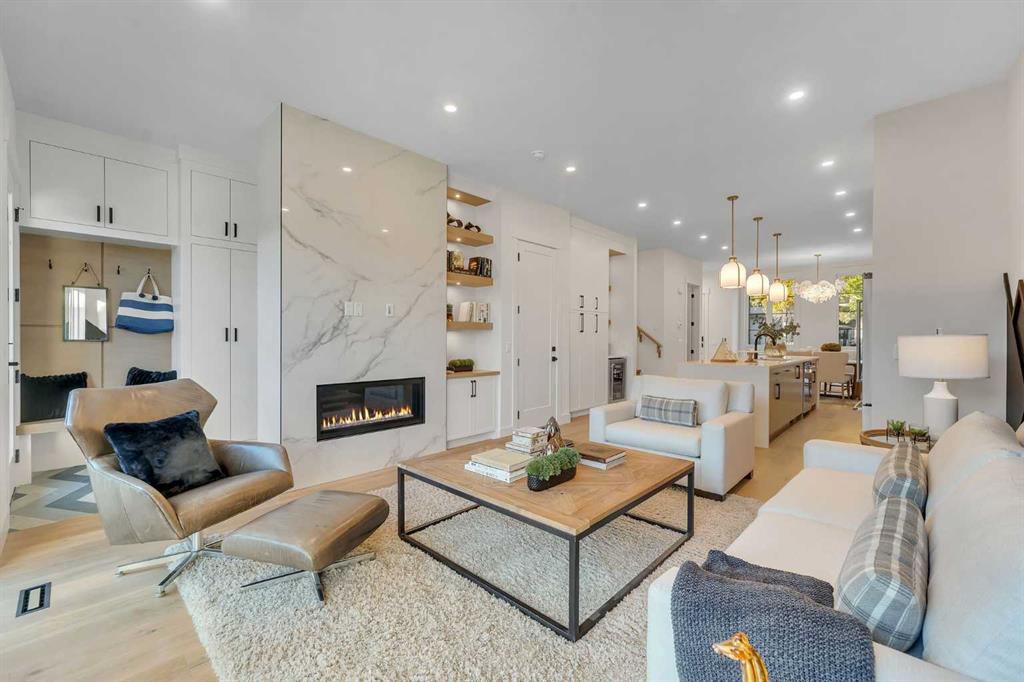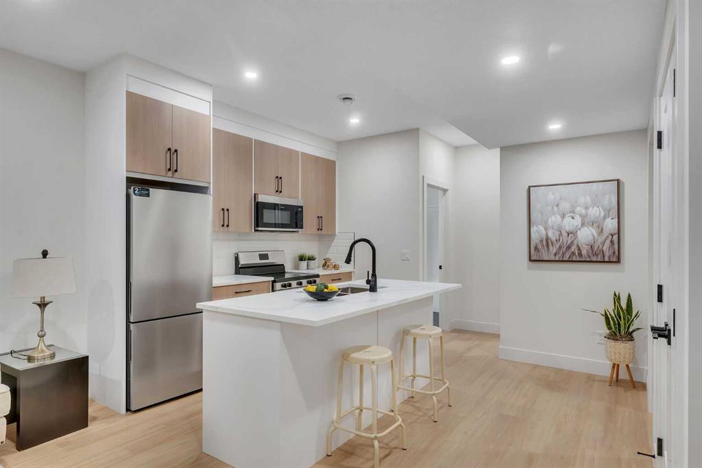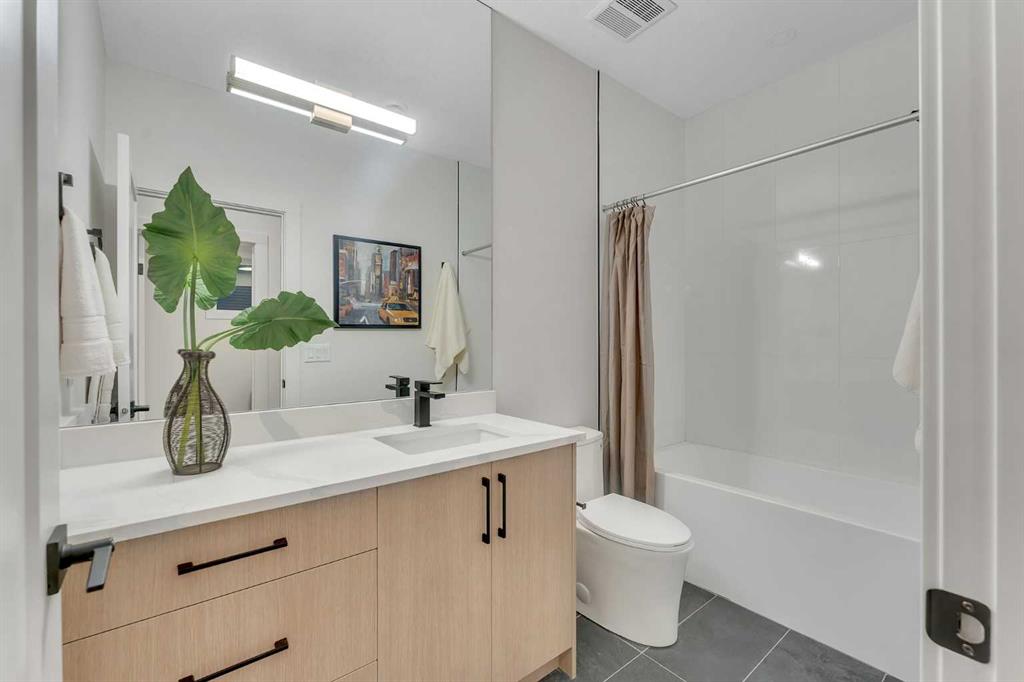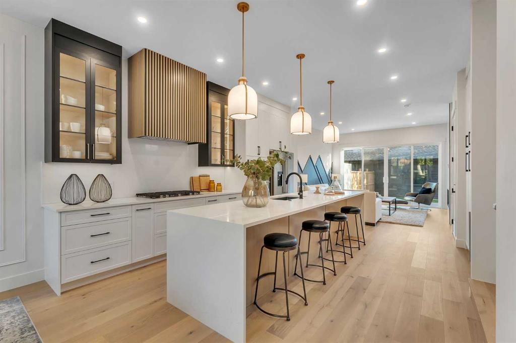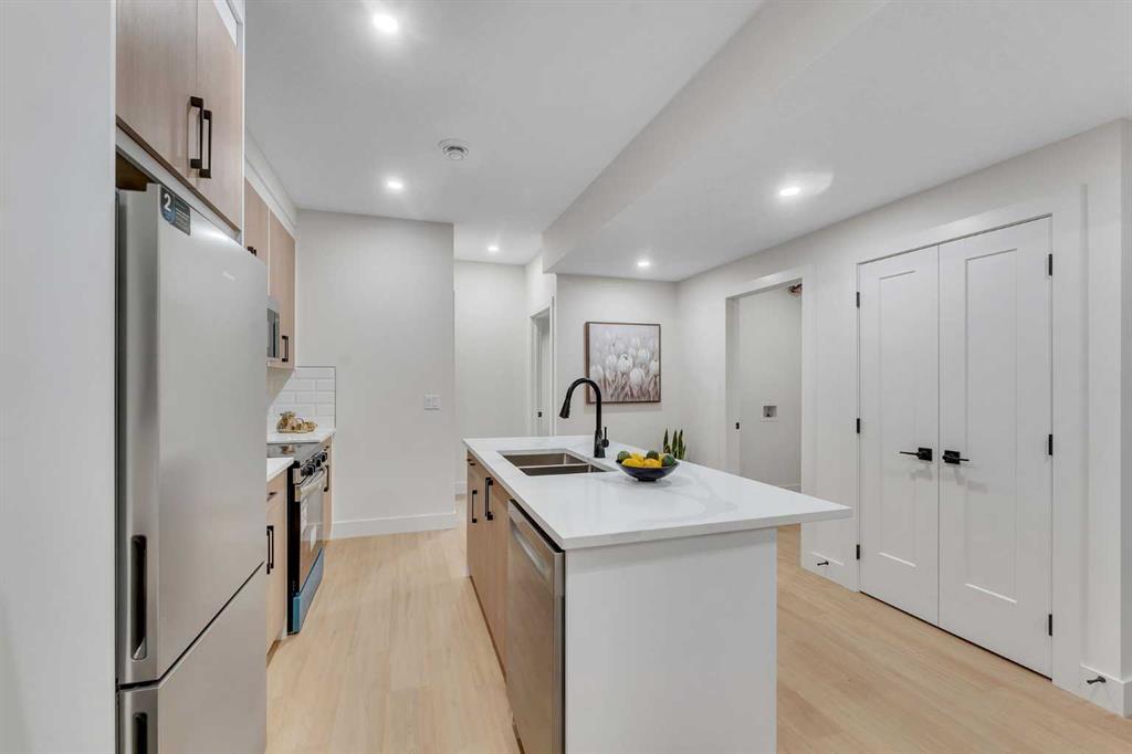 Welcome to the heart of Mount Pleasant, one of Calgary’s most sought-after inner city neighbourhoods. This newly built semi detached home combines modern design with practical family living, offering over 2,800 sq ft of beautifully finished space including a legal suite. Thoughtfully designed for flexibility, it’s ideal for multi generational living or rental income without compromise on comfort or style. The open concept main level features large windows that fill the home with natural light. The kitchen showcases KitchenAid appliances, sleek and stylish custom cabinetry, quartz countertops, and a stunning full slab backsplash that creates a clean, seamless look. A large island anchors the space, perfect for casual meals or conversation. The adjoining dining and living areas flow naturally toward the deck, creating an inviting space for both family time and entertaining. A fully fenced, landscaped yard with a composite deck offers a private, low maintenance outdoor retreat. Upstairs, the primary suite is a true escape, featuring a large walk in closet and a spa inspired ensuite with Italian tile, a steam shower, freestanding tub, and dual vanities. Italian tile continues through all bathrooms, adding a consistent, upscale feel. Two additional bedrooms, a full bath, and a laundry room complete the level, designed with both privacy and function in mind. The legal two bedroom basement suite is self contained with its own entrance, full kitchen, laundry, and bath, ideal for extended family or generating additional income. The design and sound separation ensure comfort for both households. Additional features include smart toilets, engineered hardwood on the main and upper floors, durable LVP in the basement, and a double detached garage offering secure parking and extra storage. The exterior blends red brick, and modern accents for timeless curb appeal. Mount Pleasant continues to be one of Calgary’s most desirable communities, known for its mature tree lined streets, walkability, and welcoming feel. Residents enjoy easy access to Confederation Park, the community pool and sports facilities, as well as cafes and boutiques along 4th Street NW. Close proximity to SAIT, Kensington, and downtown makes daily life convenient and connected. A home that delivers quality construction, flexible living, and a location that will always be in demand. Move in ready. Photos are from the other side of the duplex and are provided for reference only. Finishes, layout, and measurements may vary slightly.