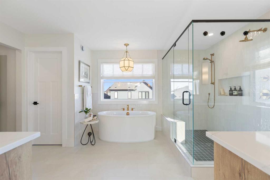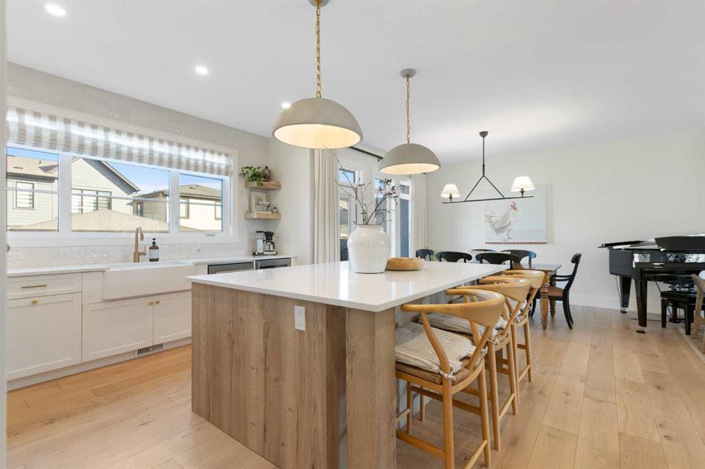 Welcome to this exceptional executive family home, perfectly positioned on one of the premier wide lots in the vibrant and thoughtfully designed community of Alpine Park, facing directly onto Orchard Green, a beautiful park featuring fruit trees, open play spaces, a community garden, and a Harvest Table for gatherings and picnics, offering a rare combination of privacy, scenery, and lifestyle. Set on an impressive 60 ft wide lot, the property enjoys peaceful park views from the front deck, living room, family room, and primary bedroom, with mature trees providing natural privacy, and offers over 3,600 sq ft of developed living space across three levels, showcasing outstanding craftsmanship and upgrades throughout while presenting like a builder’s showhome with the warmth and functionality of a true family home. Upon entry, you are immediately struck by the attention to detail and thoughtful design, with a bright main floor living room featuring large south-facing windows and a stunning floor-to-ceiling stone gas fireplace, flowing seamlessly into the heart of the home, a beautifully appointed kitchen with crisp white cabinetry, large island, stainless steel appliances, built-in oven, expansive north-facing window, and walk-in pantry. The spacious dining area is ideal for hosting large gatherings and features sliding patio doors leading to the upper deck and landscaped, fenced yard, along with a shaded lower patio perfect for summer relaxation. A stylish two-piece powder room and generous home office with park views and private deck access provide both convenience and versatility, while a custom-designed mudroom with closet and bench with lift-up storage completes the main level. The second level is a private retreat featuring a spacious family room with large park-facing windows, a unique bridge leading to the primary suite with expansive south-facing windows and a sliding barn door into the luxurious ensuite with dual vanities, large walk-in shower with dual shower heads, and elegant soaker tub. The custom walk-in closet connects to a well-appointed laundry room with folding counter and built-in sink, while two additional generously sized bedrooms and a five-piece main bathroom complete this level. The fully developed basement offers excellent additional living space with a large rec room ideal for teens, guests, or movie nights, a fourth bedroom, and a four-piece bathroom, plus rough-in plumbing for a future wet bar and an oversized utility and storage area for exceptional organization. The double attached garage is oversized in height, allowing for the potential addition of a vehicle lift or extra storage. Facing directly onto parkland, this home offers a quiet, traffic-free setting where you can relax on the front deck, enjoy your favorite beverage, and watch children play, delivering the perfect balance of luxury, comfort, and community-focused living in one of Calgary’s most exciting new neighbourhoods.