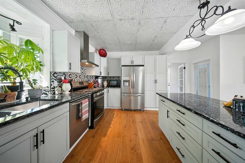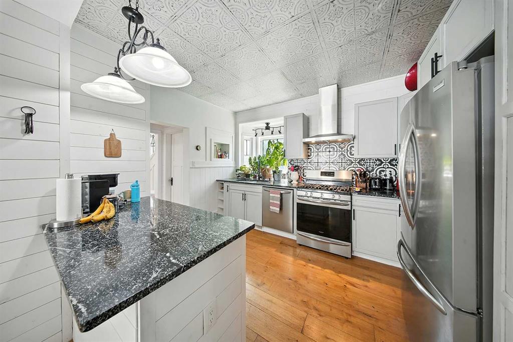 Looking for the perfect Christmas Gift? This beautiful Heritage home should be on everyone's Christmas List! So many updates throughout this incredible home which is located on a gorgeous street with Coronation Park on its doorstep! Plenty of charm as you walk up to the new south facing front covered porch with composite boards that wraps all the way around to the east of the house. The perfect place to sit with a glass of lemonade and look out towards the beautiful park. Walking into the large, amazing foyer with shiplap walls and high ceilings, you will find lots of room for cabinets and benches. The living room with feature walls and electric fireplace has south and east facing windows making it light and bright. Wide plank hardwood floors throughout the main floor! The living room flows into the large dining room with patio door to the east side deck, lovely to catch the morning sun with your first cup of coffee as you overlook the private yard with lilac, plum and apple trees! Off the dining is a gorgeous kitchen with custom kitchen cabinets, with newer appliances (2019), granite counter tops, pull outs in pantry, lots of decorative tile, plus cookbook niche. So lovely! Also on main floor is laundry room and a pretty little half bath., Plus the awesome addition which is a great flex space that can be used as a family room, or large sunny porch to sit and enjoy the sun with new glass door and windows and laminate flooring! Upstairs you will find three spacious bedrooms including the lovely primary bedroom. The family bathroom has a soaker tub and separate shower! Plus the bonus 3rd level loft can be used as an office area or 4th bedroom and has rough in for a bathroom. The basement has a rec area and potential bedroom space and plenty of storage space plus a bathroom with shower. So much on offer here including a double detached garage with gas line for roughed in heat and new door. Some of the many updates are newer roof, new porch, windows in 2019, new insulation in walls with vapour barrier to keep home cool in the summer and warm in the winter! New electrical panel and electrical wiring and plumbing. Added rebar to deck with composite boards. The list goes on . . .this incredible 1908 character home has so much charm plus all the convenience of a new home!