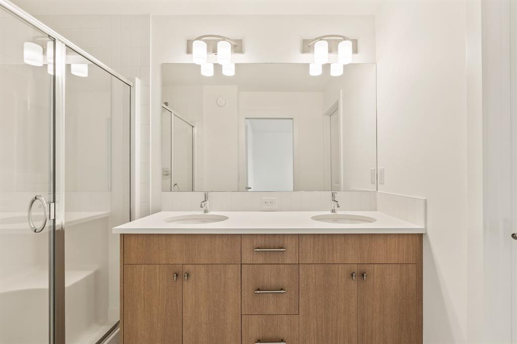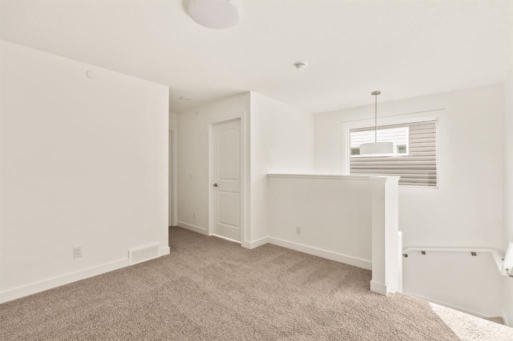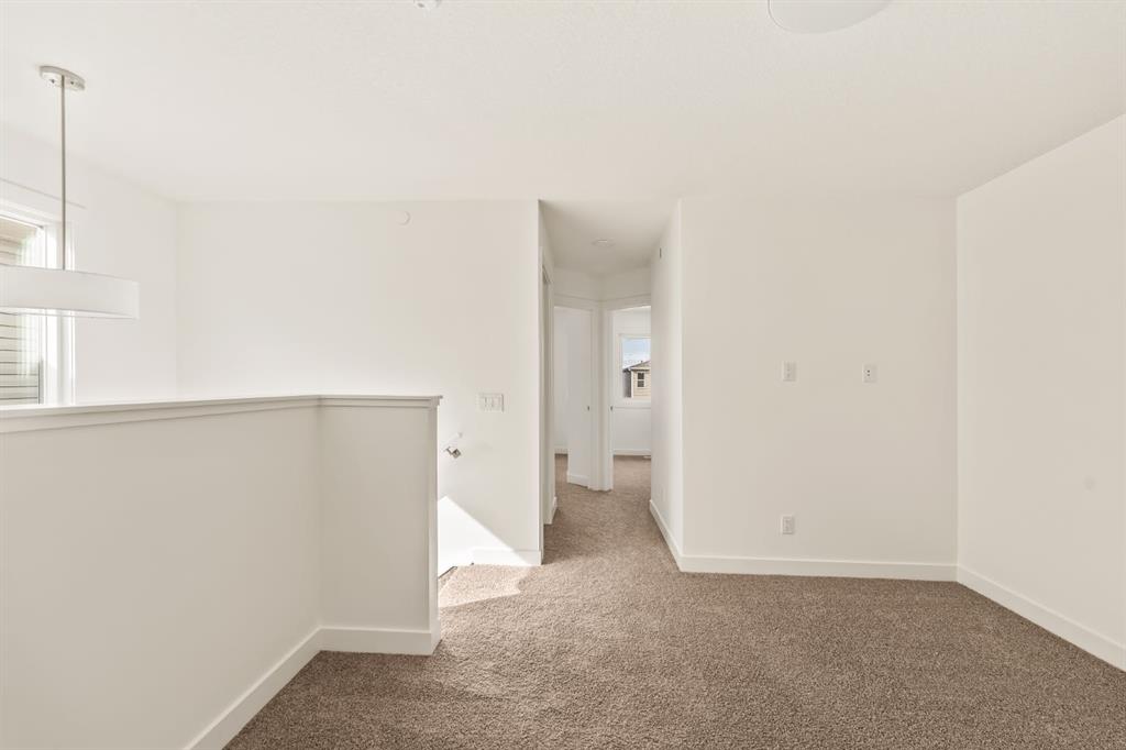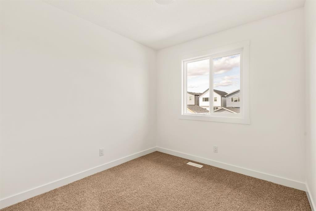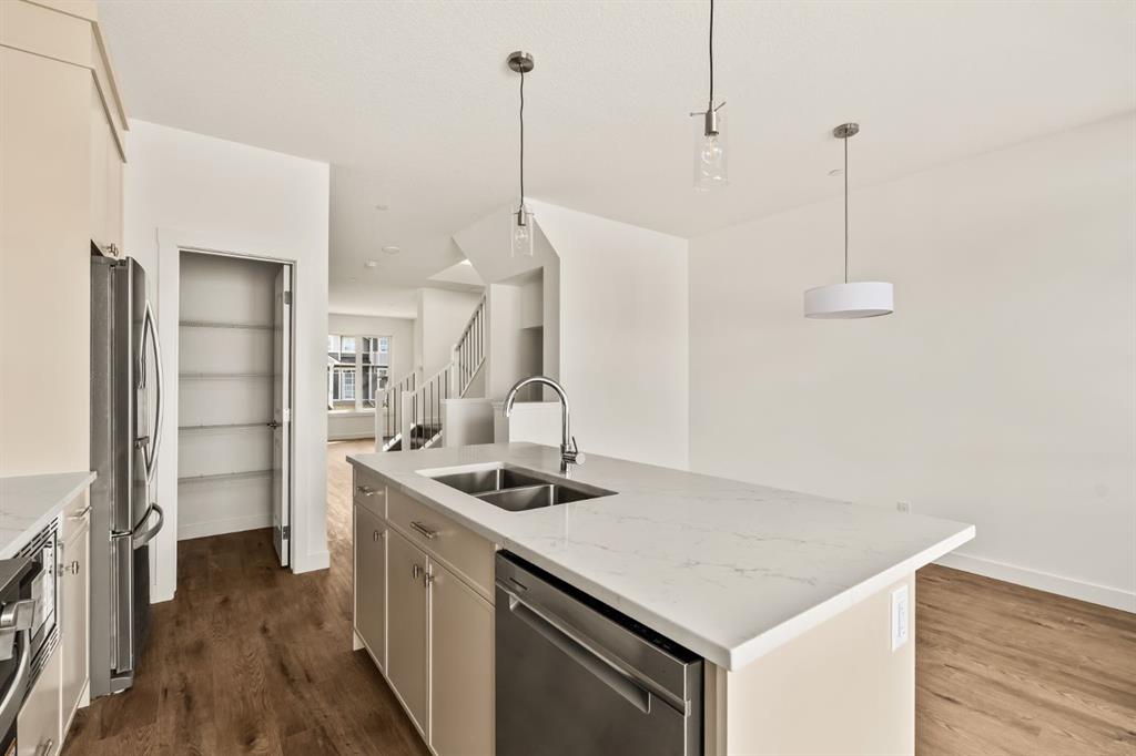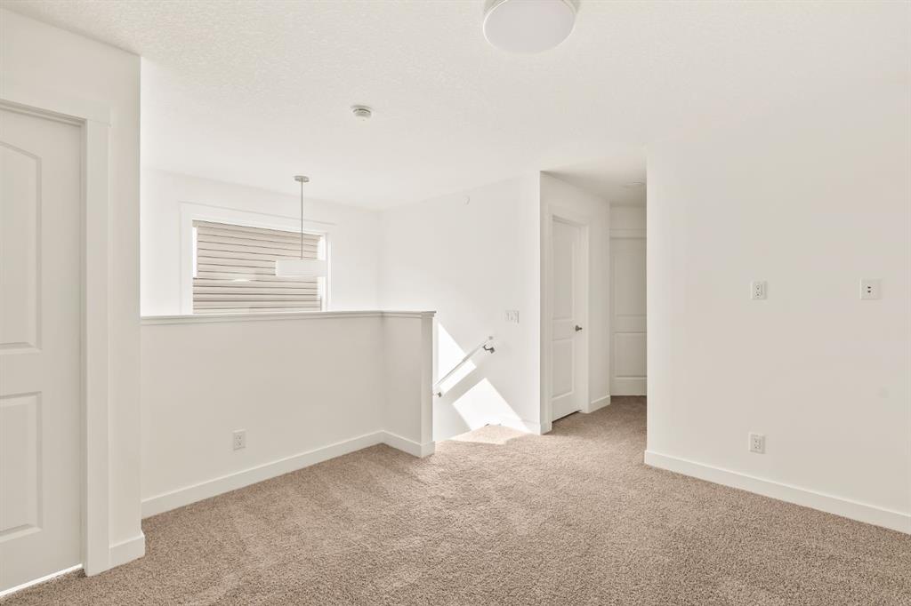 This beautiful, brand-new home is fronting onto a green space and has been intelligently designed to offer 3 bedrooms, 2.5 bathrooms, two distinct living areas, and is located in desirable Livingston! The 'Wicklow' model by Brookfield Residential is the perfect modern design, providing nearly 1,700 square feet of thoughtfully developed living space spread over two levels and includes a single garage with parking pad. The main floor boasts expansive southeast-facing front windows allowing natural light to flood the living space all day long. The open-concept layout is enhanced by 9-foot ceilings, offering a bright, comfortable living environment. The kitchen is a standout with full-height cabinetry, a large central island, a large corner pantry, and a complete suite of stainless-steel appliances, including a French door fridge, range, chimney-style hood fan, and built-in microwave. The kitchen seamlessly flows into the dining area, with sliding patio doors leading out to the backyard—perfect for indoor-outdoor living. Upstairs, a central bonus room acts as a divider, offering privacy between the spacious primary suite and the two additional bedrooms. The primary suite features a walk-in closet, and a luxurious 4-piece ensuite with dual sinks. Two more bedrooms, a full bathroom, and an upper-level laundry room complete this level. The basement is ready for the new owner’s imagination. There is ample space for a generously sized living area, an additional bedroom, and a full bathroom. The backyard has ample space for the family and leads to the single detached garage with additional space for a vehicle and storage. This home comes with a builder's warranty, as well as the Alberta New Home Warranty, giving you peace of mind. Situated a short walk from a playground and quick access to the scenic walking paths of the community and residents association, this home offers a tranquil location. **Please note photos are from a show home model and are not an exact representation of the property for sale.