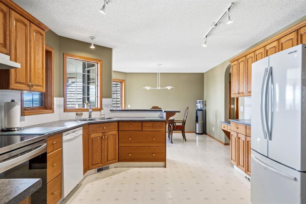 Welcome to 48 Headlands Close, where incredible views, thoughtful design, and everyday functionality come together in one of Cochrane’s most desirable communities. This beautiful custom-built home with rubber roof offers over 2,700 sq ft of bi-level living space, perfectly positioned to capture stunning PANORAMIC views of Cochrane and the Rocky Mountains. The best part of your day will be getting up in the morning and going out on your large covered deck to enjoy a coffee and watch as the morning sun lights up the mountains to the west. The main floor features a spacious living room with a gas fireplace, a dedicated dining room, a large kitchen with tons of cabinets and counter space, complete with a cozy breakfast nook that looks out onto the south-facing deck. Large windows throughout the home bring in natural light while showcasing the breathtaking scenery. The generous primary bedroom includes a walk-in closet and a 4-piece private ensuite. An additional bedroom, full bath, and convenient main floor laundry complete this level. Downstairs, the fully developed walk-out basement expands your living space with a large rec room featuring a wood-burning fireplace, two additional bedrooms, a full bathroom, and plenty of storage. Perfect for guests, family, or a home office setup. This reverse walkout exits through the 25 ft deep oversized garage, perfect for a workbench on the end or to park your full-size pickup truck! Step outside to the backyard and enjoy the large wrap around back deck that gives plenty of space to entertain or for kids and pets to run around and play in the fully fenced back yard. This elevated deck and outdoor living space truly set this home apart. Just down the street, you will find the outdoor winter hockey rink and large playground. This stunning home is only three to four blocks away from Cochrane’s Downtown coffee shops, bookstores, and healthcare.