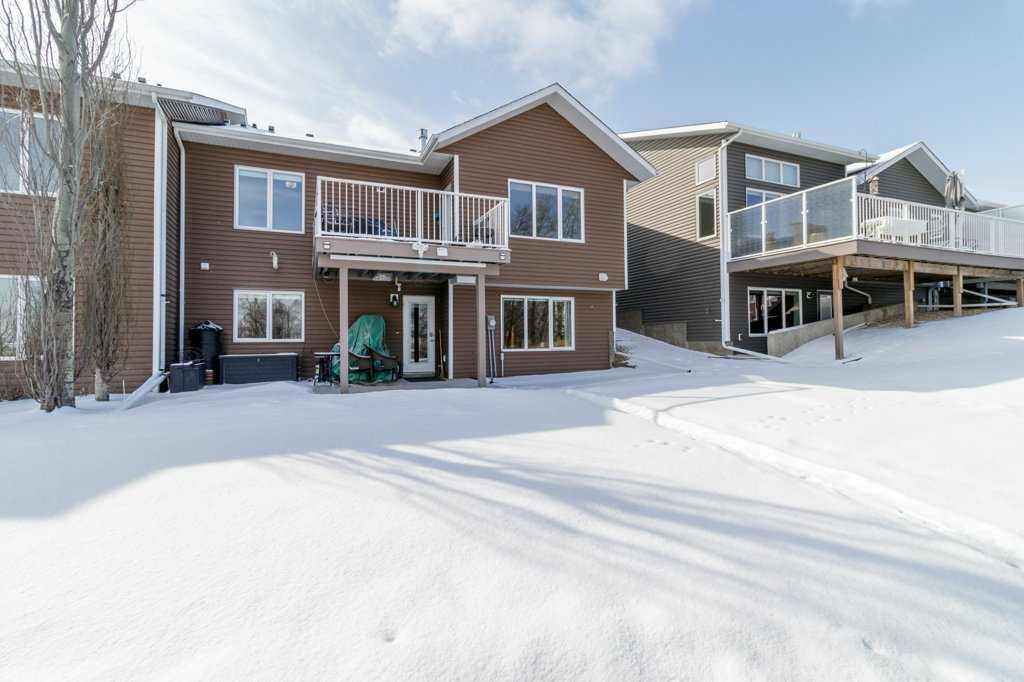 Located in the desirable town of Lacombe, this well-built half duplex bungalow by Colbray Homes offers a walkout basement and backs onto green space with direct access to scenic walking trails. The landscaped yard and peaceful setting make it easy to enjoy the outdoors right from your backyard. Inside, the main floor features high-end laminate and ceramic tile throughout, along with a bright, open layout and 9’ ceilings that create a spacious feel. The kitchen is thoughtfully designed with dark maple soft-close cabinetry, granite countertops, a Blanco under-mount sink with garburator, stove with gas hook up if desired, coffee bar, and a large island with overhang—perfect for entertaining. A walk-in pantry adds extra storage, while the separate main floor laundry room includes cupboards, counters, and a sink for added convenience. The living room is warm and inviting with a gas fireplace and mantle, plus a garden door leading to the deck where you can take in the views, complete with phantom screens. The main floor offers a spacious primary bedroom that easily accommodates a king-sized bed and includes a walk-in closet, along with an additional bedroom and a den, providing flexibility for guests or a home office. The 5-piece ensuite offers a relaxing retreat with a soaker tub, separate shower, double sinks, and a private water closet. Downstairs, the fully developed walkout basement features in-floor heat, a bright family room with access to the concrete patio and backyard, two additional bedrooms, a dedicated media room, a 4-piece bathroom, and plenty of storage in the mechanical room. Additional highlights include a high-efficiency furnace, high-efficiency hot water tank, R60 insulation, Greenbuilt certification, and a double attached garage that is insulated, drywalled, and roughed-in for gas heat. Professionally painted in neutral tones and showing like new, this home combines quality craftsmanship with modern comfort in a beautiful setting.