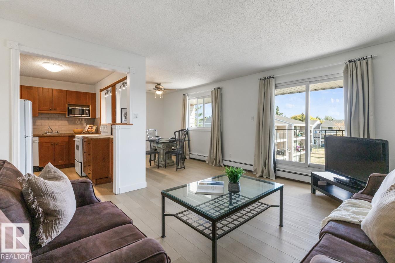 Move in ready! Nicely renovated & decorated 2 bedroom furnished suite. Brand new Vinyl Plank flooring throughout the suite & freshly painted. Entertaining size living & dining room with patio doors leading out to a full length deck. Kitchen cabinets have been upgraded with an extended bar type opening to the dining room. Two good size bedrooms & master features double closets. Full bathroom with upgraded cabinets. In-suite laundry. Walk in Storage room. Walk to Tim Horton's, Millbourne Market Mall, Restaurants, Schools, LRT, & Bus outside your door. Condo fees include heat, water, landscaping and snow removal