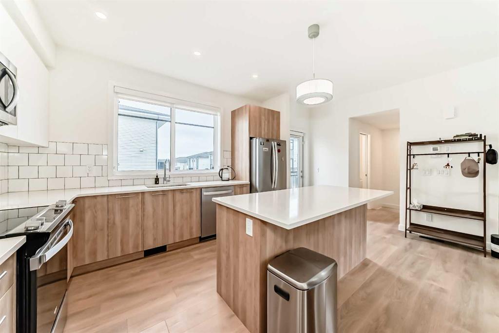 This gorgeous 2 bed, 2.5 bath townhome comes with a double attached garage and is located in the brand new master planned community of Belmont. The main level consists of an open plan with high ceilings, lovely vinyl plank flooring and large windows that bring in tons of natural sunlight. The kitchen is a chef's delight offering upgraded S/S appliances, custom cabinets, tiled backsplashes plus quartz counter-tops and a large center breakfast bar that overlook the spacious living room and separate dining area. Completing the main floor is a 2pc bath plus access to a huge 25' balcony off the kitchen with a BBQ gas line. Upstairs you will find 2 bedrooms (the most popular plan). The primary bedroom comes with a walk-in closet plus a good sized 3pc ensuite. Completing the upper floor is a 2nd bedroom plus a 4pc bath and laundry area. The ground level offers a beautiful landscaped/fenced front yard plus a large main entrance and a double attached garage with a man door. Amenities include exclusive access to the "Goodwin" outdoor living space including a park with picnic tables. Located close to schools, parks, major shopping and roadways plus a future Plaza scheduled to be completed in 2026.