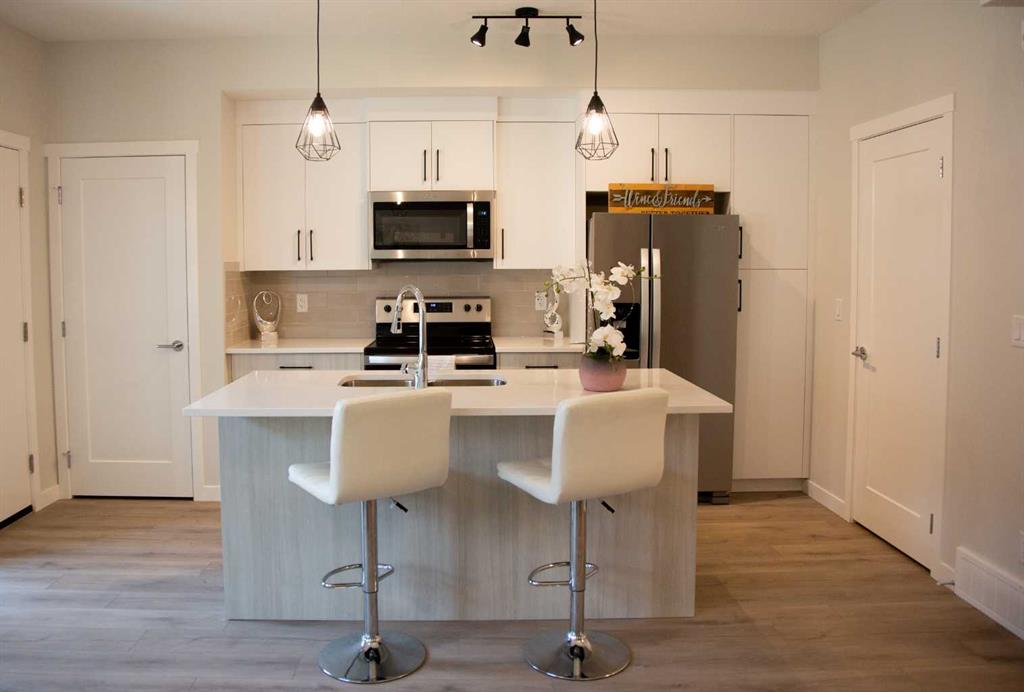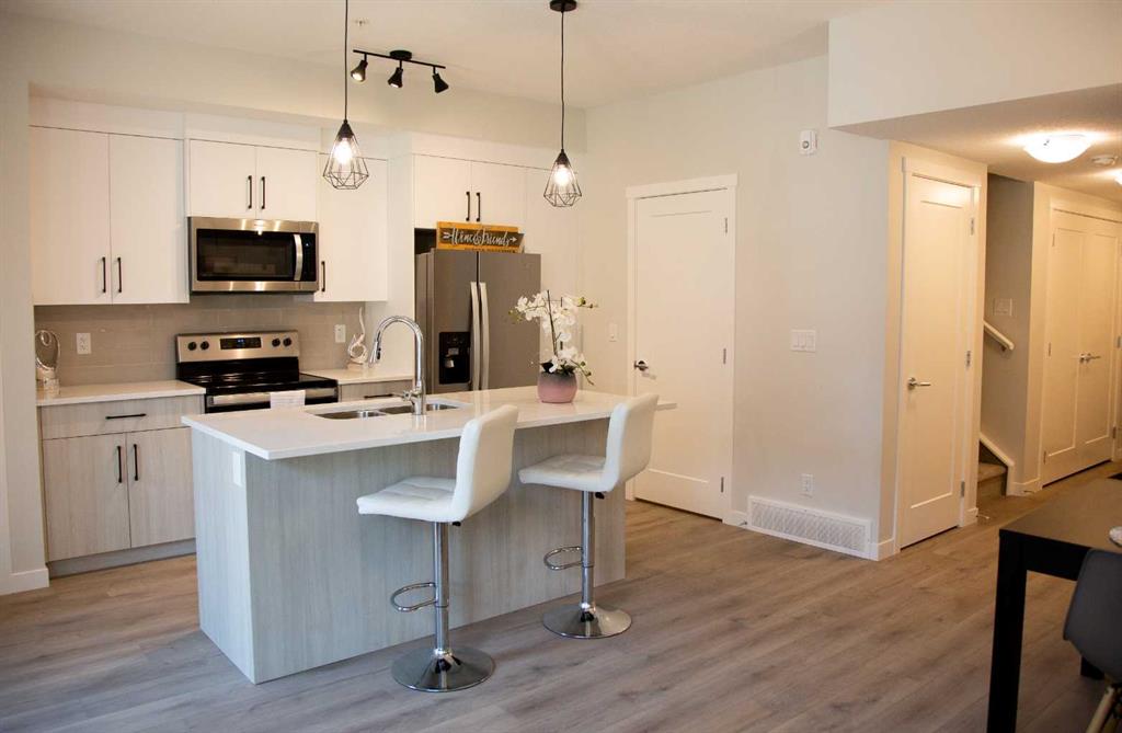 Welcome to modern luxury and comfort with this stunning brand new 2-bedroom, 1.5-bath townhome, designed to impress from the moment you walk through the door. Premium finishes, 9’ ceilings on both the main floor as well as the second floor, expansive windows that flood the space with natural light, and luxury vinyl plank flooring on the main floor creates an elevated living experience that’s both bright and sophisticated. The spacious open-concept layout flows seamlessly into a chef-inspired kitchen featuring quartz countertops and an upgraded fridge with a built in water and ice dispenser. Two generous bedrooms (King bed & Queen bed size) offer quiet comfort, complemented by stylish bathrooms with modern design details including quartz counters and a rain shower head. A garage parking spot is located steps to your back door.. you’ll enjoy unparalleled ease and everyday convenience year round. In-suite laundry, walk in closet, 2 coat closets, large kitchen pantry. Located in a desirable new community by a large park, schools, shopping, transit, and major routes—this home offers easy living in a prime location. This home combines contemporary design with functionality, making it the perfect choice for those who appreciate quality and style. Available for move-in before Christmas. This is your chance to secure a high-end rental that truly stands out. (Photos shown are of a townhome with the same interior layout with a slightly a different colour scheme.) Utilities Included: Gas/Heat & Water. Contact for more information,