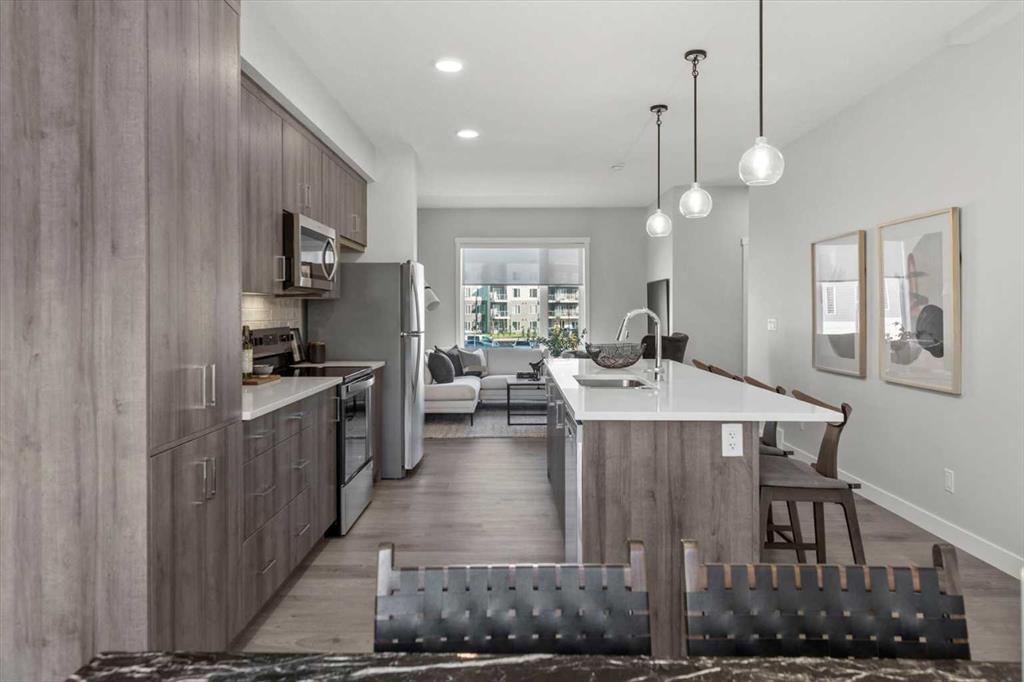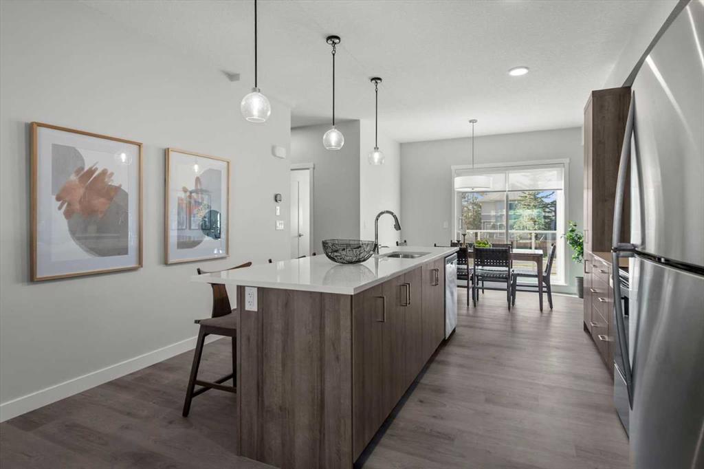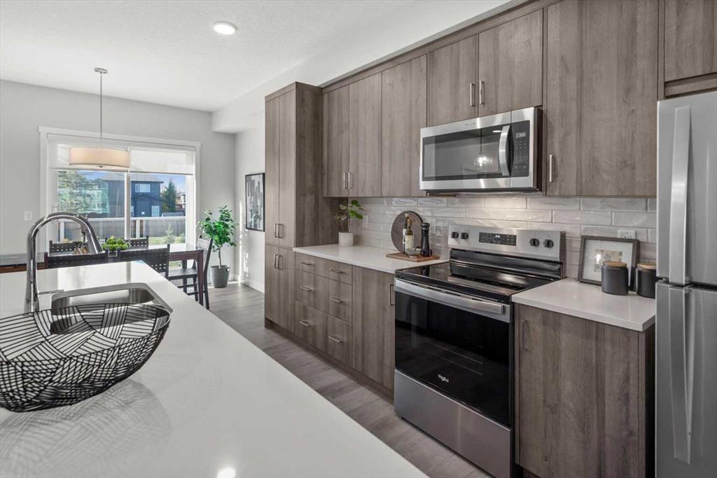 Discover contemporary living in this brand-new 2025-built townhome, ideally situated in the sought-after community of Shawnee Slopes in Southwest Calgary. With over 1,440 sq ft of thoughtfully designed space, this 3-bedroom, 2.5-bath home seamlessly combines modern style with everyday functionality. The open-concept main floor showcases a sleek, modern kitchen featuring rich cabinetry, premium stainless steel appliances, a built-in pantry, crisp white quartz countertops, and an oversized island that’s ideal for casual dining or entertaining. Dedicated west facing dining space and a bright spacious east facing living room allow sunshine to be enjoyed at all times of the day! Durable luxury vinyl plank flooring throughout all three levels creates a clean, cohesive aesthetic, while a neutral colour palette adds to the home’s timeless appeal. Step outside to a private west-facing balcony with no neighbours behind, complete with a gas line—perfect for effortless outdoor cooking and relaxation. Upstairs, you’ll find a well-appointed primary bedroom with ensuite, two additional well-sized bedrooms, full bath and the convenience of upper-level laundry. Additional highlights include air conditioning rough-in, a custom blind package, upgraded wall tile detailing in upper bathrooms, and an attached double tandem garage with extra storage and backyard access. Perfectly positioned near public transit, the CTrain, top-rated schools, shopping, dining, and the natural beauty of Fish Creek Park, this location also provides easy access to Stoney and Macleod Trail, the nearby YMCA, Costco and weekend getaways to the mountains.Whether you're a first-time buyer, investor, or looking for your next home, this pet-friendly property is a rare opportunity to own a brand-new townhome in one of Calgary’s most established and connected neighbourhoods.