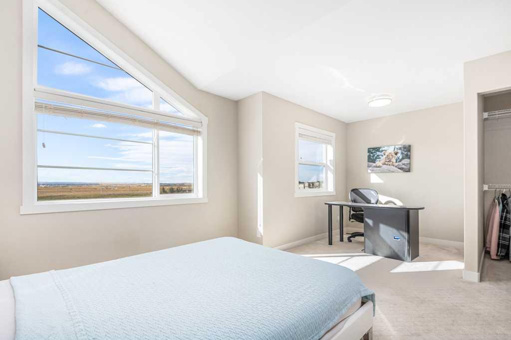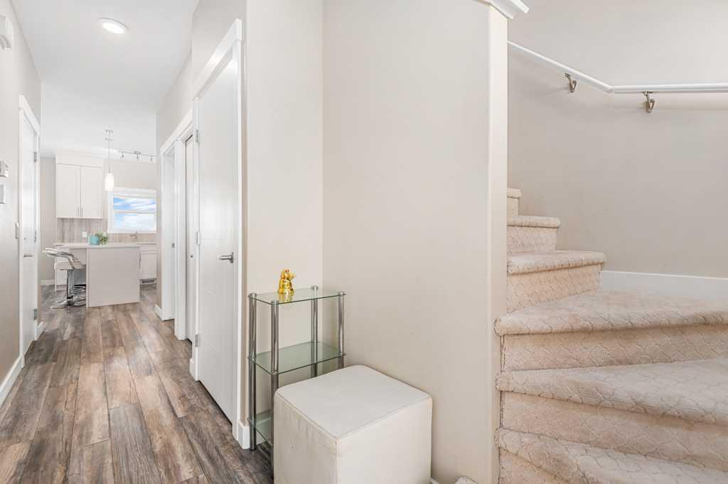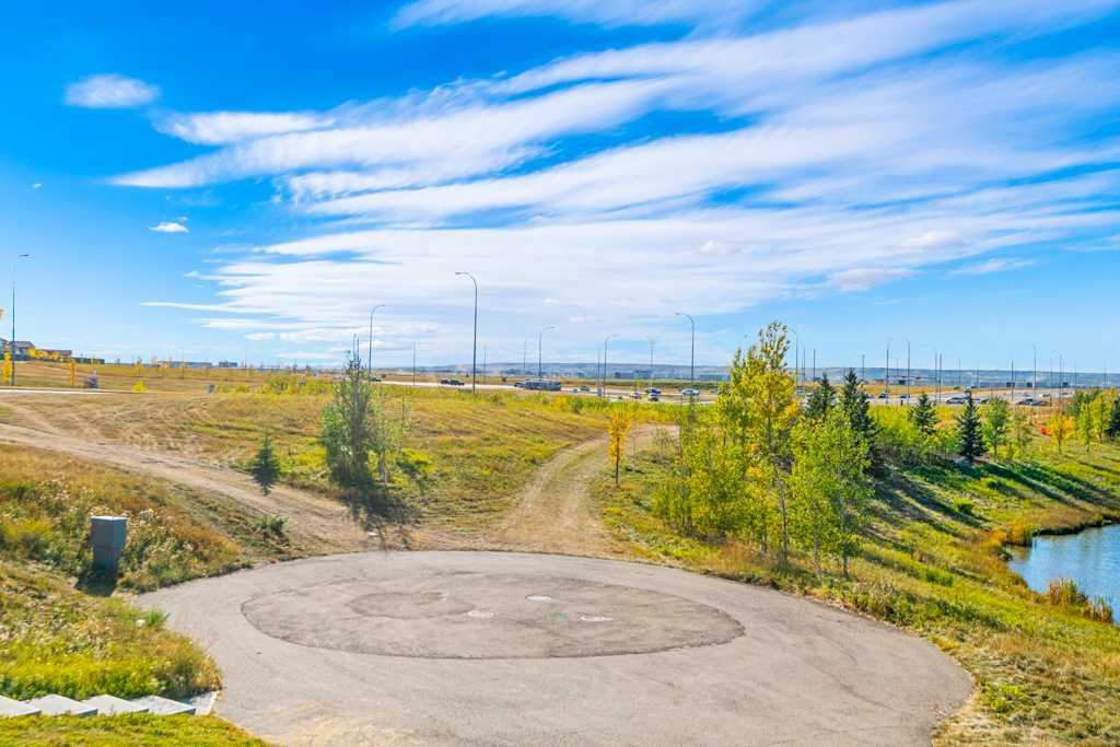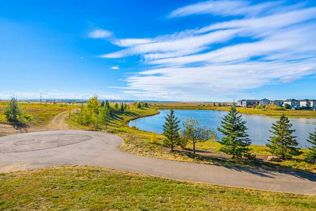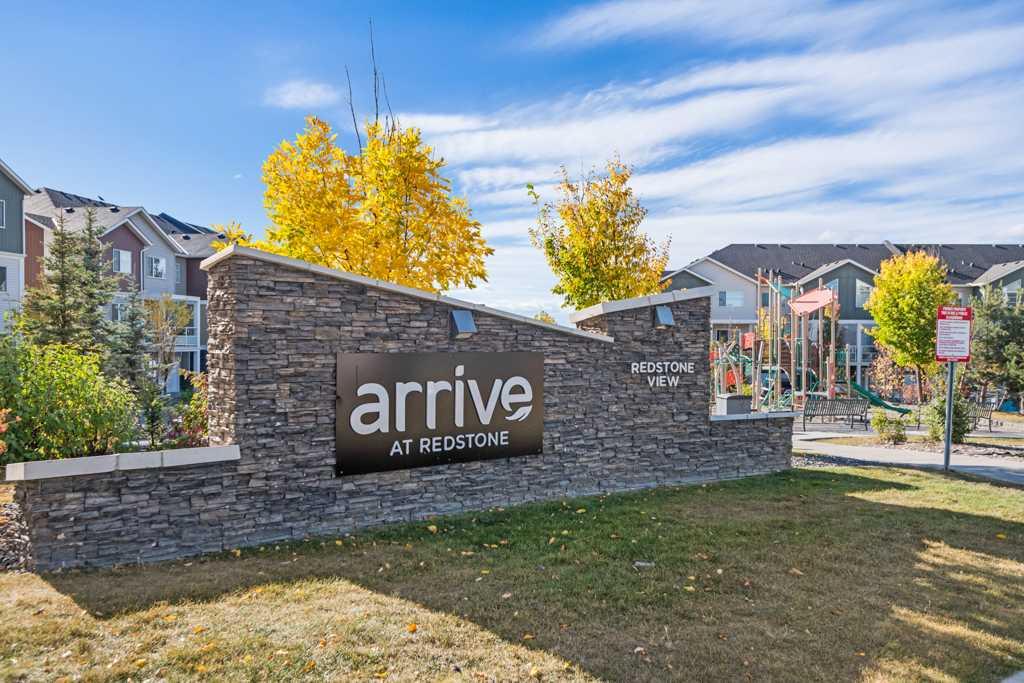 Welcome to this beautifully designed walkout townhome backing directly onto a tranquil pond and pathway system in the vibrant, amenity-rich community of Redstone. Offering low condo fees, Built Green® certification, and unobstructed mountain views, this home combines modern living with thoughtful sustainability. Step inside to discover soaring 9-foot ceilings and a bright open-concept main floor perfect for entertaining. The chef-inspired kitchen features upgraded 42” cabinetry, quartz countertops, a gas range, stainless steel appliances, and a generous island—ideal for casual dining and hosting. Step out onto your west-facing balcony, complete with gas line—perfect for BBQs and enjoying sunset views over the pond and Rockies. Upstairs, you’ll find two oversized primary suites, each with vaulted ceilings, private ensuites, and large windows framing peaceful water and mountain vistas. Upper floor laundry adds convenience to everyday living. The partially finished walkout level leads to a fenced and landscaped private patio backing onto the pond—your own backyard oasis with immediate access to trails and greenspace. An attached single garage and additional storage complete the lower level. Perfectly located with quick access to Stoney Trail, Deerfoot Trail, the Calgary International Airport, and CrossIron Mills, this home is also just minutes from parks, playgrounds, Redstone View Lake, a future C-Train station, and a new school currently planned within walking distance—making it ideal for families and future resale value. Whether you’re looking for your first home, a downsized lifestyle, or a low-maintenance investment in a growing community, this home offers mountain views, nature on your doorstep, and effortless connectivity. Your Redstone lifestyle begins here.
