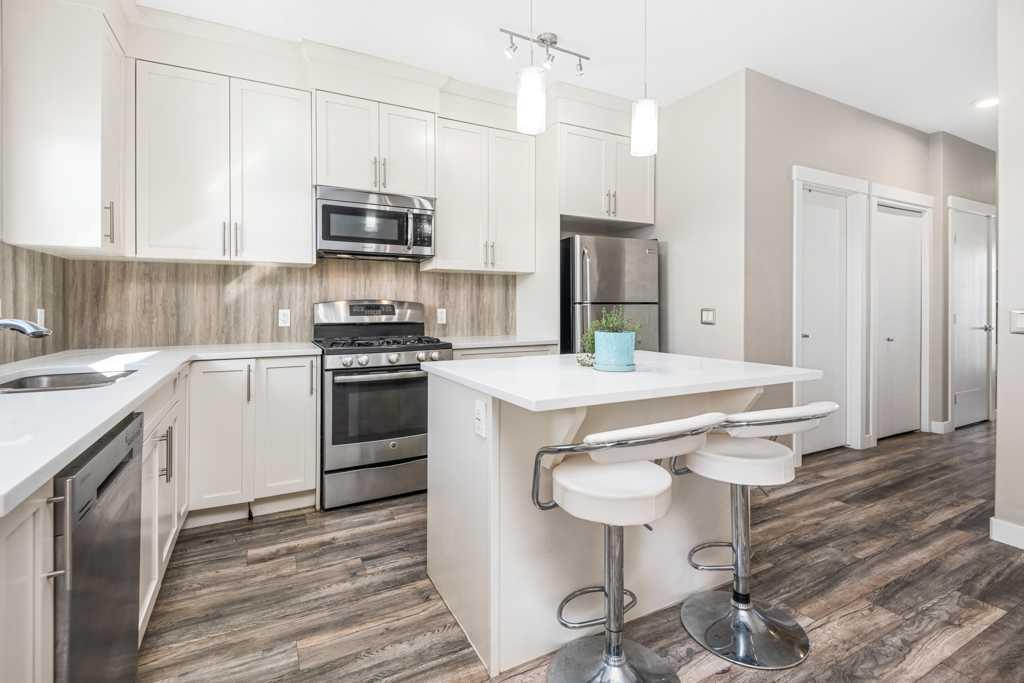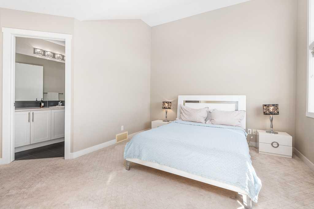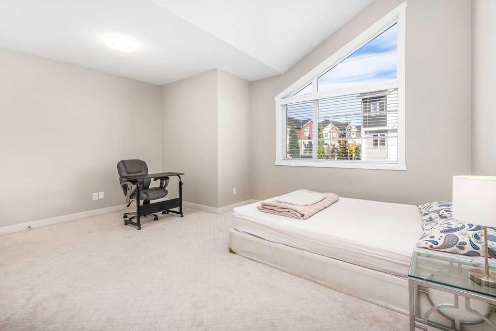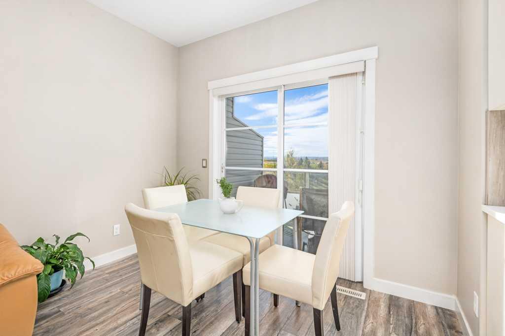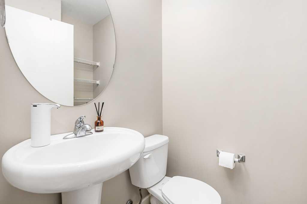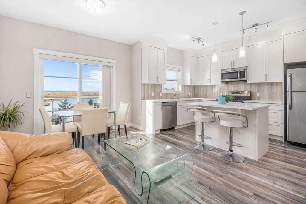 Welcome to this beautifully designed walkout townhome backing directly onto a tranquil pond and pathway system in the vibrant, amenity-rich community of Redstone. Offering low condo fees, Built Green® certification, and unobstructed mountain views, this home combines modern living with thoughtful sustainability. Step inside to discover soaring 9-foot ceilings and a bright open-concept main floor perfect for entertaining. The chef-inspired kitchen features upgraded 42” cabinetry, quartz countertops, a gas range, stainless steel appliances, and a generous island—ideal for casual dining and hosting. Step out onto your west-facing balcony, complete with gas line—perfect for BBQs and enjoying sunset views over the pond and Rockies. Upstairs, you’ll find two oversized primary suites, each with vaulted ceilings, private ensuites, and large windows framing peaceful water and mountain vistas. Upper floor laundry adds convenience to everyday living. The partially finished walkout level leads to a fenced and landscaped private patio backing onto the pond—your own backyard oasis with immediate access to trails and greenspace. An attached single garage and additional storage complete the lower level. Perfectly located with quick access to Stoney Trail, Deerfoot Trail, the Calgary International Airport, and CrossIron Mills, this home is also just minutes from parks, playgrounds, Redstone View Lake, a future C-Train station, and a new school currently planned within walking distance—making it ideal for families and future resale value. Whether you’re looking for your first home, a downsized lifestyle, or a low-maintenance investment in a growing community, this home offers mountain views, nature on your doorstep, and effortless connectivity. Your Redstone lifestyle begins here.