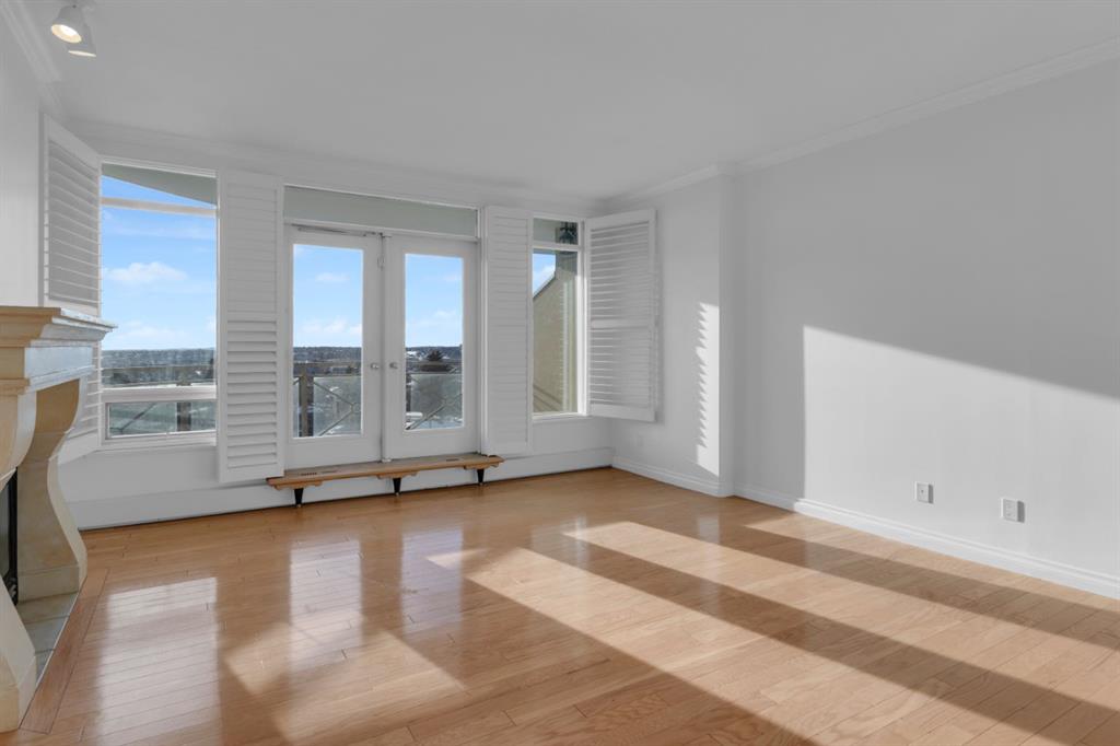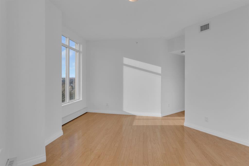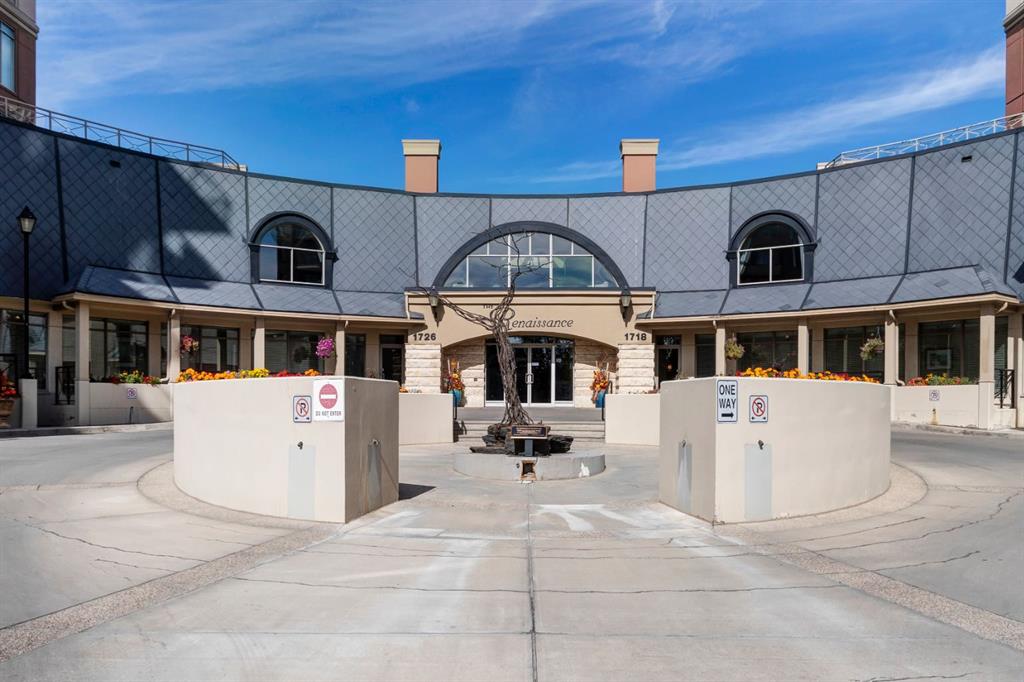 Spectacular panoramic mountain and downtown city views! Large bright southern windows fill this immaculate updated 1300 sq.ft. home with natural light all day. Impressive luxurious hardwood floors in large, open and very functional living and bedroom areas. Ample space for a full dining suite and a comfortable size living room for entertaining friends and family. Plus a discreetly located den for home office or extra in suite storage. Sunrise breakfast and bbq balcony, 2 spacious bedrooms, 2 full baths, in suite laundry. This freshly painted home has multiple significant updates including; hardwood, white kitchen with quartz, completely redone 5 piece en suite with glass shower, double vanity and soaker tub. New vinyl plank bathroom flooring, and brand new microwave hood fan. 2 titled underground parking stalls with nearby oversized private enclosed storage room. You will love your carefree lifestyle in The Renaissance, one of Calgary’s most desirable premier adult living condo buildings with an extensive list of amenities. Bright well equipped gym and exercise area, guest suites, movie theatre, party room, arts + crafts space, games room, library, car wash bay, heated visitors parking, an expansive common area green space terrace and walk to do grocery shopping though private, secure heated indoor access into North Hill Mall. You will feel at home with the quality of this complex from the moment you walk into the airy vaulted lobby and greeted by the friendly and helpful full time concierge. Truly unbeatable value…just move in, relax and enjoy…you’ve earned it!