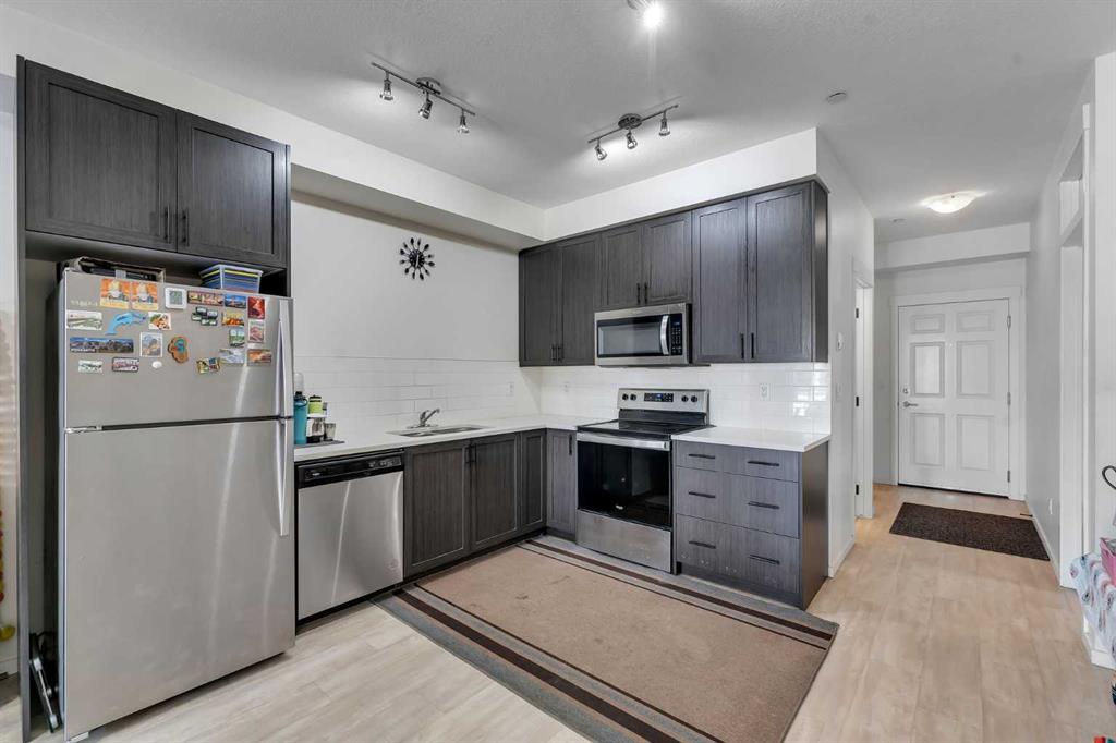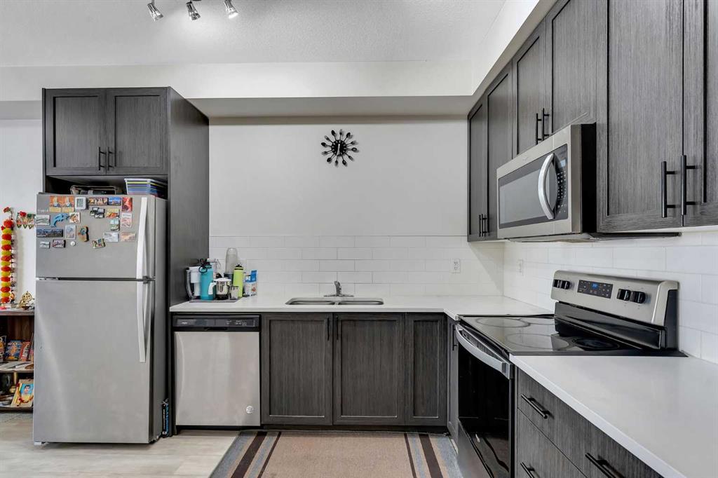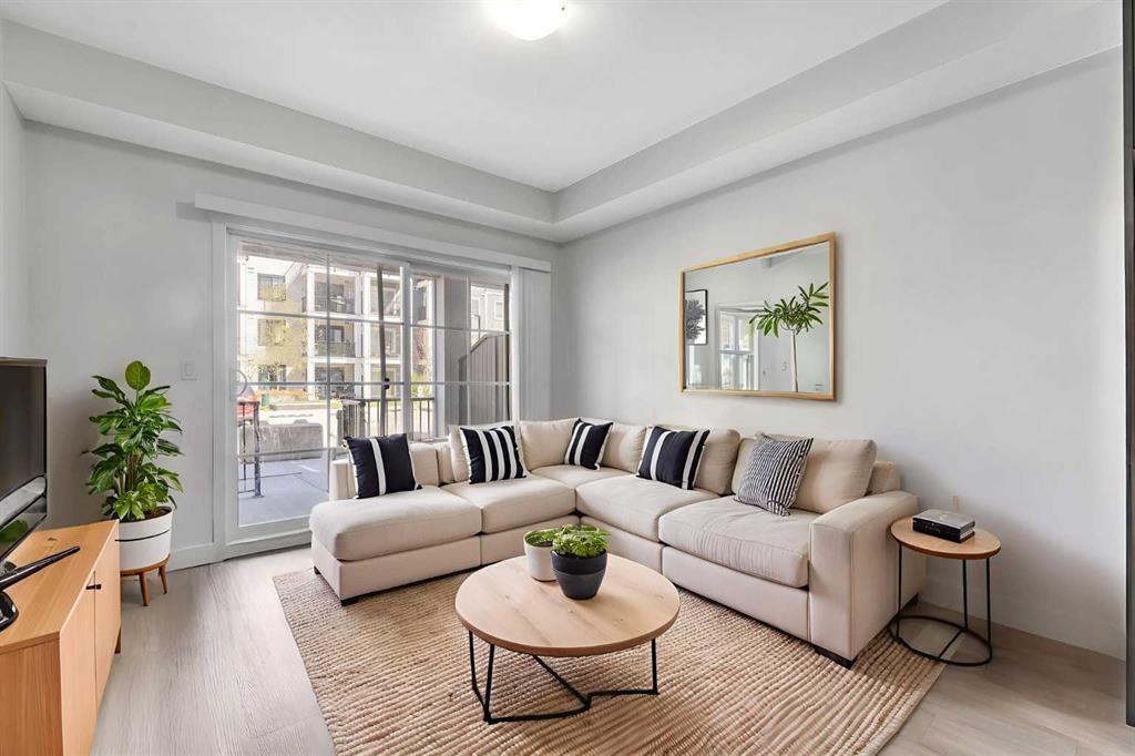 WELL-MAINTAINED | LOW CONDO FEES | OVERSIZED GROUND FLOOR PATIO | SEPARATE EXTERIOR ENTRANCE | UNDERGROUND PARKING & STORAGE | QUARTZ COUNTERTOPS | BBQ GAS LINE ON THEE PATIO | STAINLESS STEEL APPLIANCES. Welcome home to this incredibly well maintained condo with upgraded builder finishes! The open floor plan, high ceilings and large windows complement the size of the condo. The kitchen is finished with quartz countertops, stainless steel appliances, full height cabinets. The bedroom has a deep walk-in closet and private 4pc ensuite bath with a tub/shower combo. The in-unit laundry is an added bonus. This unit features a titled underground parking steps from Township Shopping Centre, with a variety of retail stores, dining options, and everyday conveniences. Legacy features a stunning 300-acre protected environmental reserve in Pine Creek Valley, offering a peaceful retreat with scenic pathways and green spaces. Schedule a viewing today and experience the perfect blend of comfort, style, and convenience! Disclosure: Some of the pictures in the listing has been virtually staged.
