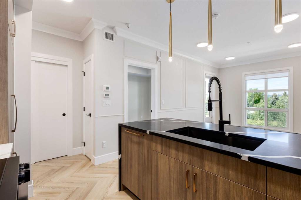 Welcome to the “Verde” floorplan by Rohit Homes—a thoughtfully designed 1-bedroom + den, 1-bathroom residence that perfectly balances comfort and style. Ideally situated on the 5th floor of Quesnay at Currie Barracks, this elevated home offers enhanced privacy along with beautiful natural light and west-facing views. Finished in the timeless Neoclassical Revival color palette, the interior showcases warm, refined tones and elegant detailing that create a sophisticated yet inviting atmosphere. The Verde floorplan is designed with both aesthetics and practicality in mind, featuring 9’ ceilings, quartz countertops with a waterfall edge, a coordinating quartz backsplash, full-height cabinetry, stainless steel appliances, designer light fixtures, and window coverings. The open-concept layout seamlessly connects the kitchen, dining, and living areas, making the space feel bright and expansive—perfect for entertaining or quiet evenings at home. The primary bedroom serves as a relaxing retreat, while the versatile den provides flexibility for a home office, study space, or additional storage. The bathroom offers a spa-inspired feel with fully tiled walls, polished finishes, and a tub/shower combination. Step outside onto your private west-facing balcony to enjoy sunset views and fresh air from your 5th-floor vantage point. This pet-friendly and AIRBNB-friendly building includes titled heated underground parking and ample visitor parking. Located just minutes from downtown, Mount Royal University, and the vibrant amenities of 17th Ave and Marda Loop, the Verde floorplan offers exceptional urban convenience paired with refined design. Don’t miss your opportunity to own this beautifully finished 5th-floor home. **Photos are taken from existing buildings of the same models and are not of the exact unit.**