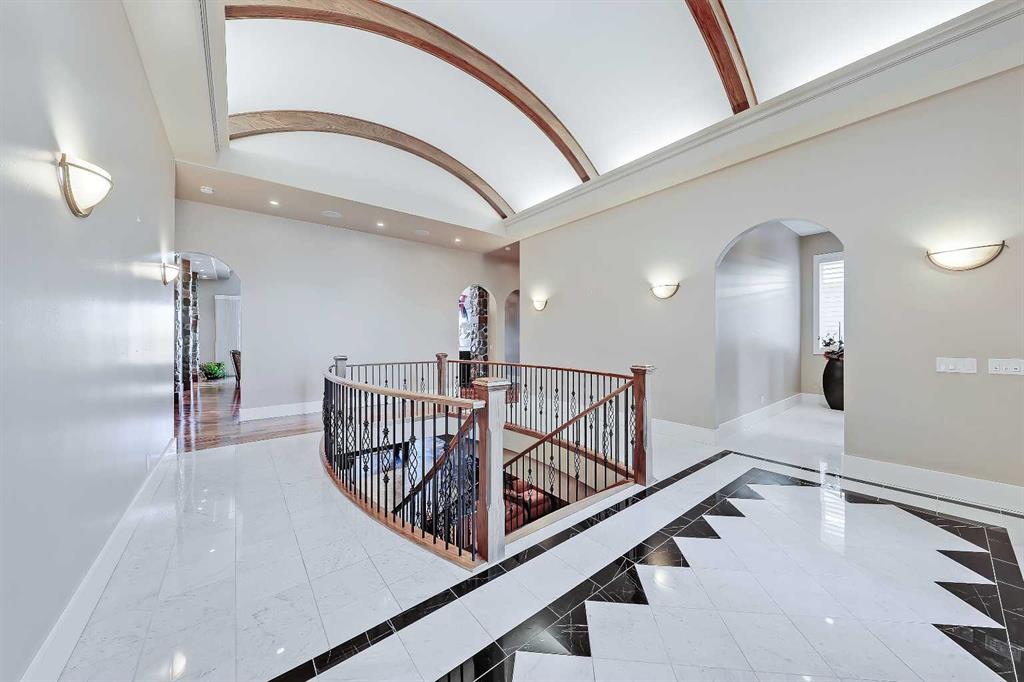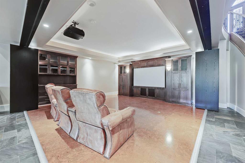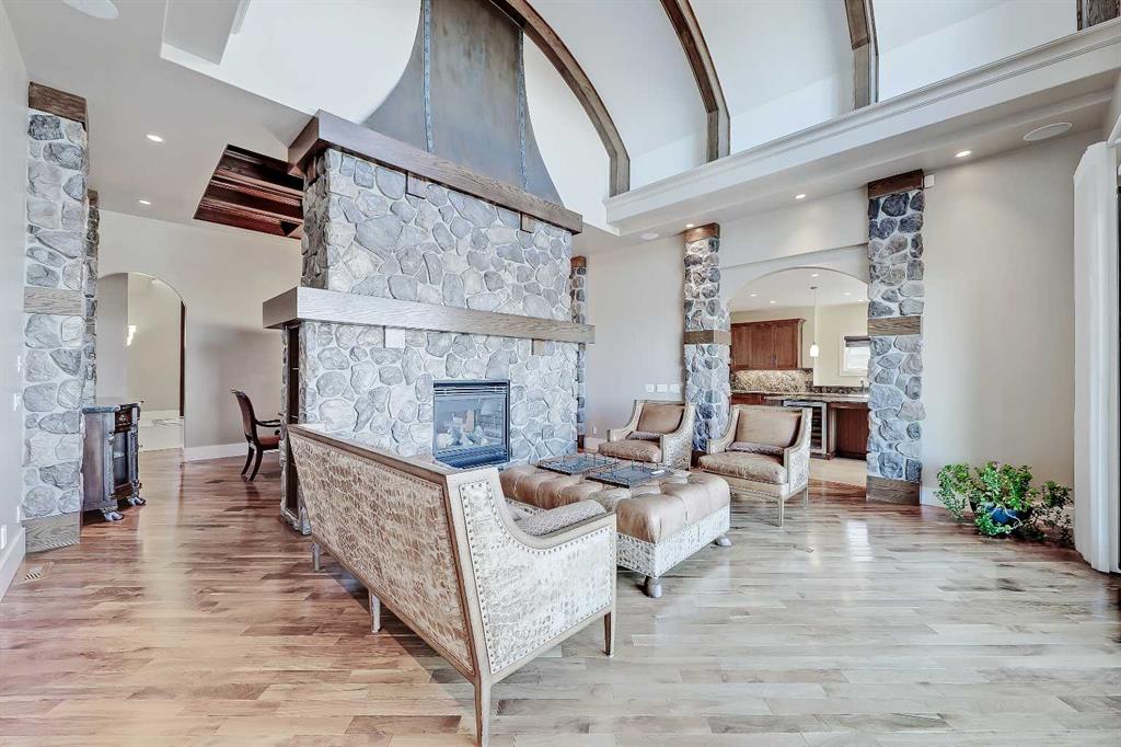 Wake up to sweeping mountain views from this timeless luxury home in prestigious Springbank Hill. Offering nearly 6,200 sq ft of refined living space across all levels, this residence blends classic design with modern comfort on a beautifully landscaped 0.30-acre lot surrounded by mature trees and lush greenery. The grand foyer sets the tone with an 18’ barrel-vault ceiling and Carrara marble floors, leading to a formal dining space with coffered ceilings and a custom stained-glass feature, and an elegant living room anchored by a 2-way fireplace and soaring barrel vault ceilings. West-facing windows frame mountain and community vistas, while French doors extend the living space outdoors to a massive private deck—perfect for evening relaxation or quiet entertaining that is virtually invisible to both neighbours. A gourmet kitchen anchors the home with custom hardwood cabinetry, dual islands, and premium appliances from Wolf, Sub-Zero, and Miele. The thoughtful layout also features a bright and airy breakfast nook and a walk-in pantry. Just off the kitchen is the full laundry room and mudroom that connects to the oversized triple garage. It features epoxy floors, a dog wash, and direct basement access, as well as additional side and front door access. The private main floor primary suite offers a serene retreat with a corner fireplace, private deck access, and a spa-inspired 5-piece ensuite featuring a steam shower, soaker tub, and dual vanities. Plus, a fully equipped walk-in closet features floor-to-ceiling storage for endless organization. Upstairs, a versatile loft with vaulted ceilings, skylights, and a fireplace offers an ideal office, library, or additional bedroom option, complete with its own 2-piece bathroom. The fully developed walkout basement is designed for both leisure and entertaining, featuring a large rec room with custom cabinetry and a wet bar, a dedicated home theatre and with some imagination, could be converted into a full-scale golf simulator! The basement also has two oversized bedrooms with private ensuites and walk-in closets. The basement also features a Tuscan-inspired full bath, perfect for showering off from the included hot tub. Outside, mature landscaping creates a private, forest-like setting, putting green, featuring a west-facing upper deck, a walkout lower patio with a hot tub, and a full-size putting green—all surrounded by stone accents and ambient lighting. Additional highlights include four fireplaces, in-floor heating, a Kinetico Water System throughout, dual central A/C, dual water tanks, high-efficiency systems, integrated home automation and security, and a durable clay tile roof. Every element reflects exceptional craftsmanship and enduring quality. Located moments from Aspen Landing, top-rated schools, and major routes, this home combines elegance, comfort, and convenience. Rarely does a residence with such commanding views and thoughtful design become available—experience the best of Springbank Hill living today.