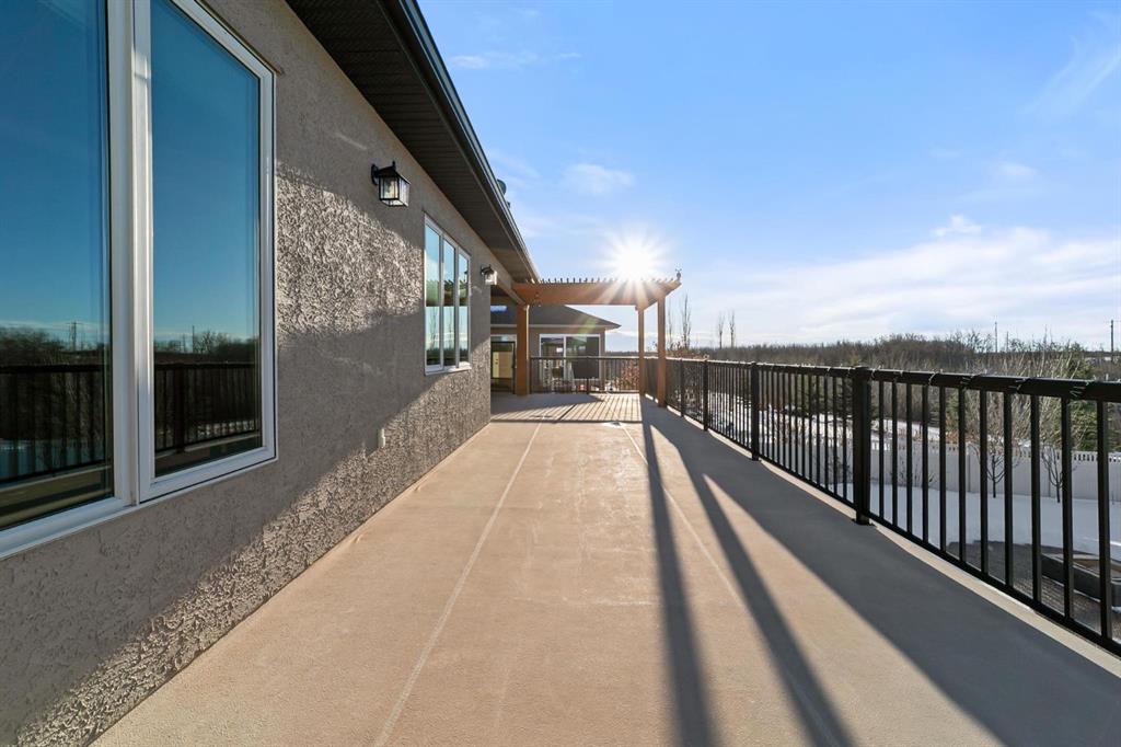 Experience unmatched views and exceptional craftsmanship in this stunning custom-built walkout bungalow, perfectly positioned in Valleyview overlooking the breathtaking valley landscape. Offering 3 bedrooms, 3 bathrooms, this home blends elegance, comfort, and thoughtful design across a bright, open-concept floor plan. Expansive windows flood the space with natural light—complemented by coffered ceilings, motorized blinds, and rich hardwood flooring. The impressive great room showcases a striking stone fireplace and open staircase framing panoramic views. The chef-inspired kitchen features granite countertops, a large entertaining island, 36” gas cooktop, built-in oven and microwave, and a spacious walk-in pantry. The adjoining dining space extends to a wrap-around covered deck, offering year-round enjoyment and remarkable valley scenery. The luxurious primary suite is a private retreat complete with spa-style ensuite and walk-in closet, with main-floor laundry and air conditioning adding everyday convenience. The fully finished walkout basement is designed for living and entertaining—featuring in-floor heat, a generous media/games area, additional bedroom and den, and a second stone fireplace. Step outside onto the covered patio with hot tub and firepit, perfect for unwinding or hosting guests. Sitting on a beautifully landscaped oversized lot with full irrigation, greenhouse, and storage shed, this home also includes an oversized heated 4-car garage with epoxy flooring. Exterior CHIC Permanent Stucco Protection offers lasting peace of mind with warranty. A rare opportunity to own a premier walkout bungalow with incredible views, premium finishes, and every detail considered—welcome home.