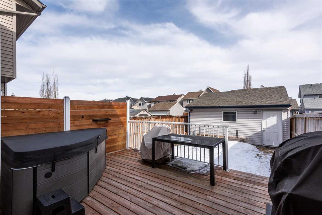 Featuring 3.5 BATHROOMS, a cozy GAS FIREPLACE, a DEVELOPED BASEMENT, and a dream 20' x 26' OVERSIZED HEATED DOUBLE GARAGE, this home offers the space and functionality you’ve been looking for. The main floor showcases a bright, open-concept layout with west-facing windows that fill the spacious living room with natural light. A gas fireplace adds warmth and charm, creating the perfect space to relax or entertain. The kitchen is beautifully finished with plenty of countertops, a stylish tile backsplash matching the fireplace, abundant espresso-stained cabinetry, and a pantry cupboard. The fridge was new in 2022, and the dishwasher in 2024. You’ll love the bay window dining area overlooking the backyard, complete with a deck, lawn, and an easy maintenance bromine hot tub with privacy fencing — ideal for a spa night at home! The rear mudroom and powder room provide convenient access to both the yard and garage. Upstairs features two primary bedrooms with room for king beds, each with its own walk-in closet and private ensuite — a rare and desirable layout. The developed basement offers a large recreation room, a full bathroom, generous storage, and a laundry/utility area. (Just add your preferred flooring to make it your own.) The basement also has an egress window, so the space could also easily be utilized as a 3rd bedroom! The oversized 20' x 26' heated garage is off a paved lane and easily accommodates two trucks while still leaving room for a workshop or additional storage. Located on a quiet street in sought-after Elgin, part of the award-winning community of McKenzie Towne, you’re within walking distance to shops, schools, transit, parks, pathways, and just minutes to High Street’s restaurants and amenities. This home has been well cared for with many parts of the home freshly painted for the new owners, professionally cleaned, and LED bulbs throughout the house for long-lasting life and good economy. Move in and Enjoy!