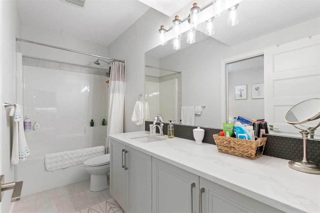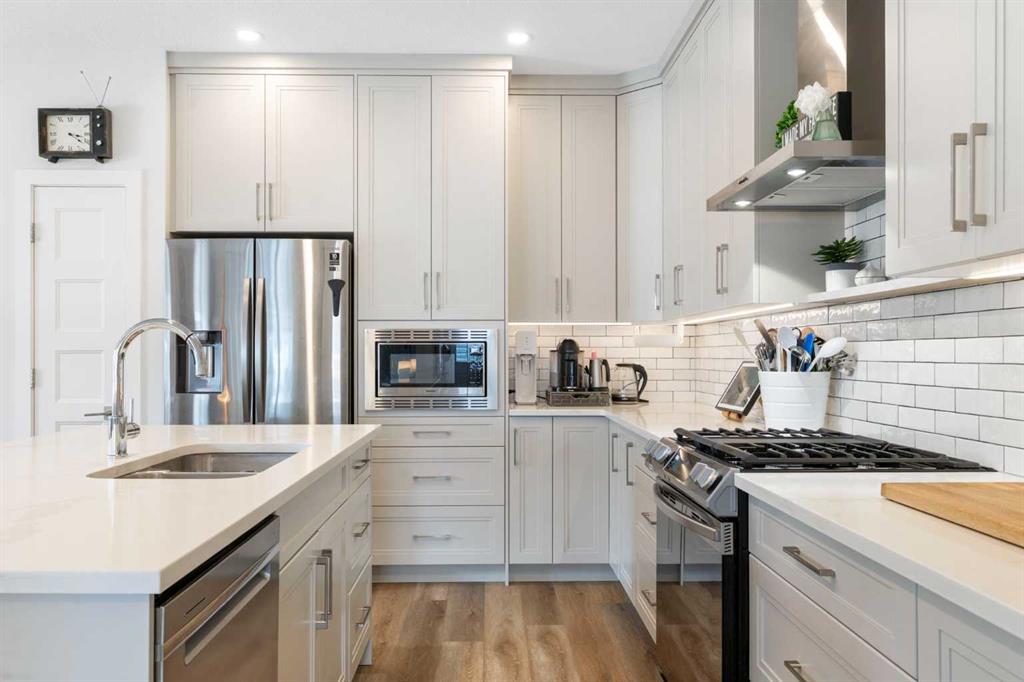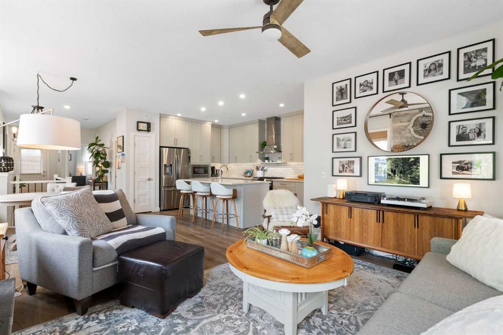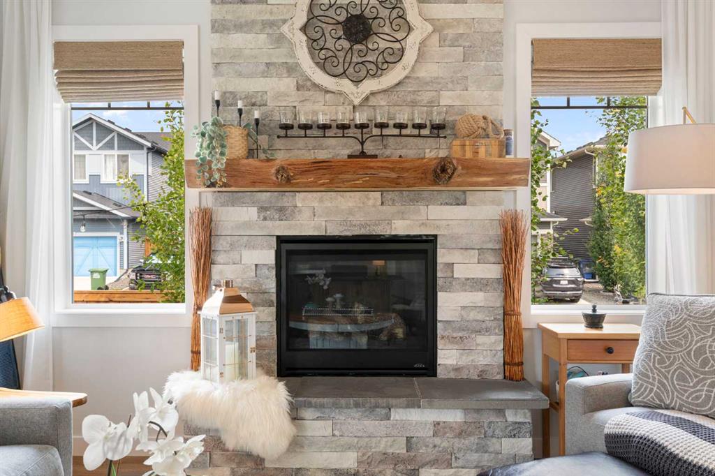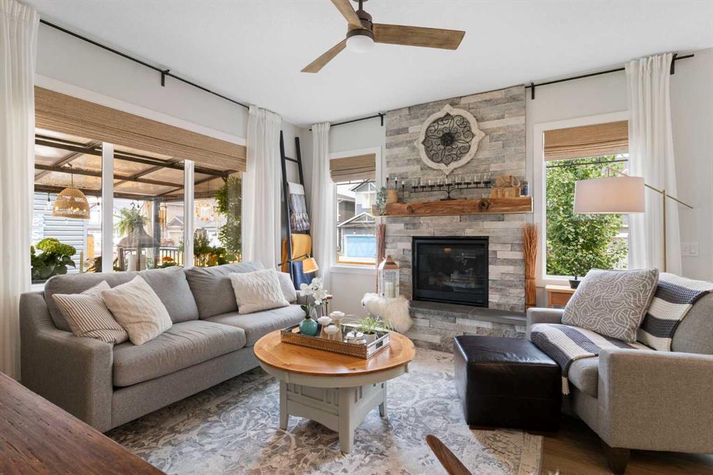 ** Open House: Saturday, Feb. 28th | 3:45 to 5:30 pm ** Welcome to 6 Emberside Hollow, a bright corner-lot bungalow located in the heart of Cochrane’s sought after Fireside community. Offering just over 2,030 square feet of well-designed living space, this home delivers modern finishes paired with everyday functionality. The main floor is airy and welcoming with 9ft ceilings, wide plank luxury vinyl flooring, and oversized windows that flood the space with natural light. The kitchen is designed to impress, featuring full height soft grey cabinetry with undermount lighting, quartz countertops, stainless steel appliances, a gas range, an undermount sink, and a large island with seating for three. Just off the kitchen, the dining nook includes a built-in bench with pull out drawers for added storage and convenience. The living room is anchored by a striking floor to ceiling brick fireplace, while a convenient half bath and functional mudroom help keep daily life organized. The primary bedroom is a comfortable retreat with a walk-in closet and spa-inspired ensuite offering dual sinks, a spacious tiled shower with bench, and a glass door. The bedroom window is tinted for added privacy without sacrificing natural light. A metal spindle railing leads to the fully finished lower level, where 9ft ceilings create a spacious family room ideal for movie nights, games, or play space. Two generous bedrooms share a stylish 4 piece bathroom, and a dedicated home office with wall to wall desk and shelving provides a perfect work from home setup. Outside, the fully fenced yard is designed for easy enjoyment. Low maintenance artificial turf eliminates mowing, while an irrigation system services the flowerbeds and planters. Landscape lighting enhances evening ambiance, and a circular gas fire pit creates a natural gathering space. The detached 22' × 22' garage features high ceilings, two large windows, 30-amp 120/240-volt service, a 240-volt heater, overhead storage racks, and a built-in workbench, making it ideal for vehicles, hobbies, and storage. The additional gravel parking pad offers excellent flexibility for extra vehicles, a trailer, or RV, with a gate that opens to allow for longer RV parking. Fireside is known for its walkable pathways, playgrounds, pump track, new skateboard park, and proximity to Fireside School (K–8), Holy Spirit Catholic School (K–6), local coffee shops, and the Emberside commercial plaza. With Highway 22 just minutes away, Calgary and the mountains are both easily accessible. Offering single level living, modern finishes, an entertainer friendly backyard, and a vibrant neighbourhood setting, 6 Emberside Hollow is a home you will love coming back to.
