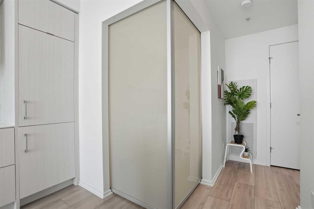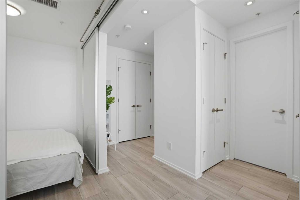 Welcome to this standout 6th floor residence at Verve in East Village, thoughtfully designed as one of the building’s most sought-after layouts. Originally featured as the builder’s show suite, this floor plan was chosen for its exceptional flow, functionality, and livability, and it truly stands apart from other units in the building. Offering 1 bedroom plus a spacious den, this home delivers all the space you need without paying for a second bedroom. The den is generously sized and can comfortably fit a king sized bed plus end table. Making it ideal for guests, a home office, or flexible living that rivals a true two bedroom layout. Inside, you’re welcomed by a smart, open-concept design with no wasted space. Unlike many comparable units, there are no long hallways or awkward corners, allowing for a larger, more functional living area. Floor-to-ceiling windows bring in an abundance of natural light, while modern finishes, in suite laundry, and air conditioning ensure everyday comfort. Step outside to your covered balcony, perfect for relaxing or entertaining year-round. Storage is a rare highlight here, with four deep closets throughout the unit, offering more capacity than most similar condos and even competing with many two bedroom layouts. The attention to detail continues with a dedicated storage locker located in a clean, enclosed room on P3, providing a more secure and private alternative to typical parkade storage. Positioned on the 6th floor, this unit offers the perfect balance, not too low, not too high, with direct access to Verve’s best amenities just steps from your door. Enjoy the fully equipped fitness centre, party room, library, and expansive outdoor terrace without ever needing to wait for an elevator. Verve is known for its full concierge service and exceptional lifestyle offerings, including a stunning rooftop terrace on the 25th floor with panoramic views of downtown Calgary, the Bow River, and the mountains. Located in the heart of East Village, you’re just steps from RiverWalk, the CTrain, Superstore, cafes, restaurants, and everyday conveniences, making this one of Calgary’s most walkable and dynamic communities. This unit includes titled underground parking, a separate storage locker, secure visitor parking, and is pet friendly and approved for mid-term rentals, offering incredible flexibility for both homeowners and investors. A rare opportunity to own one of Verve’s best layouts, combining smart design, exceptional storage, and unbeatable access to amenities.