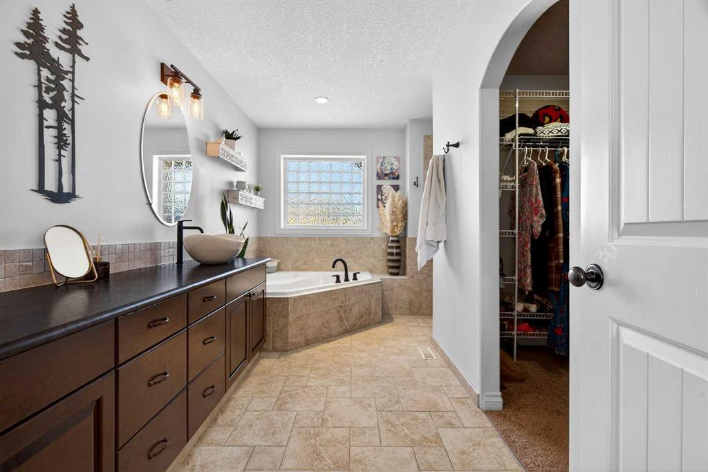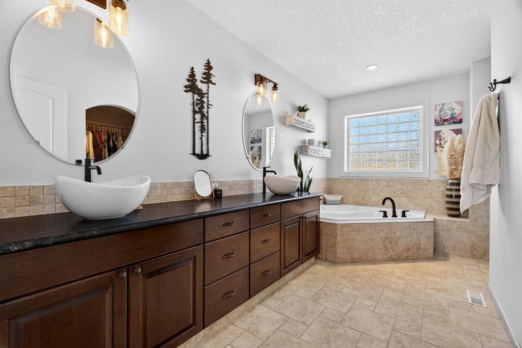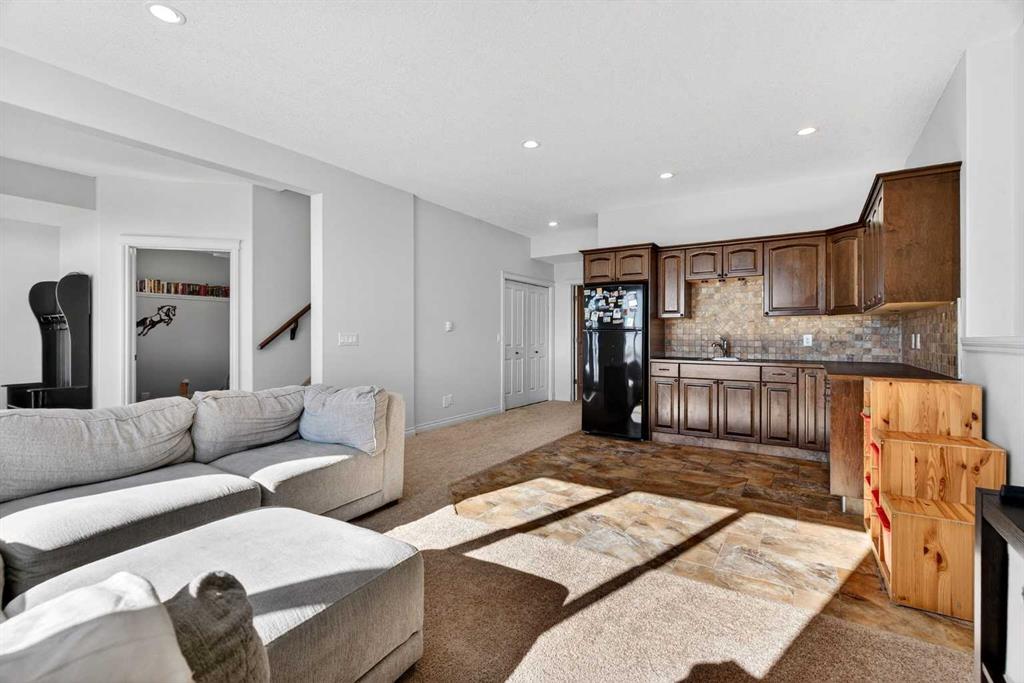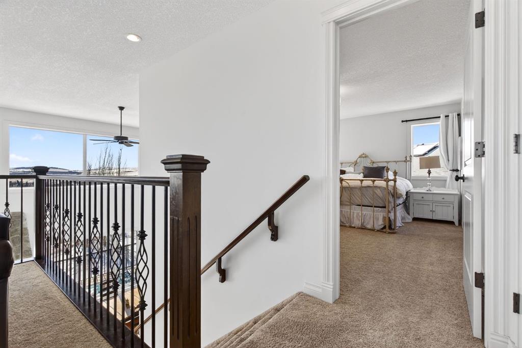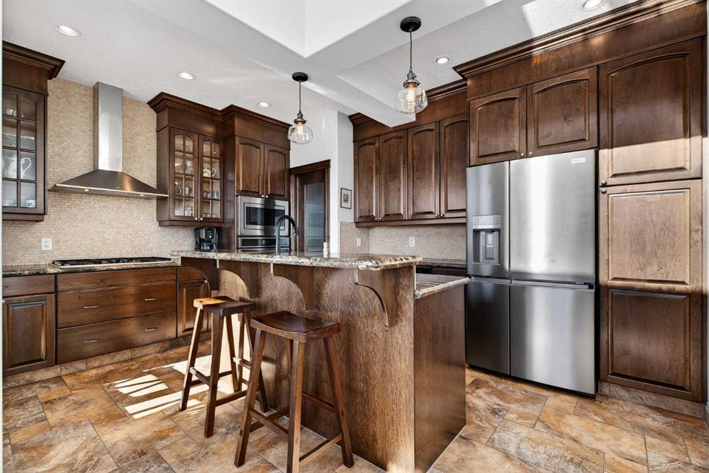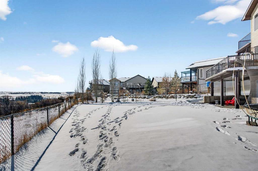 Perched on one of Diamond Valley’s most sought-after pie-shaped lots, 609 Sunrise Close is a true custom walkout with uninterrupted south-facing views and over 3000 sq ft of fully developed living space. From the moment you arrive, the curb appeal sets the tone. Step up to the front entry and into a home where scale and light immediately take over; soaring ceiling heights, expansive windows, and a main level designed to capture every ounce of that southern exposure. The layout was built for real life. A bright front office offers privacy for work-from-home days. A formal dining room anchors family gatherings. The double-vaulted family room, centred around a custom gas fireplace, feels both grand and inviting. At the heart of it all is a kitchen built to perform, featuring granite countertops, travertine backsplash, stainless steel appliances, a 36” gas cooktop, built-in wall oven, raised eating bar, and a walk-through pantry connecting seamlessly to the mudroom and oversized double garage. Open the doors off the breakfast nook and step onto the upper deck, indoor-outdoor living with views for days. Upstairs, the primary suite is a true retreat. Wake up to south-facing views, enjoy a private sitting area and balcony, and unwind in the impressive ensuite featuring dual vanities, a jetted tub, and a custom tiled two-person shower. The oversized walk-in closet with built-in shelving completes the space. Two additional bedrooms and a full bath offer comfortable space for family, while the upper laundry keeps everyday living practical. The loft-style bonus room is a standout feature. Overlooking the main living area below, it maintains an open architectural feel while still functioning as a separate retreat. Thoughtfully placed upper windows were designed to capture those same sweeping south views, meaning even from your upstairs TV room, you’re connected to the landscape beyond. It’s a space that feels elevated, literally and visually, and adds another layer of flexibility to the home. The walkout basement opens up even more opportunity. With in-floor heat, two large additional bedrooms, a full bathroom, separate entrance, second laundry, and a kitchenette, the space is ideal for multi-generational living, a nanny suite, extended guests, or added privacy for older children. Bright, spacious, and functional, it doesn’t feel like a basement. Outside, the fully fenced 8,500 sq ft pie-shaped lot offers room to play, garden, entertain, and grow. The south exposure means long evenings, open skies, and uninterrupted views. There is dedicated space for a hot tub, already roughed in and waiting. An exposed aggregate driveway, central air conditioning, updated lighting, and fresh paint add to the long list of thoughtful upgrades throughout. Located in one of Diamond Valley’s most desirable neighbourhoods, you’re surrounded by walking paths, schools, and the small-town lifestyle so many are searching for, all while enjoying the space, privacy and views!
